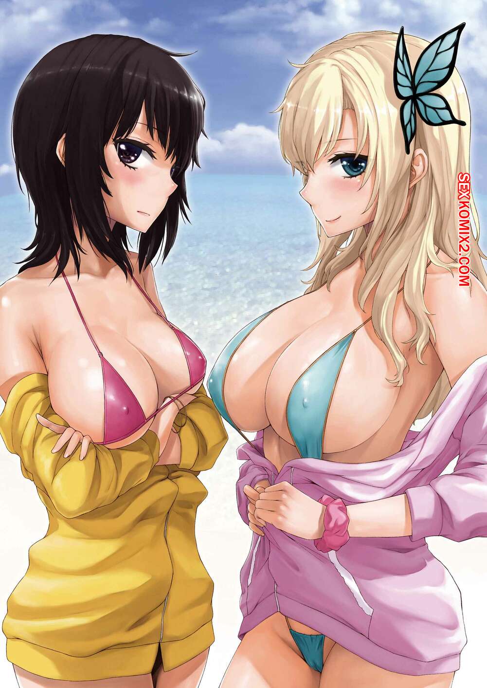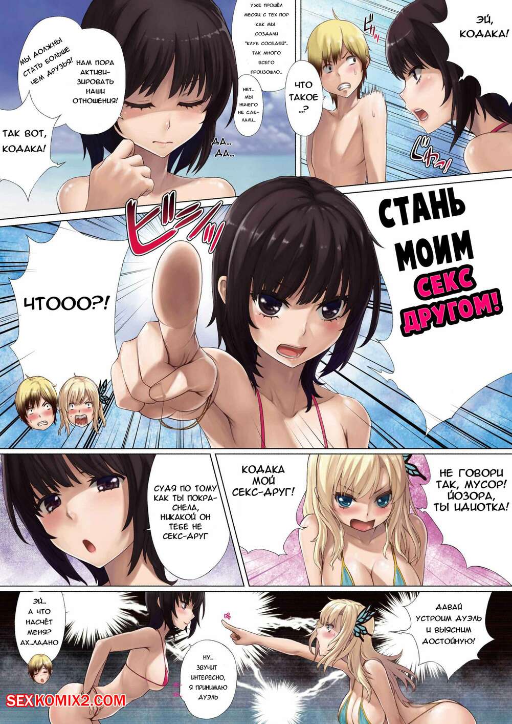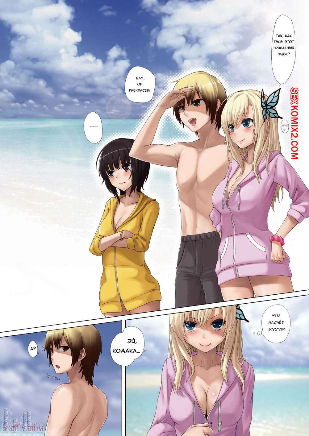 Порно комикс Горячий секс с двумя подружками. Boku wa Tomodachi ga Sukunai. Две горячие сисястые красотки решили повеселиться с дружком на пляже. Они разделись перед ним и стали сосать его большой хуй, после чего он их обеих хорошенько выебал.