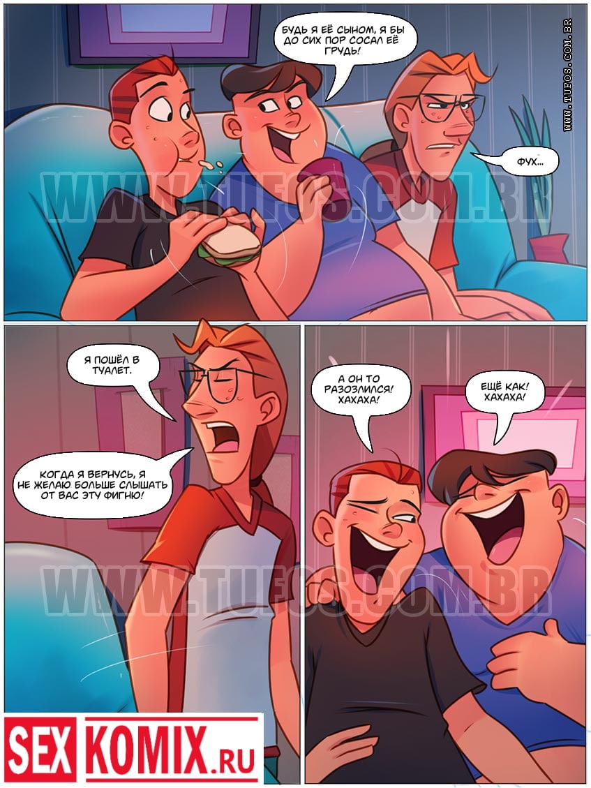 Порно комикс Похотливая семейка. Часть 69. Друзья сына. К парню в гости пришли его друзья, чтобы поиграть в видеоигру, они так долго играли, что проголодались. И его мать приготовила всем покушать, она одела коротенькие шортики и топ прямо поверх своей большой груди, и соски торчали, а задница выпирала наружу. Когда она пришла в комнату к парням и принесла еду. Друзья её сына очень сильно возбудились при виде такой сочной женщины, и захотели трахнуть её. После того как она ушла обратно на кухню, возбужденные парни последовали за ней и предложили заняться сексом. Женщине давно не предлагали секс молодые парни и она с удовольствием согласилась.