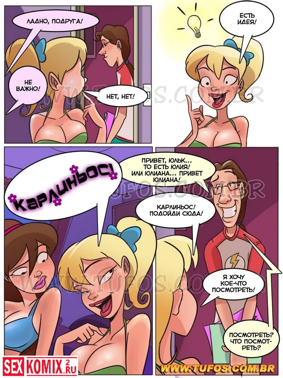 Порно комикс Похотливая семейка. Часть 5. Урок подруги. На этот раз все начинается с того, что Анина плачется подружке по поводу того, как ее бойфренд в последние дни мало уделяет ей времени. Он стал редко звонить и навещать ее. Тогда лучшая подруга решает научить её абсолютно идеальному минету, который обязательно помог бы ей вернуть расположение любимого парня. Но для этого нужен член, и как раз к стати оказывается её брат. Девушки заманили беднягу к себе в комнату, сняли с него штаны и начали изучать минет на его огромном члене.