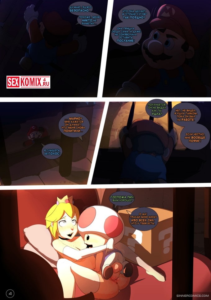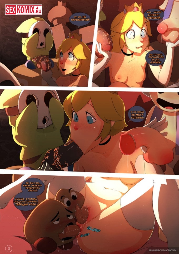 Порно комикс Марио. Принцесса Персик. Мир Марио очень богат приключенческим историями, и в этой развратной истории вы увидите, как принцесса, уже нынешняя жена Марио поздно ночью, когда он лёг спать тихонечко встала и пошла к своим волшебным друзьям. Грибочка, с которыми она хотела заняться сексом, они не могли отказать, они были влюблены в неё. Во время оргии Марио проснулся, и застал свою жену, но ему это очень понравилось. Вместо того, чтобы остановить её он тихонечко дрочил в сторонке.