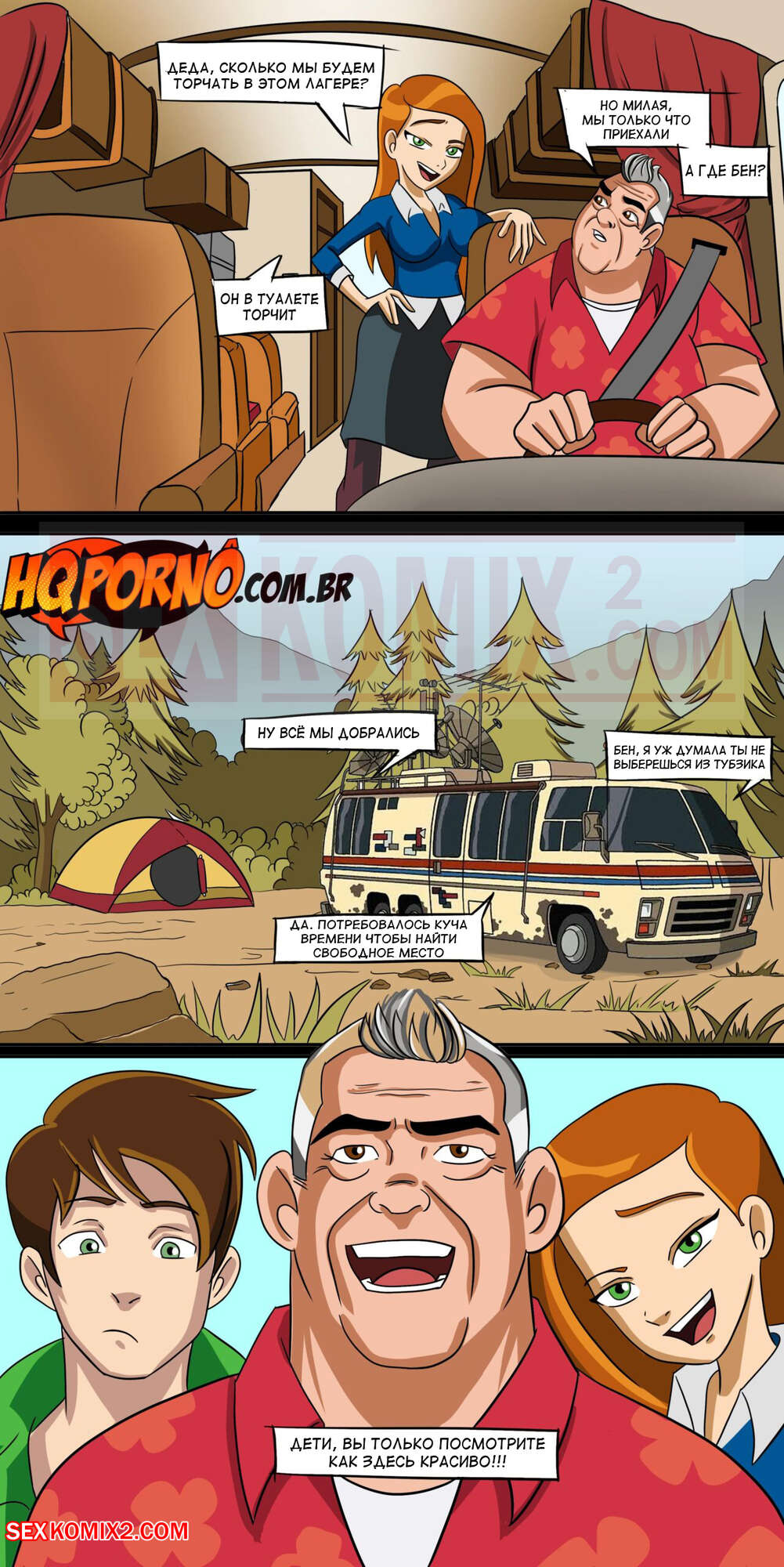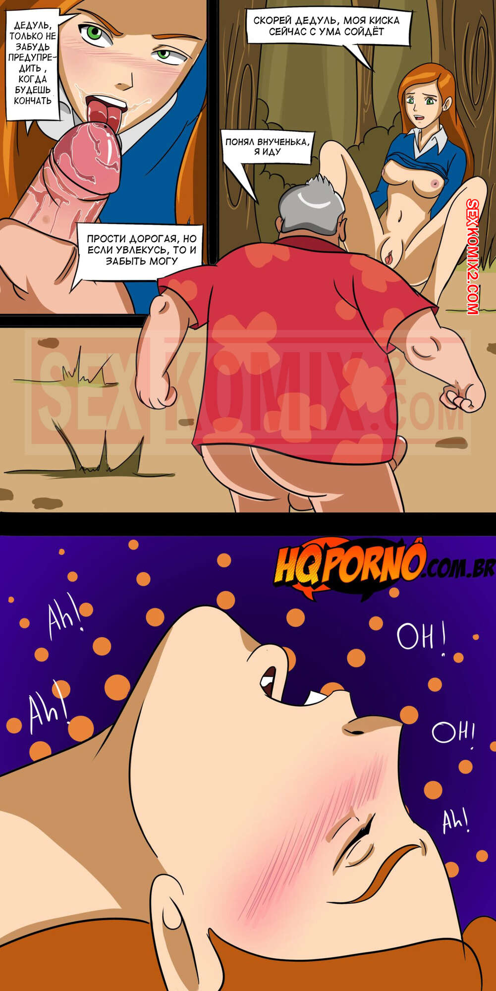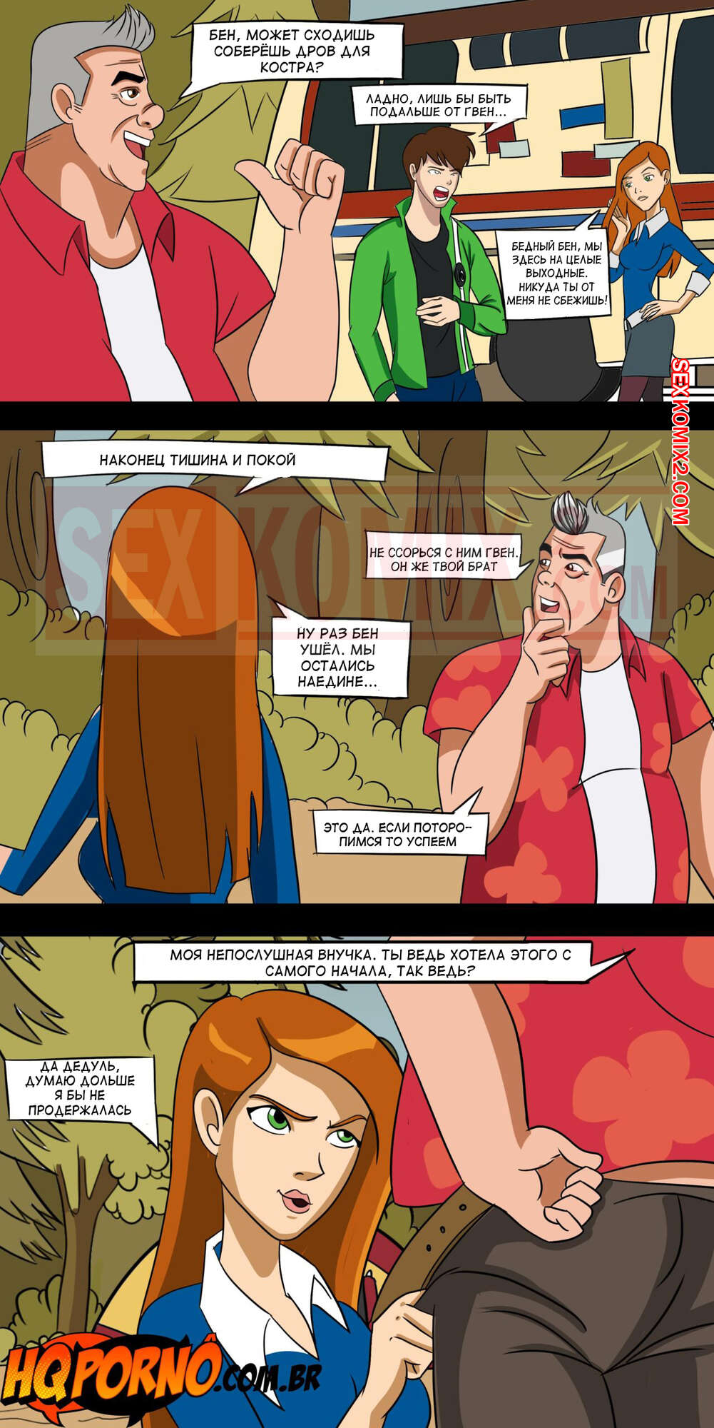 Порно комикс Бен 10. Начало шлюхи в семье. Часть 1. HQPorno. TZComiX Молодая горячая красотка брюнетка была очень возбуждена и решила повеселиться со своим дедушкой в лесу. Она разделась и стала сосать его большой хуй, после чего к ним присоединился Бен в облике монстр, чтобы устроить девушке двойное проникновение.