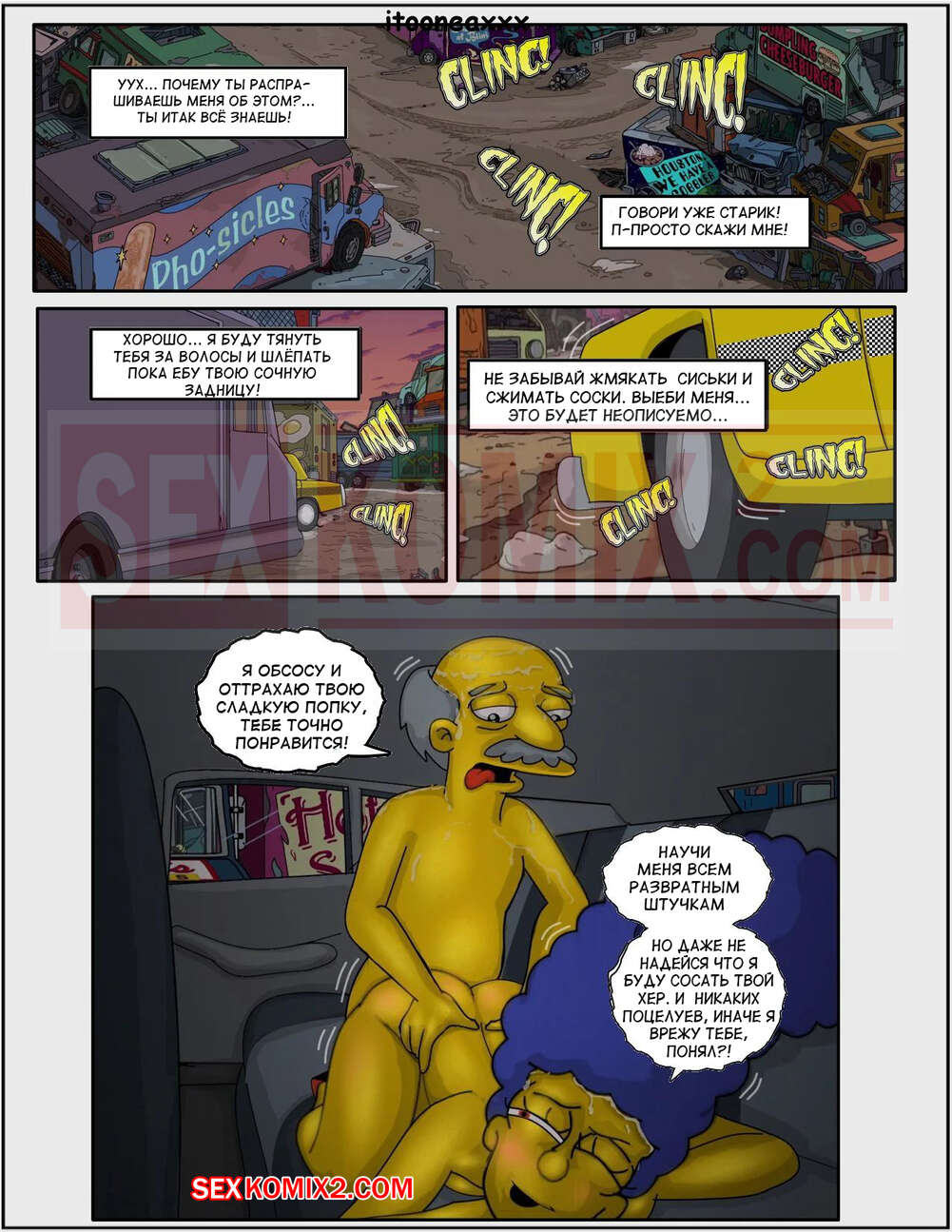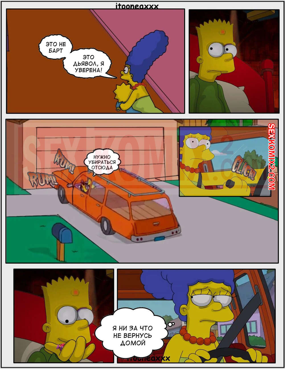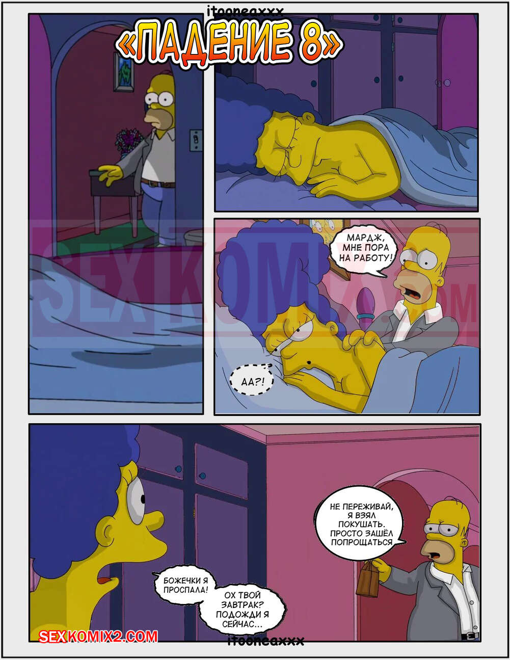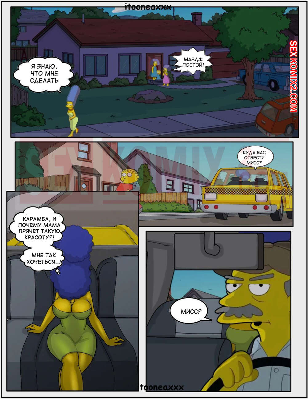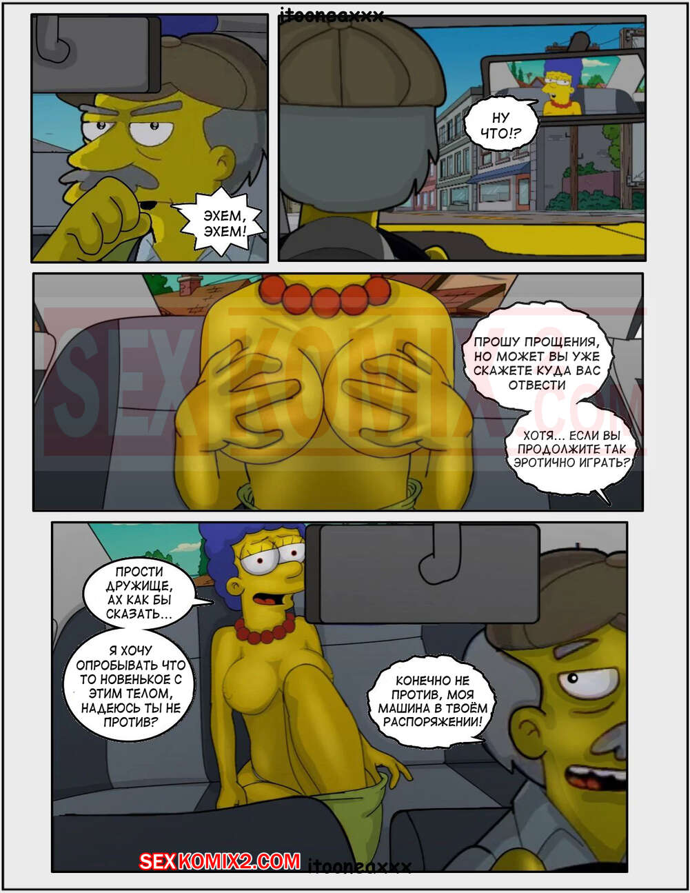 Порно комикс Симпсоны. Часть 10. Падение Часть 8. Simpsons. Oedipus. IToonEAXXX Сисястая милфа Мардж ехала в такси и очень возбудилась. Она разделась в машине и стала ласкать свою пизденку, после чего к ней присоединился таксист и хорошенько выебал сучку.