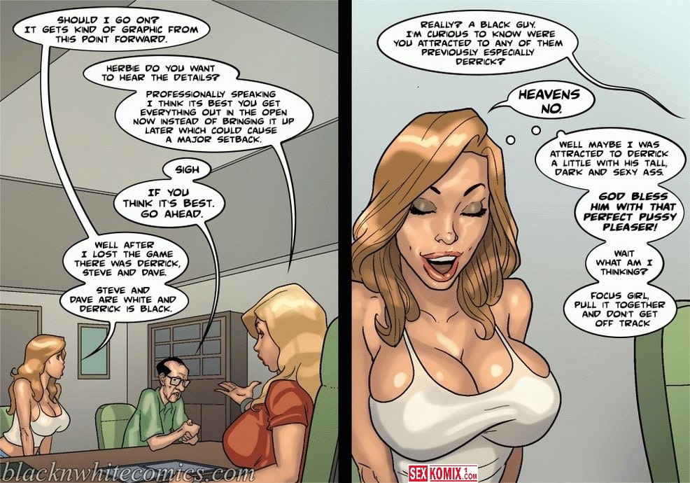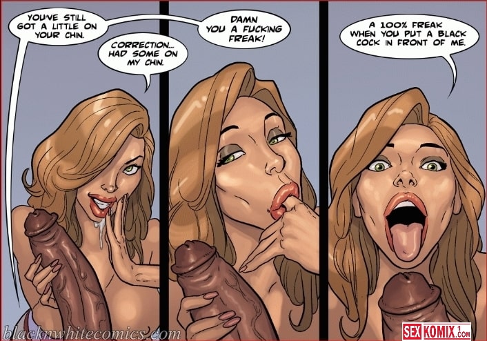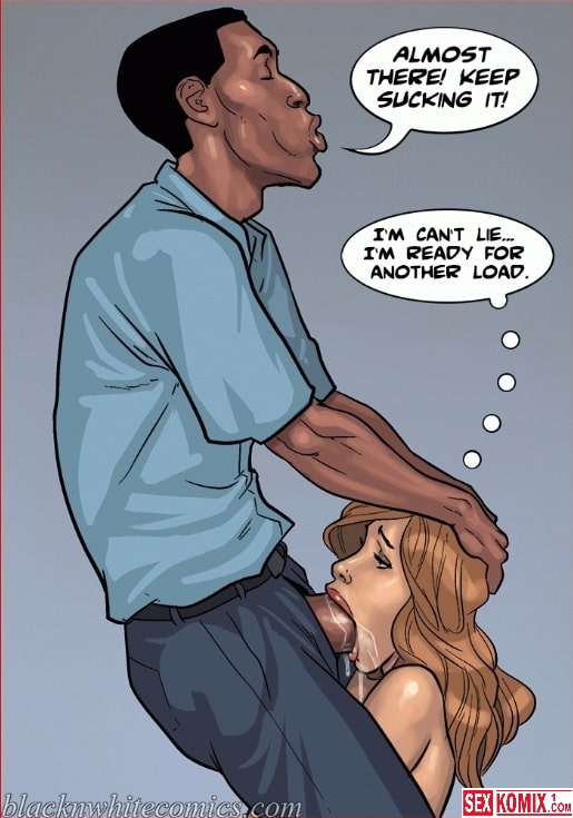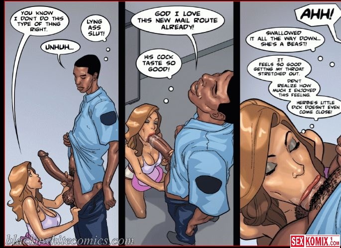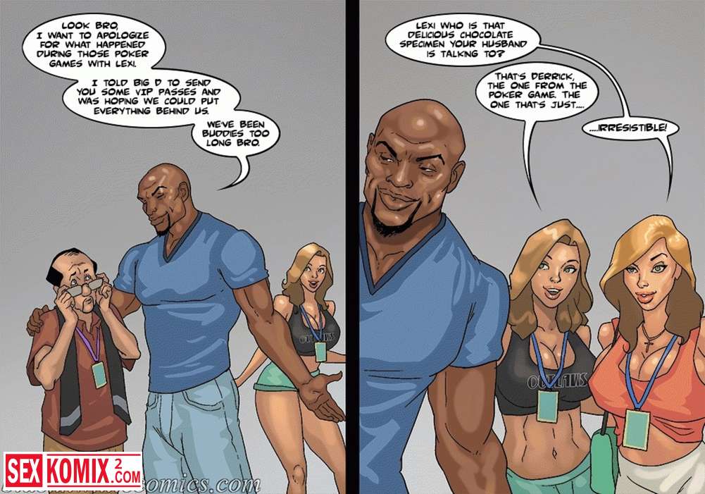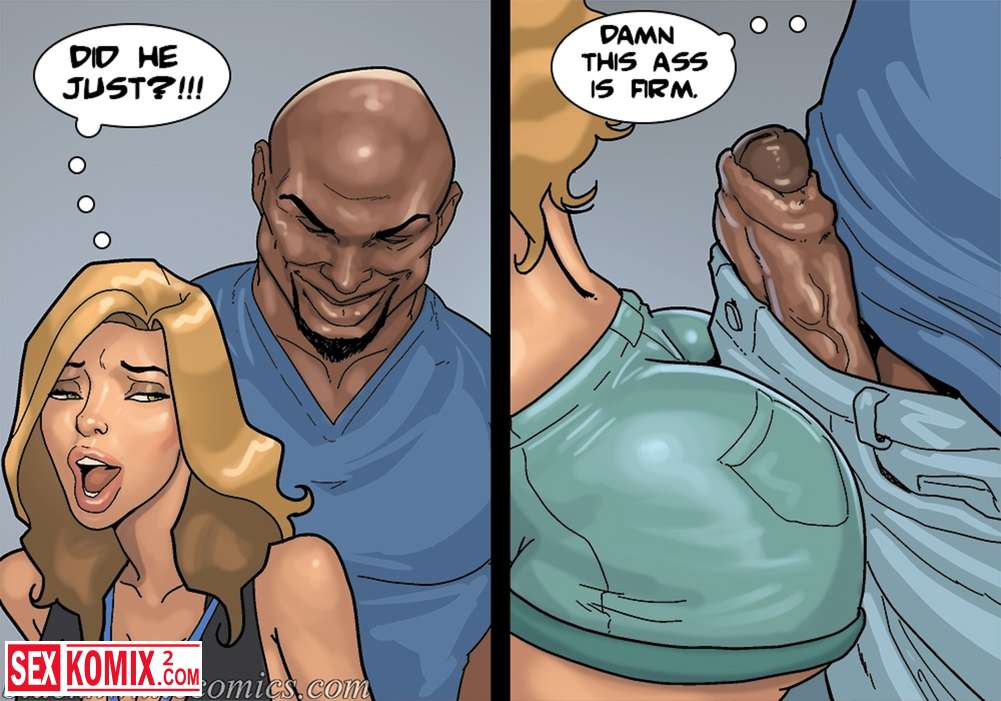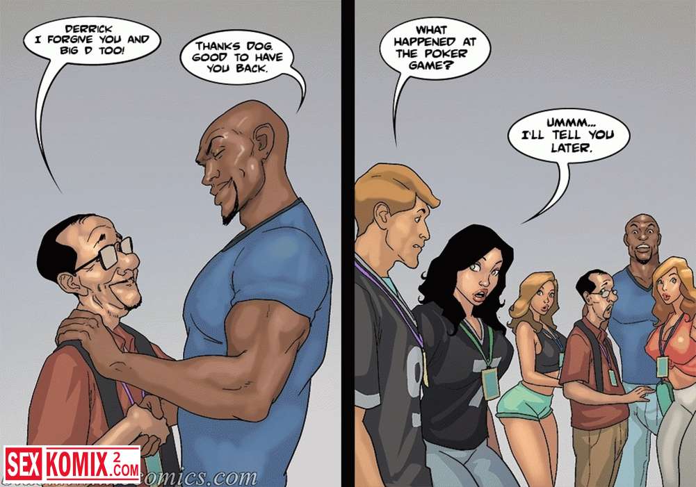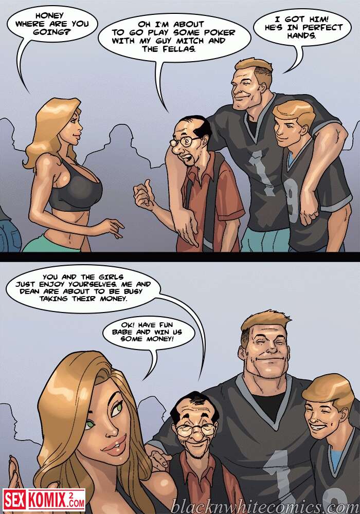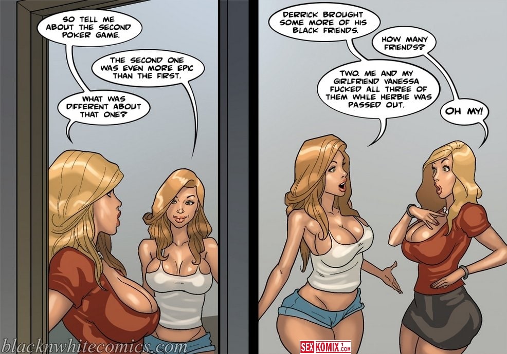 Обновлен. Порно комикс Игра в покер. Часть 3. Фулл хаус. Английский. Блондинка вошла во вкус, она уже не может без черных членов. Даже во снах ей снится как она изменяет своему мужу пока он лежит рядом. Утром чернокожий парень принес почту, и его красотка затащила в гараж и отсосал его огромный черный хуй. Муж чуть не застал их, но жена на этом не остановилась и всё-таки довела почтальона до оргазма и выпила всю его сперму.