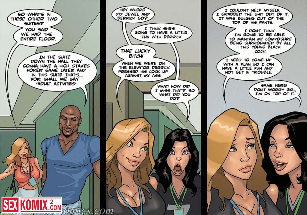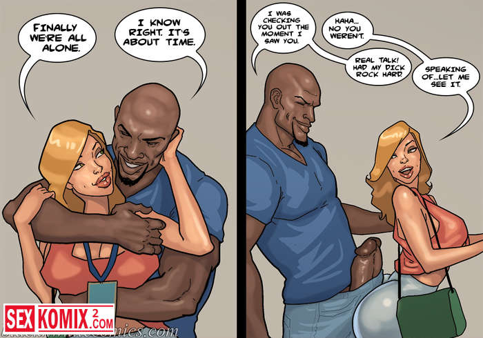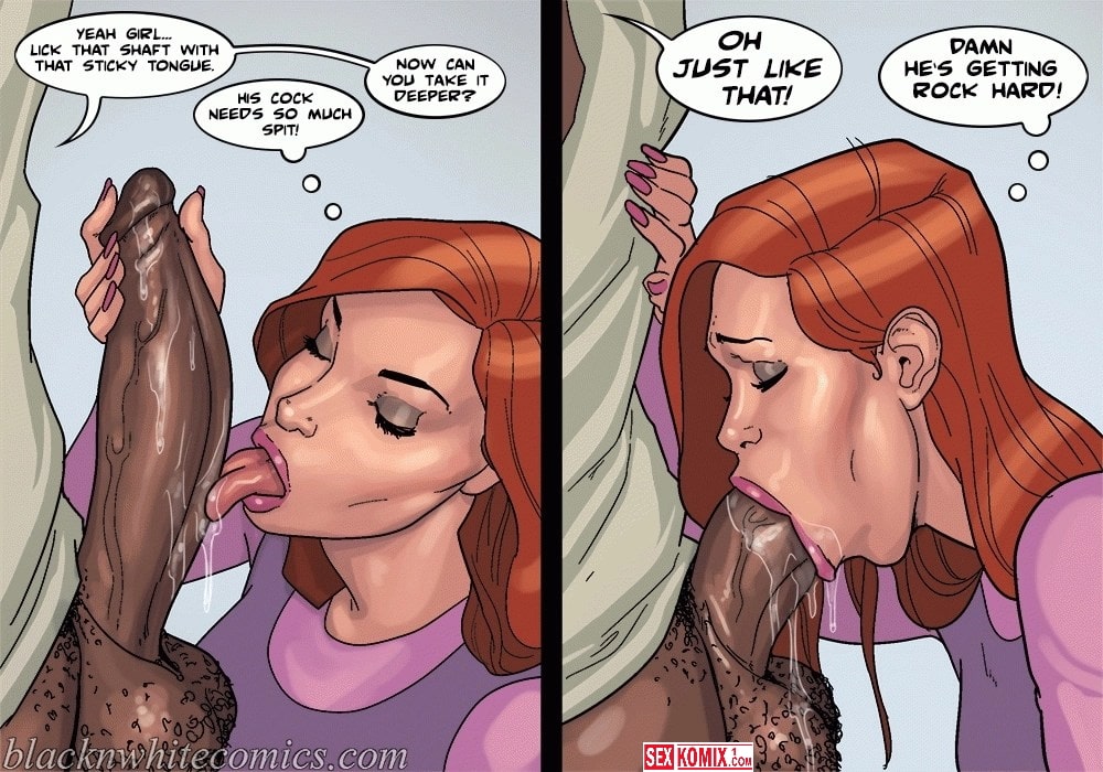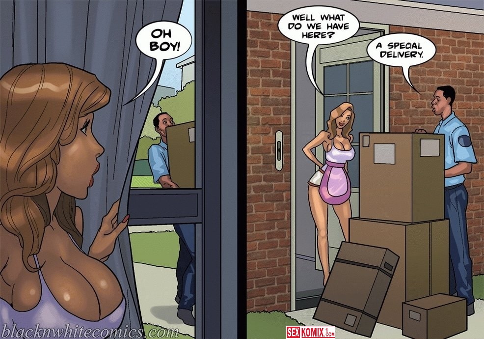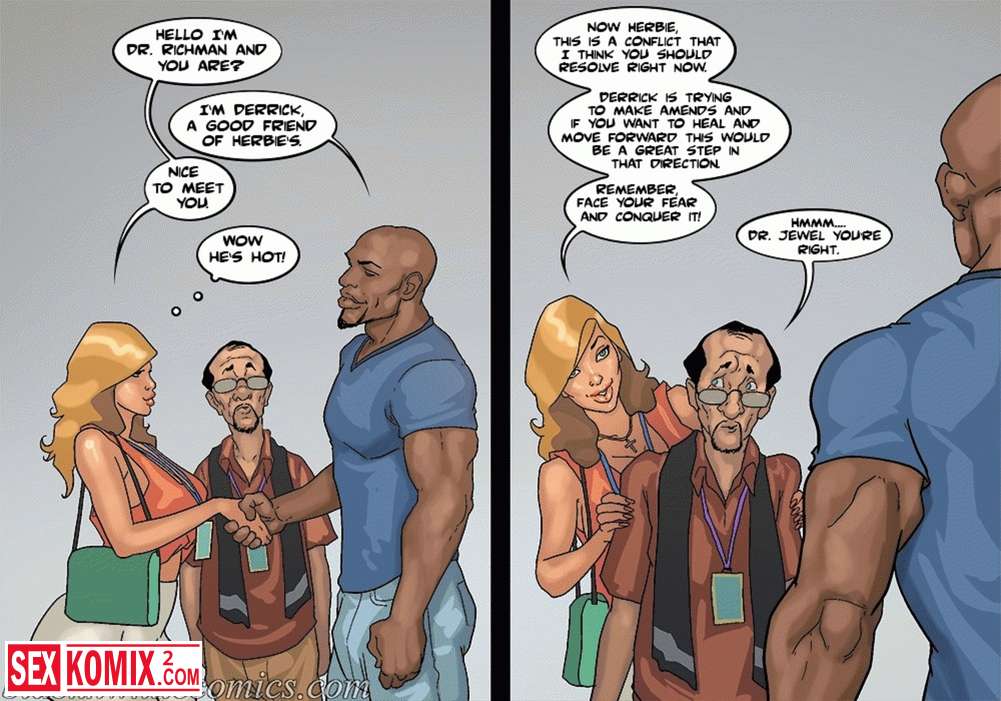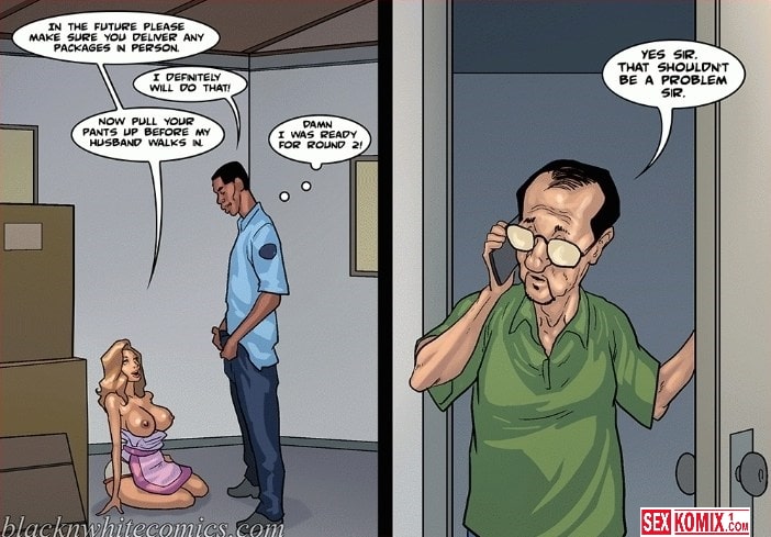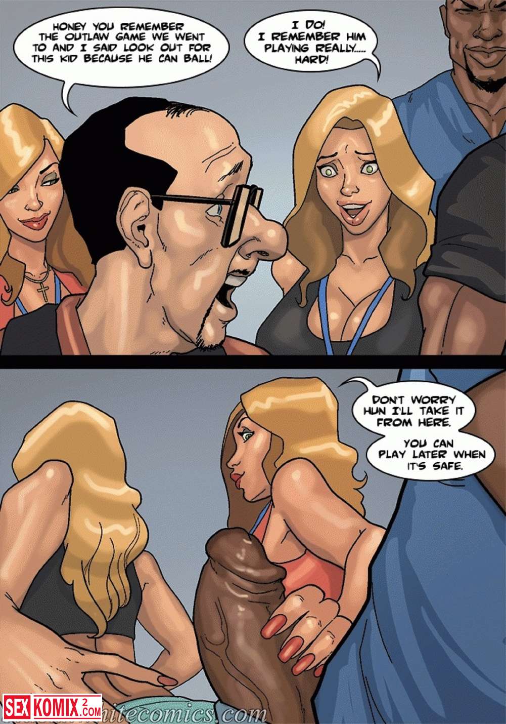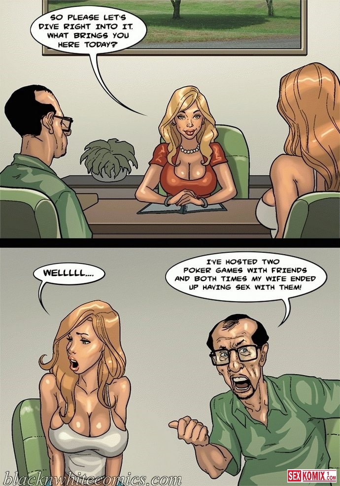 Обновлен. Порно комикс Игра в покер. Часть 3. Фулл хаус. Английский. Блондинка вошла во вкус, она уже не может без черных членов. Даже во снах ей снится как она изменяет своему мужу пока он лежит рядом. Утром чернокожий парень принес почту, и его красотка затащила в гараж и отсосал его огромный черный хуй. Муж чуть не застал их, но жена на этом не остановилась и всё-таки довела почтальона до оргазма и выпила всю его сперму.