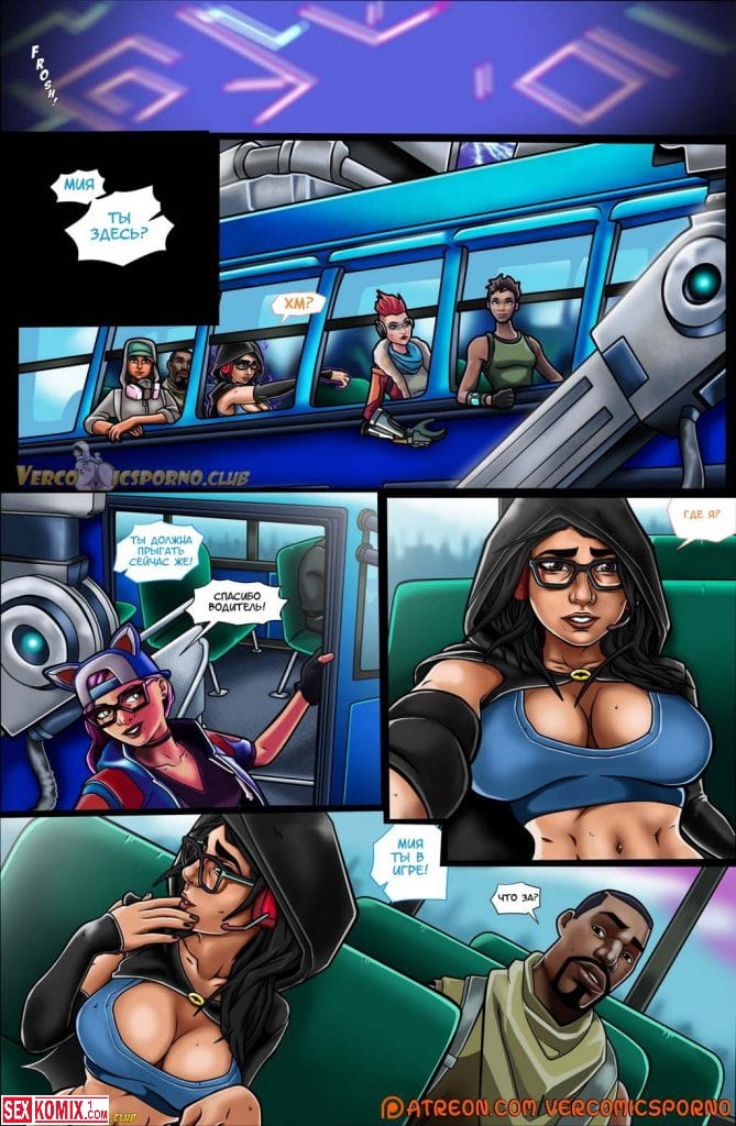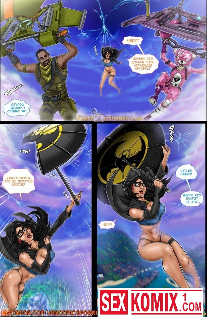 Порно комикс Фортнайт. Брюнетка попадает в игру и сразу попадает на опасную миссию. Она понимает, что в игре и соглашается на задание. После прыжка из самолёта команда девушки приземляется на острове, там их уже ждут преступники.