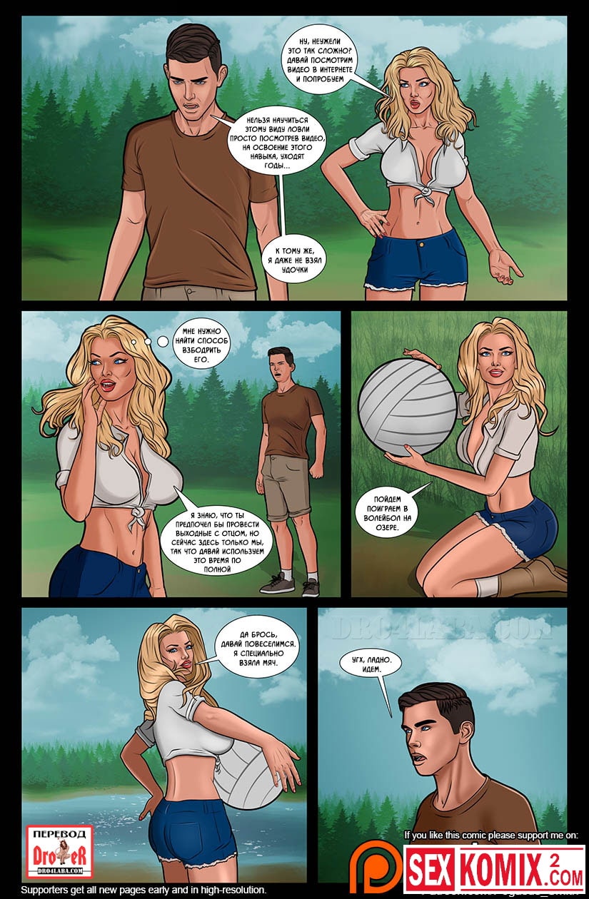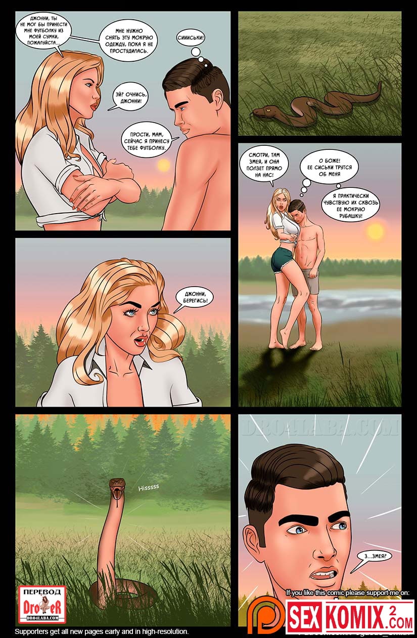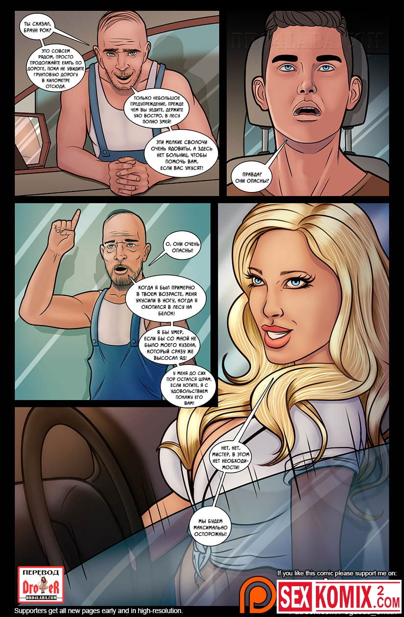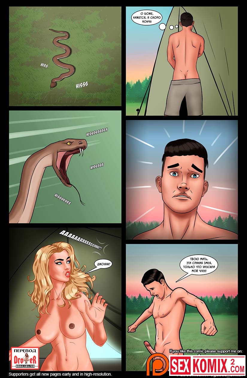 Порно комикс Заблудившиеся в лесу. Горячая блондинка отправилась в лес со свои парнем. Они играли в волейбол у озера. Игра была отличной, если бы не змея, которая пыталась укусить девушку. Парень прогнал её и красотка решила его отблагодарить за его подвиг.