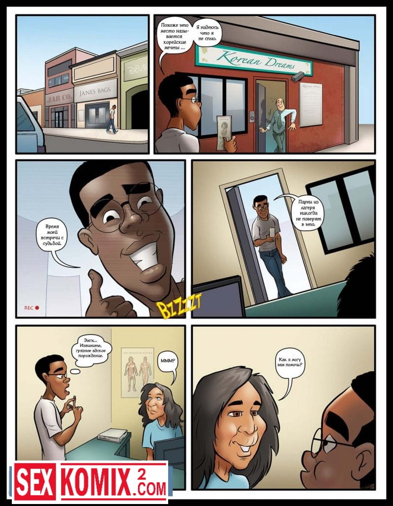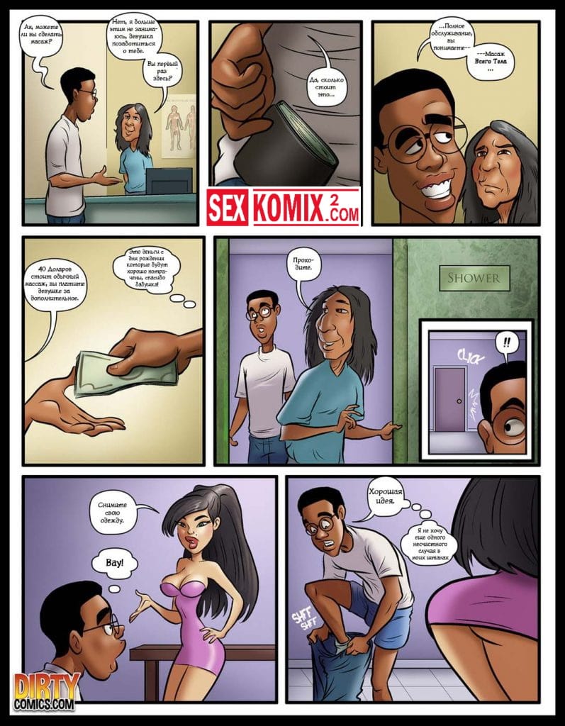 Порно комикс Счастливый конец. Чернокожий парень пошёл на массаж к азиатской девушке. Она разделась до гола и начала массировать его своим сексуальным телом. Парень на ожидал такого, член стоял как железный прут.