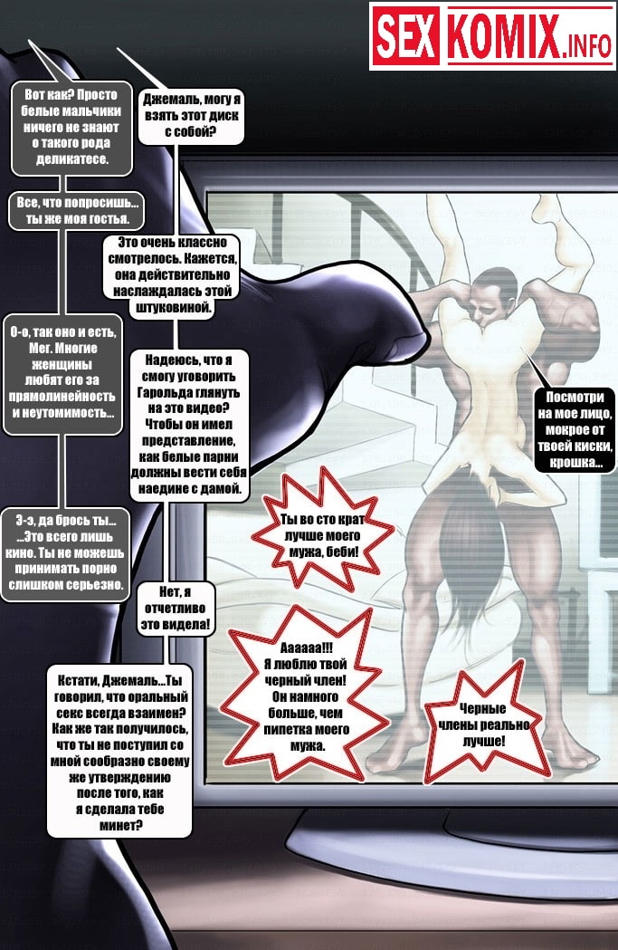 Порно комикс Уроки от соседа. Часть 2. Продолжение комикса для взрослых повествует о том, как Джемаль показывает сексуальной соседке новое видео урока по сексу, и девушка не в силах противостоять половому влечению захотела заглотить огромный член черного соседа, тот не возражал.