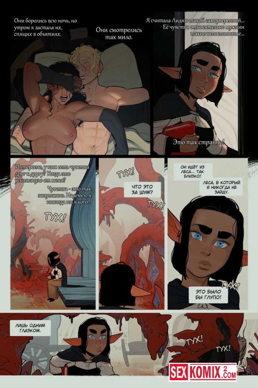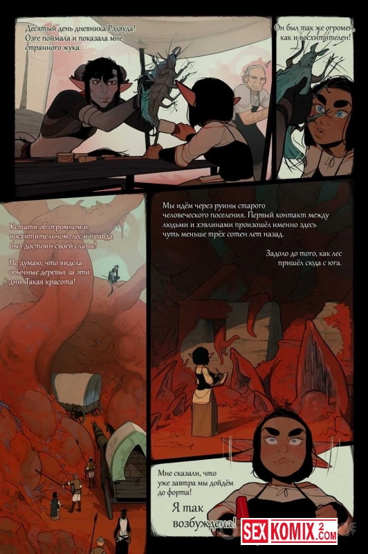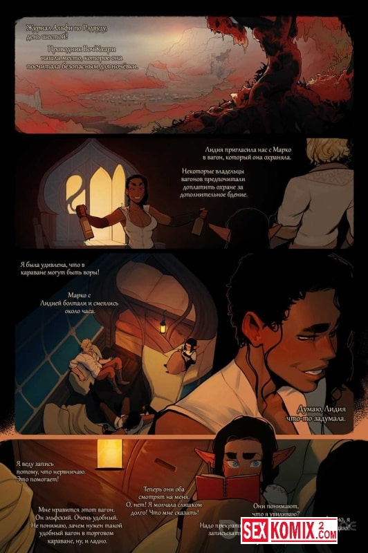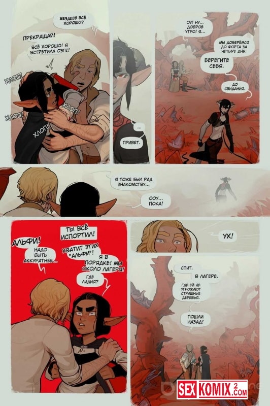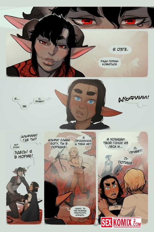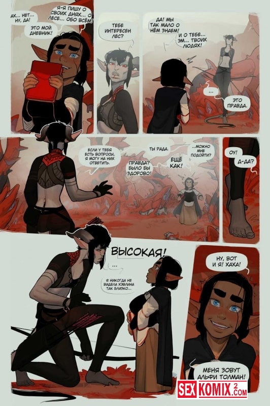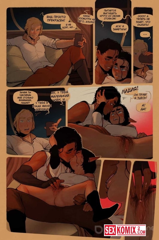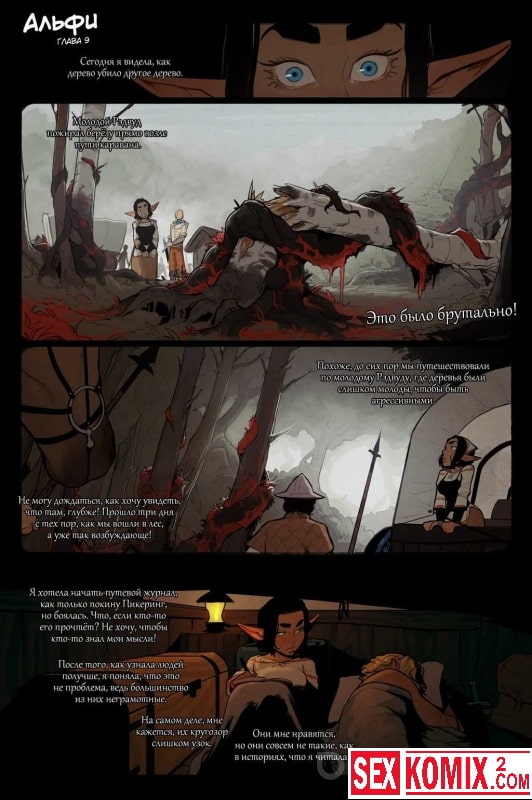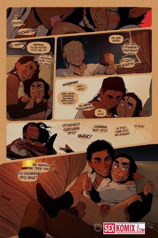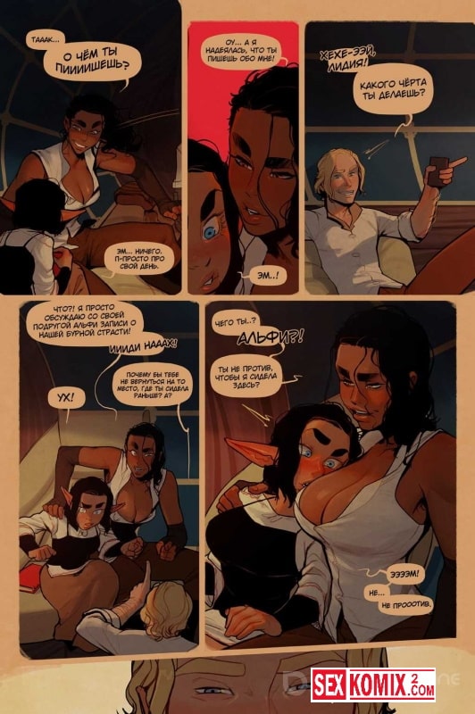 Порно комикс Альфи. Часть 9. Смелая эльфика продолжает свое путешествие по волшебному миру со своим другом. Они встречают сексуальную девушку война. Девушка проситься заночевать с ними и ночь соблазняет обоих. Всю ночь они занимаются горячим сексом и по утру их пути расходятся.