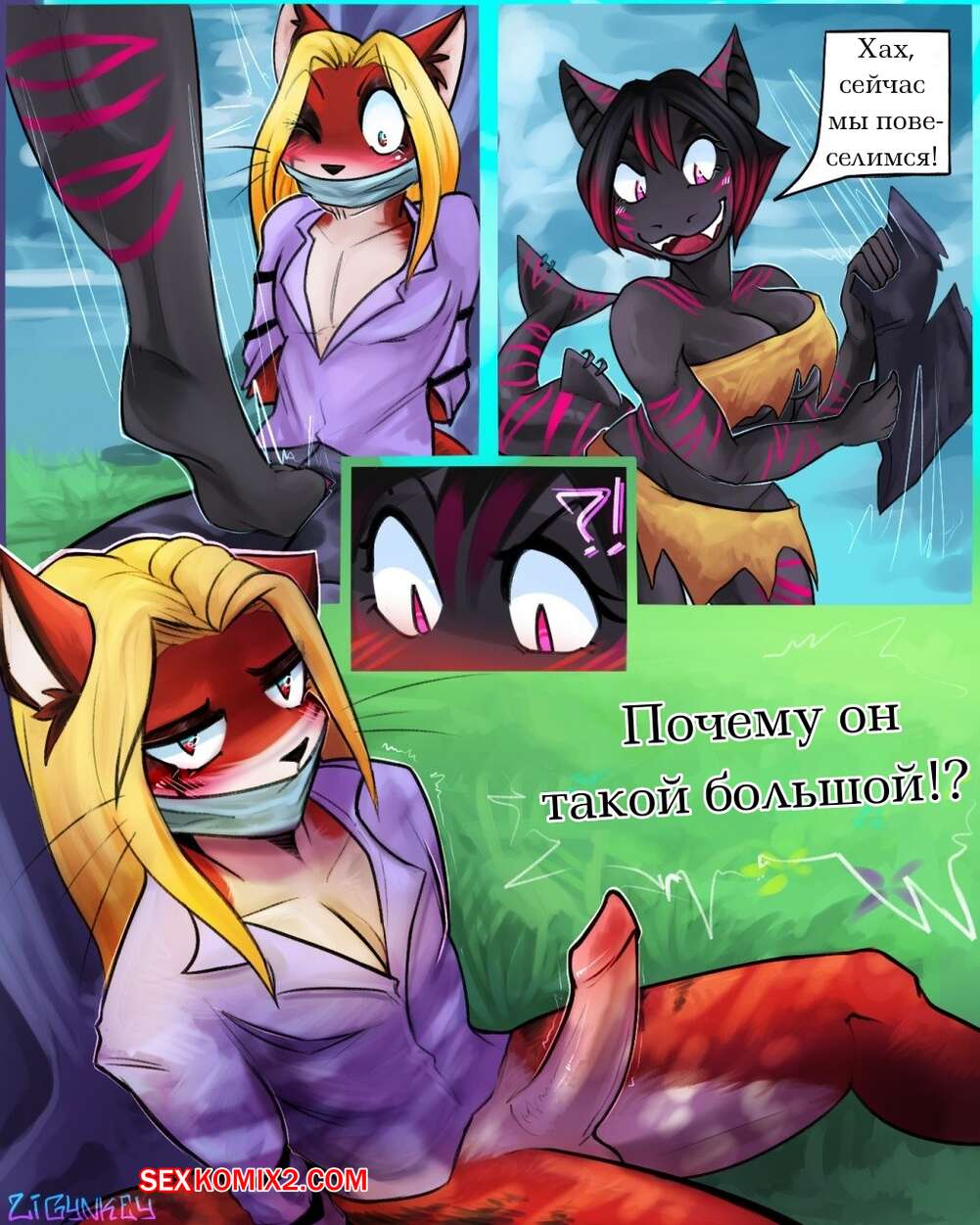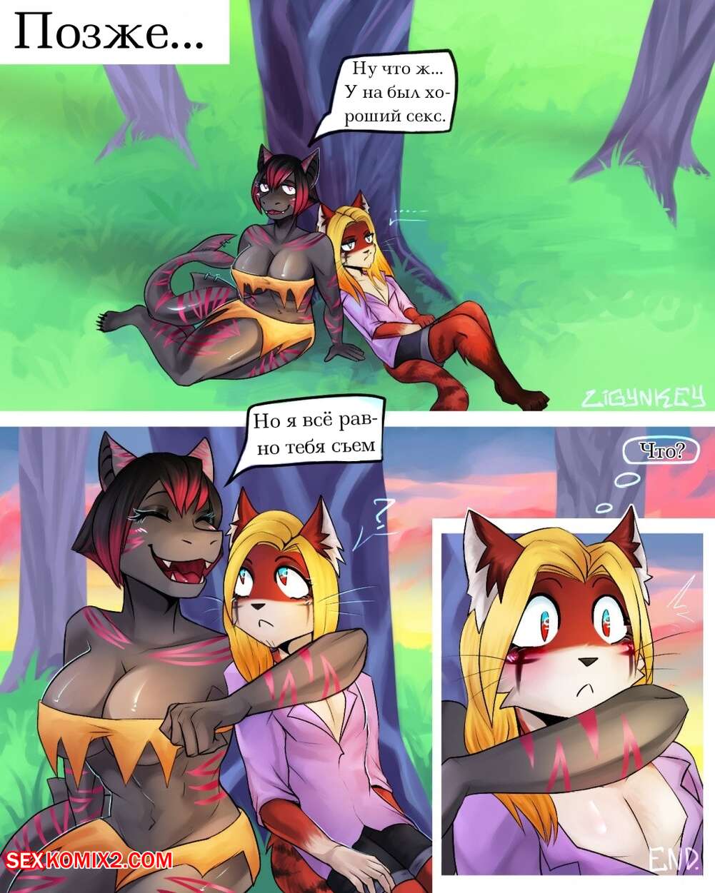 Порно комикс Фурри. Victim Горячая сисястая брюнетка застала в лесу парня под деревом и у него был большой стояк. Она стала сосать его большой хуй, после чего дала ему себя хорошенько выебать.