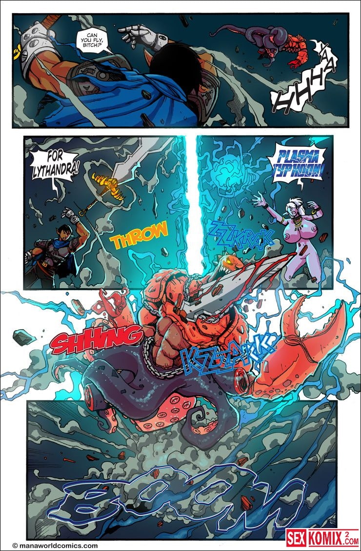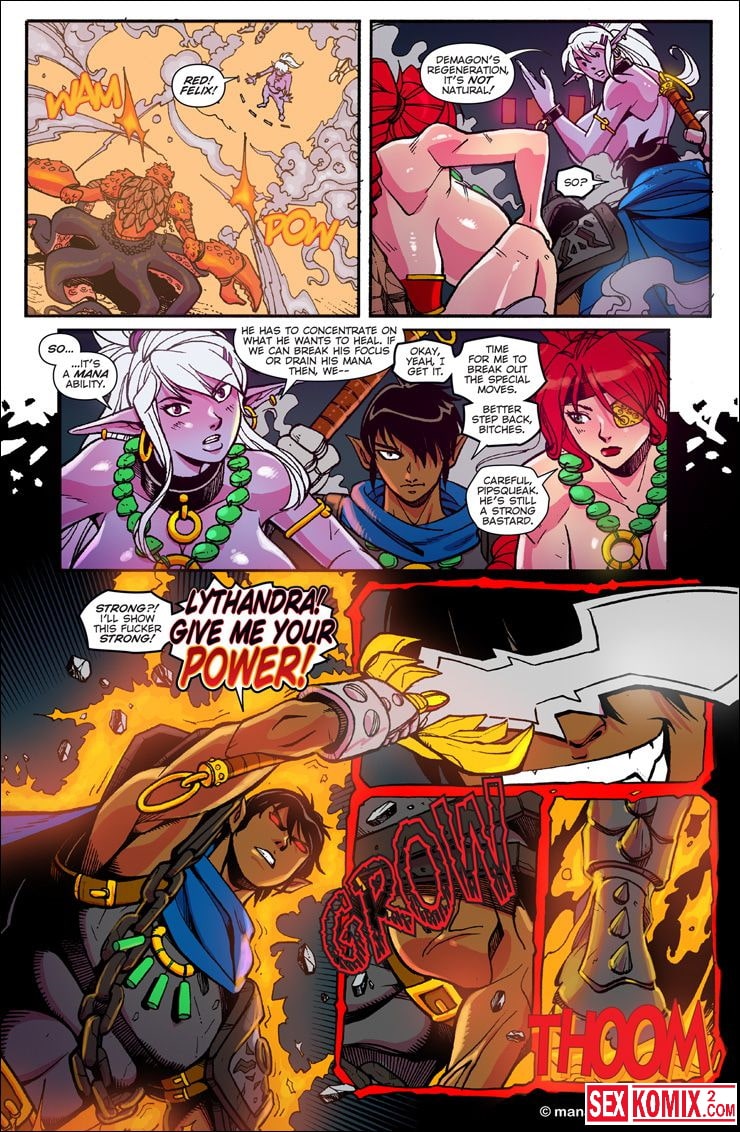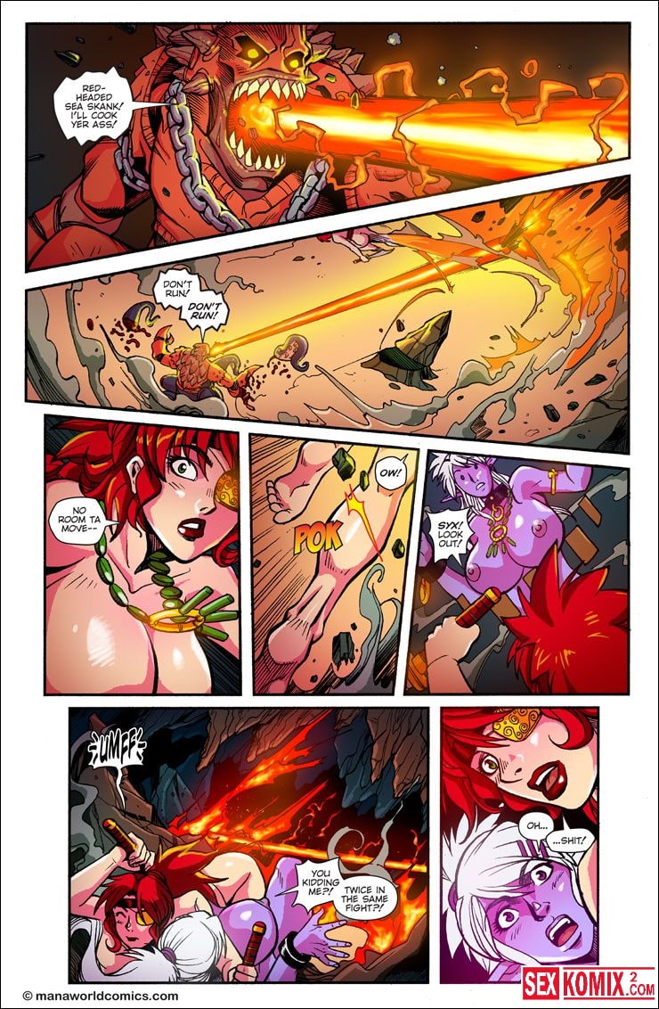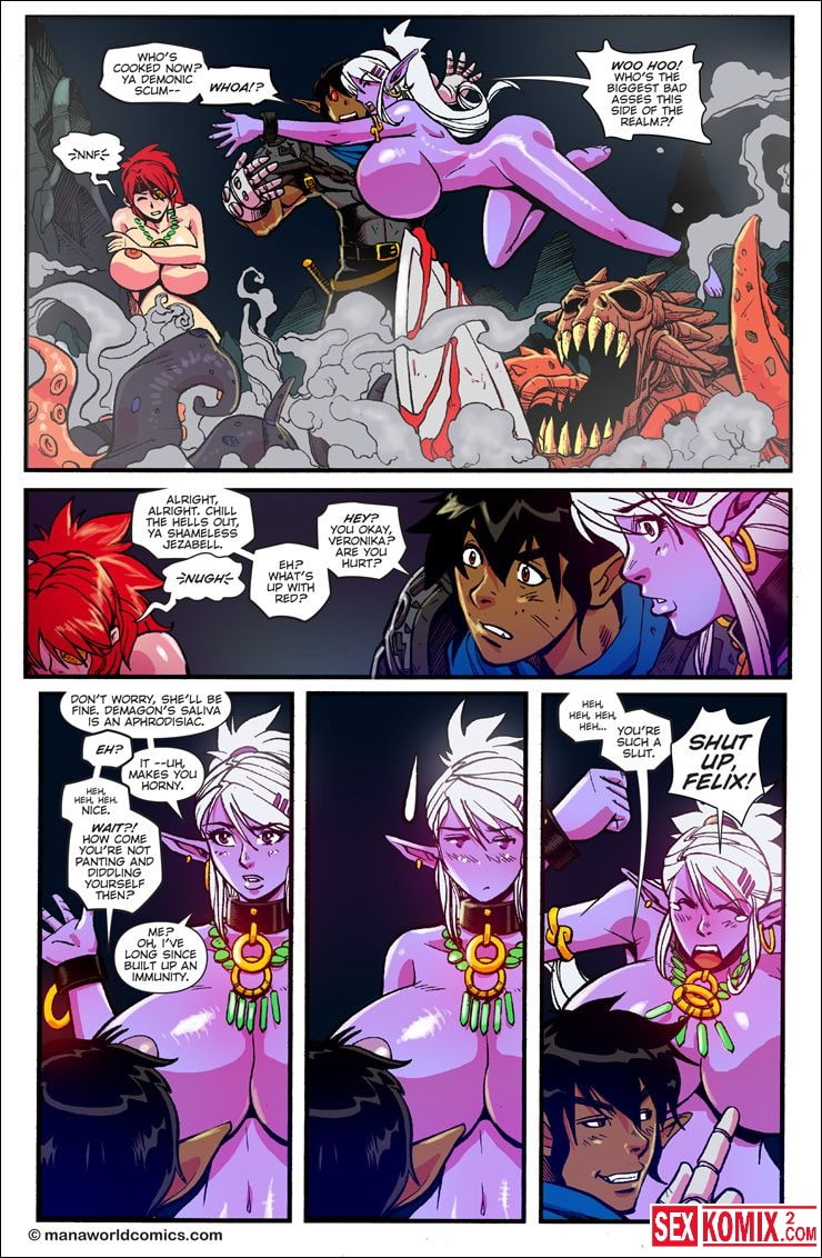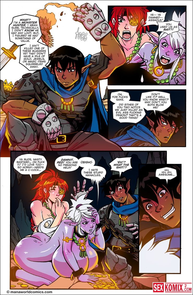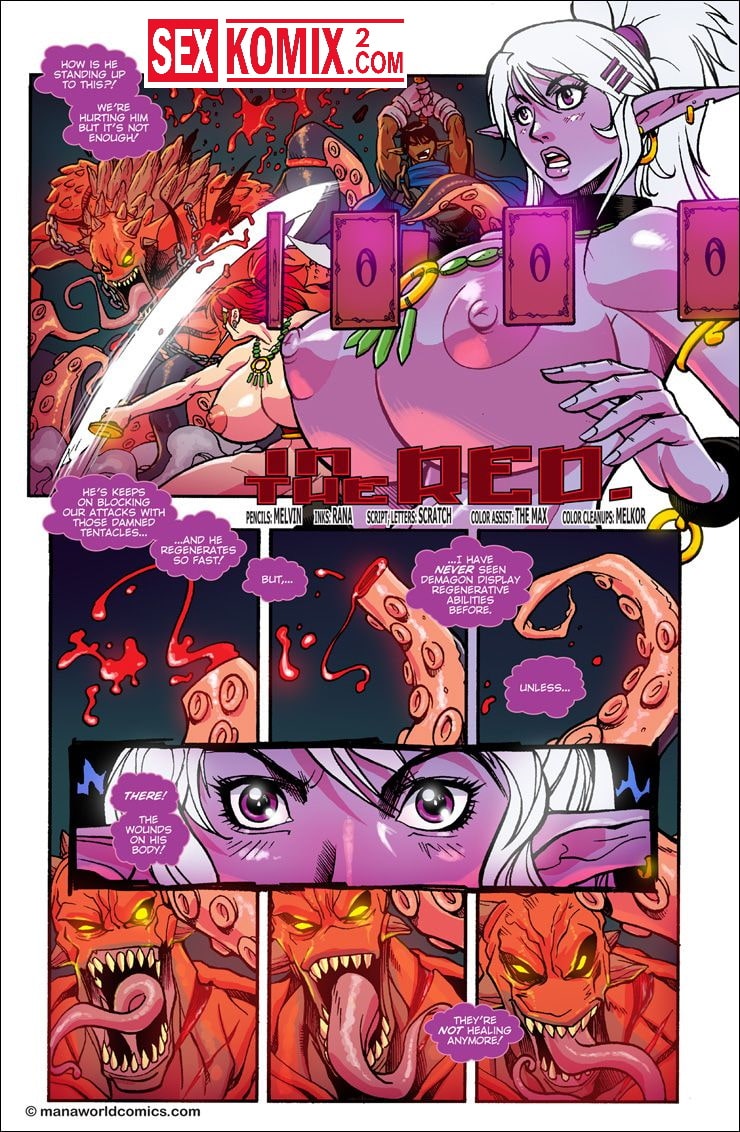 Порно комикс Mana World. Часть 12. В красном. Английский. Эта удивительная история о двух сексуальных красотках. Они боролись с монстром, и когда они не справлялись – к ним на помощь пришел симпатичный парень. Он был сильным и красивым. После того как чудовище было побеждено, девушки решили отблагодарить его жарким сексом. Он трахал сразу их двоих.