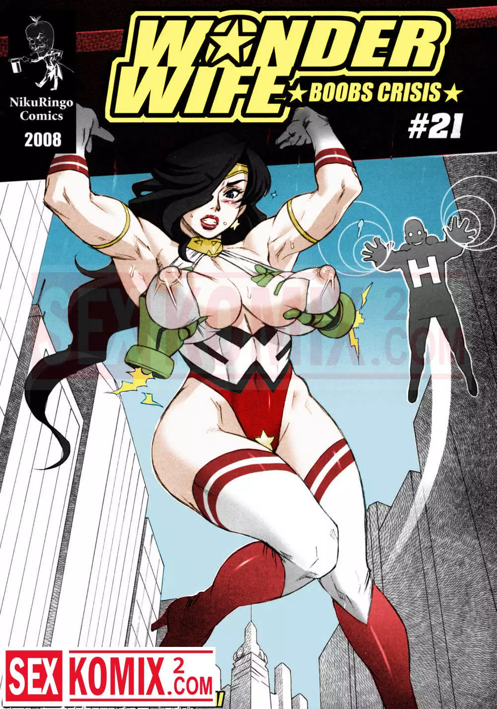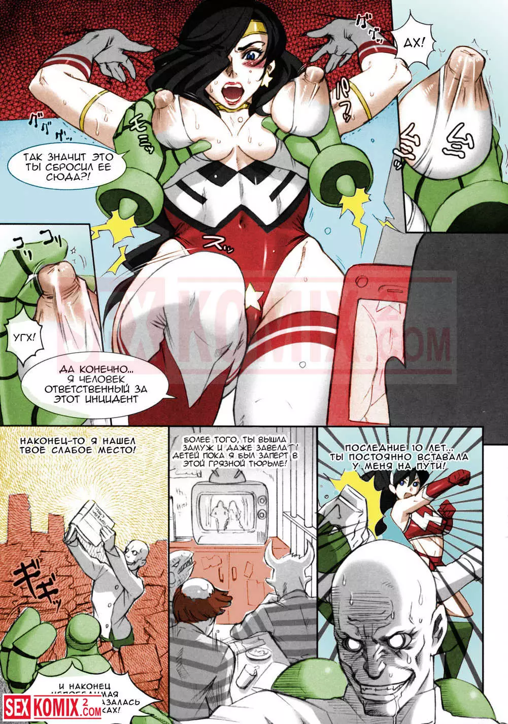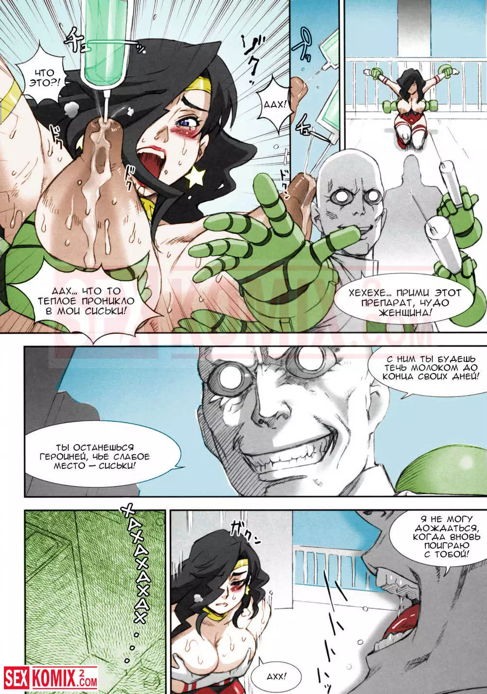 Порно комикс Чудо жена. Кризис сисек. В городе появился новый злодей и чудо женщина сразилась с ним, но он знал о её слабом месте. Он схватил брюнетку за сиськи и сильно их сжал, она тут же потеряла свои сверх способности.