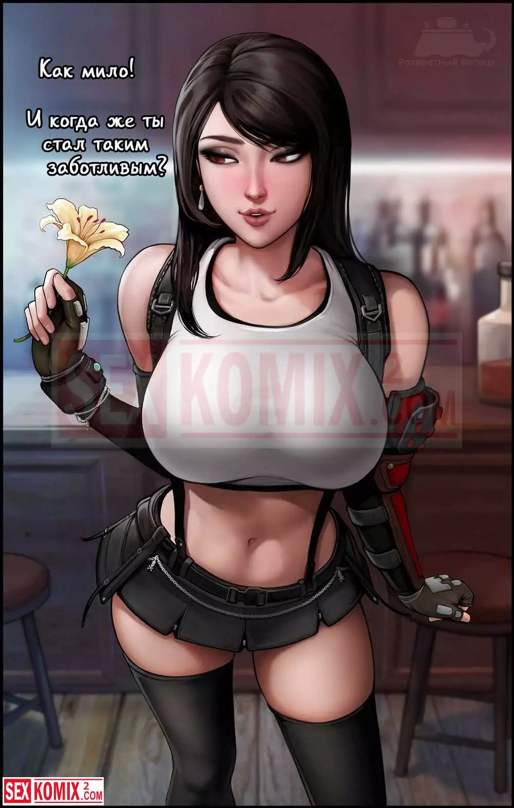 Порно комикс Тифа. Горячая брюнетка с большими сиськами и длинными ногами благодарит своего парня за цветы. Она делает минет и даёт себя трахнуть.