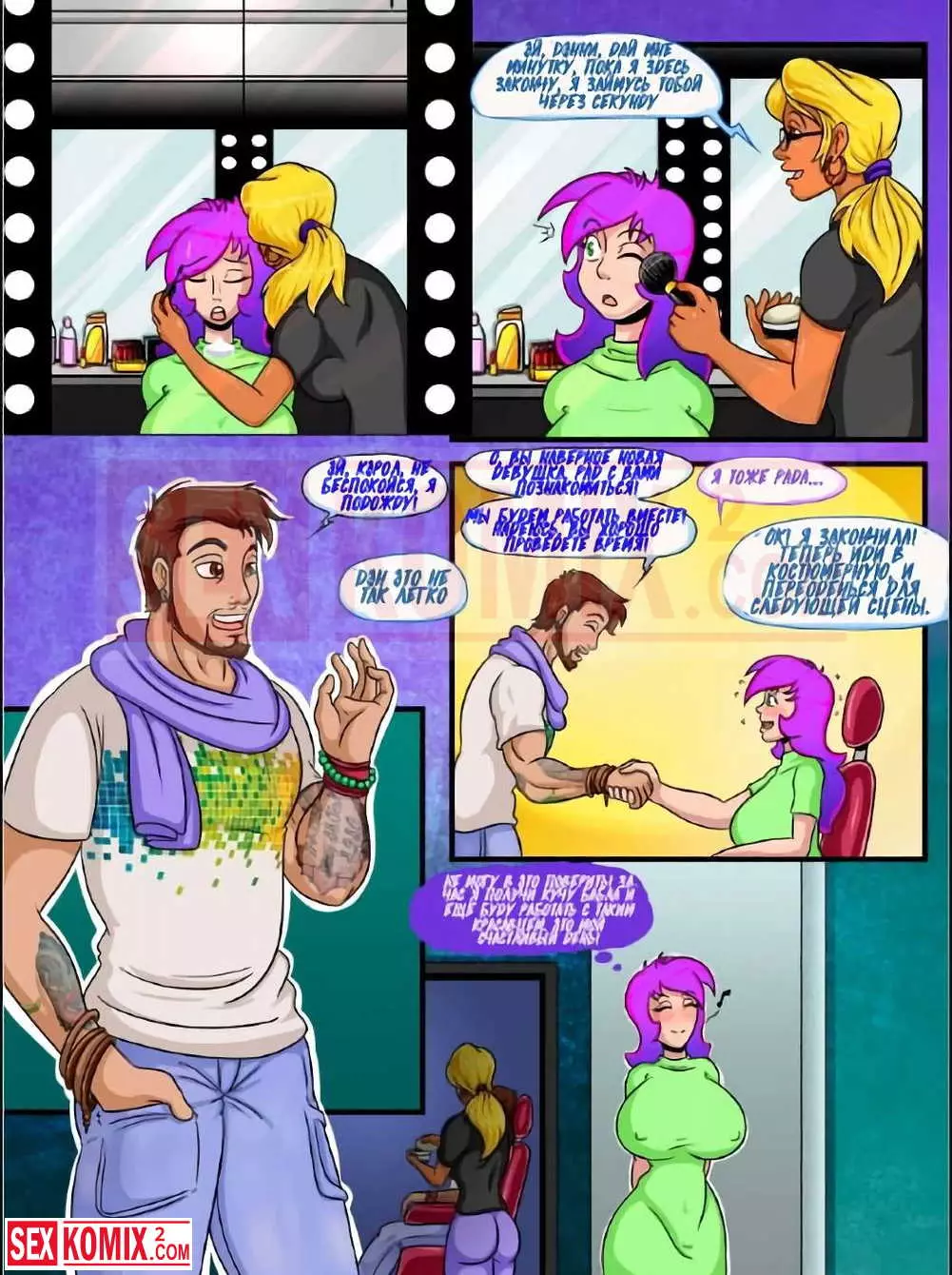 Порно комикс Тёмные дыры. Симпатичная девушка пришла на съемки фильма, она главная актриса. Но когда началась съемку красотка поняла, что это порно фильм и режиссер попросил показать её большие сиськи.