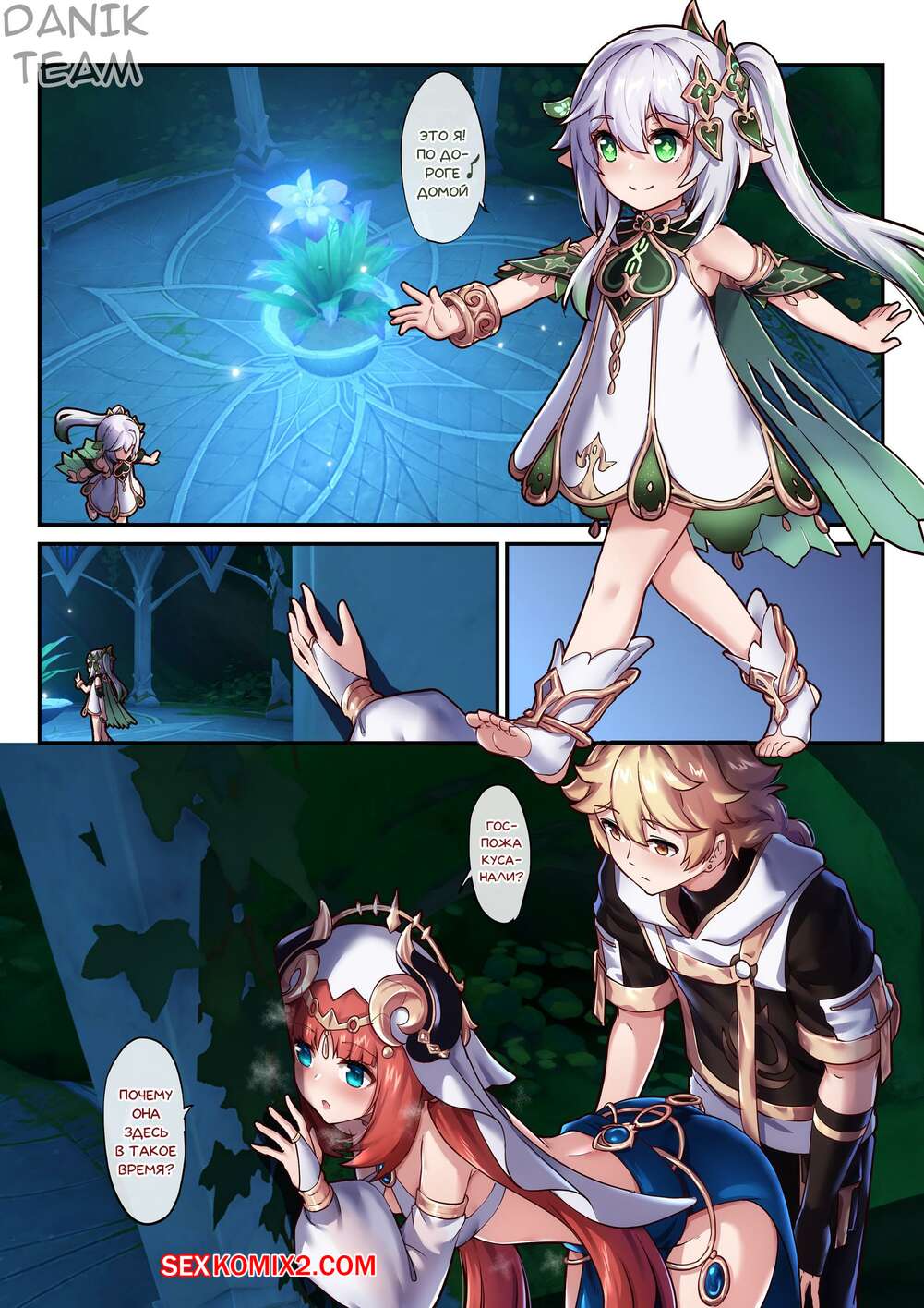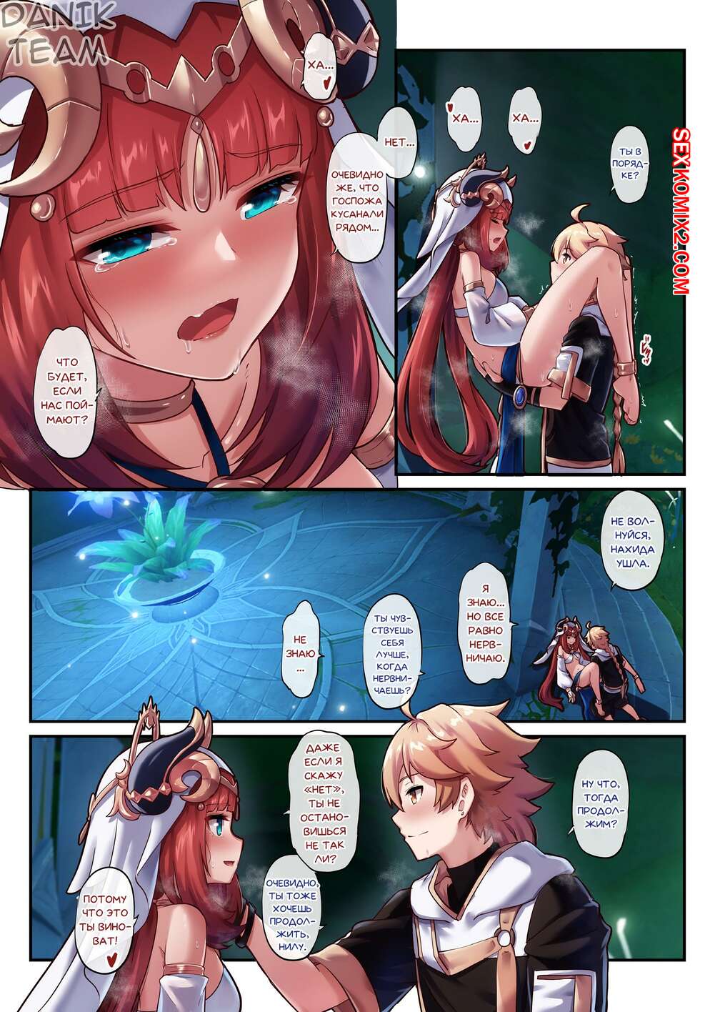 Порно комикс Genshin Impact. Итэр и Нилу. Часть 2. Aether and Nilou. Daidailong Горячая сисястая брюнетка продолжает веселиться со своим дружком, будучи в очень возбужденном состоянии. Парень встал на колени перед красоткой и стал ласкать ее пизденку.