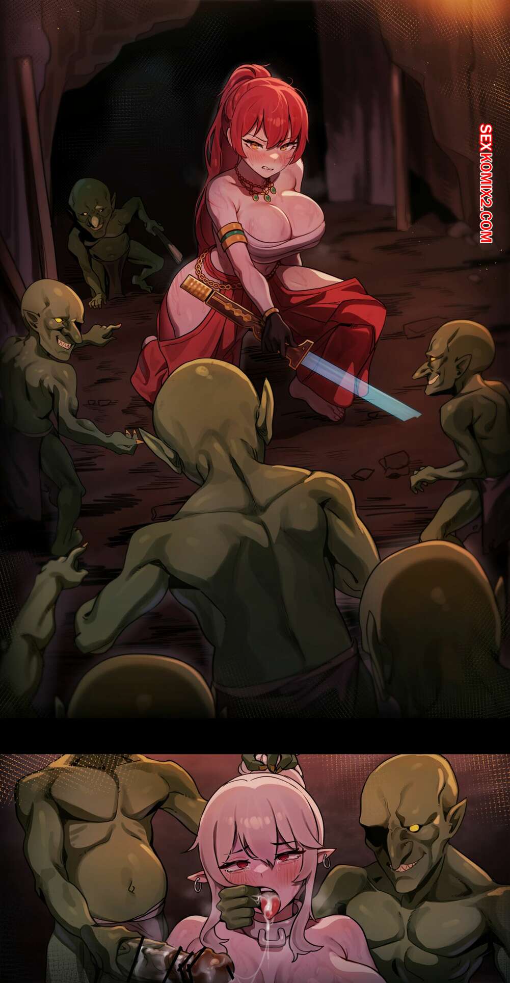 Порно комикс Loser Kunoichi & Loser Samurai. Dungeon Fighter Online. 5t На горячих сексуальных красоток нападают гоблины с огромными хуями. Они раздевают девушек и дают им отсосать свои большие хуи, после чего хорошенько ебут их и заполняют своей спермой.