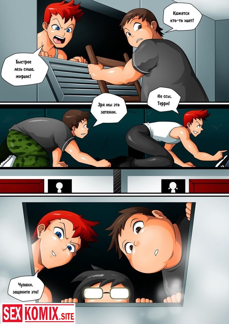 Порно комикс Душевая с сюрпризом. В этом комиксе вы увидите как парни, захотели подсмотреть за своими сексуальными девушками в душе. И для этого залезли в вентиляцию и добрались до душевой комнаты, но девушки их обнаружили. И одна из красоток оказалась волшебницей, она вытащила их из вентиляции с помощью магии. Девушка прокляла их, и в следующие 24 часа парни превратились в девушек. И теперь могли спокойно посещать женскую душевую.