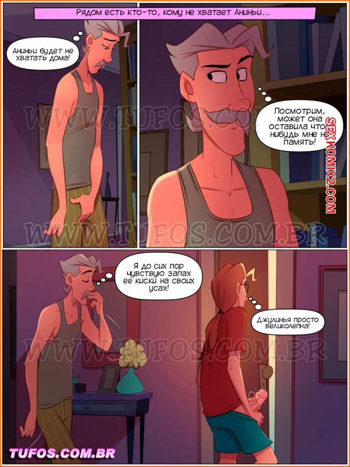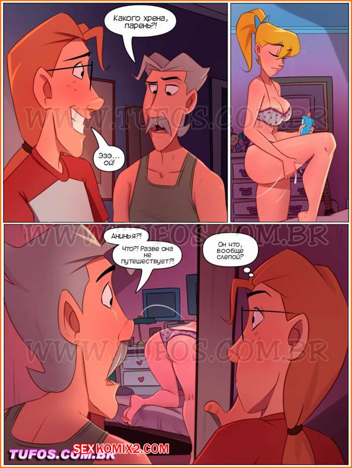 Порно комикс Четверо похотливых. Часть 4. Добро пожаловать в пижаму. As 4 sacanas. Tufos Парни подсматривали за сексуальной блондинкой в ее комнате, а она их спалила. Красотка позвала парней к себе и стала у них отсасывать, после чего дала им себя выебать.