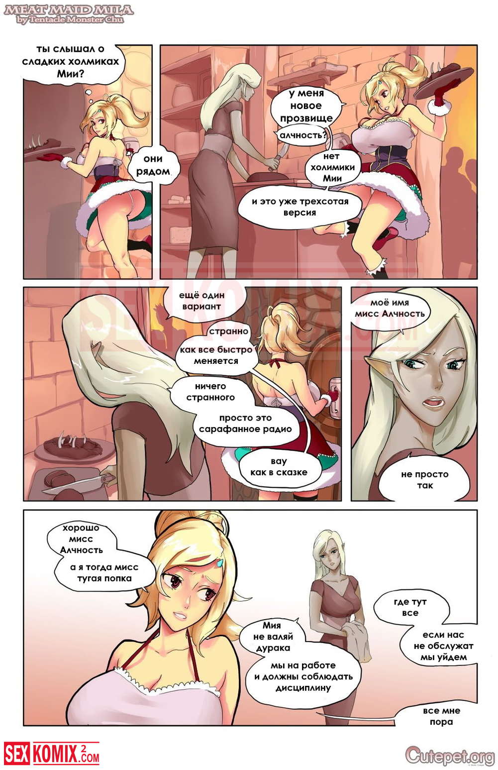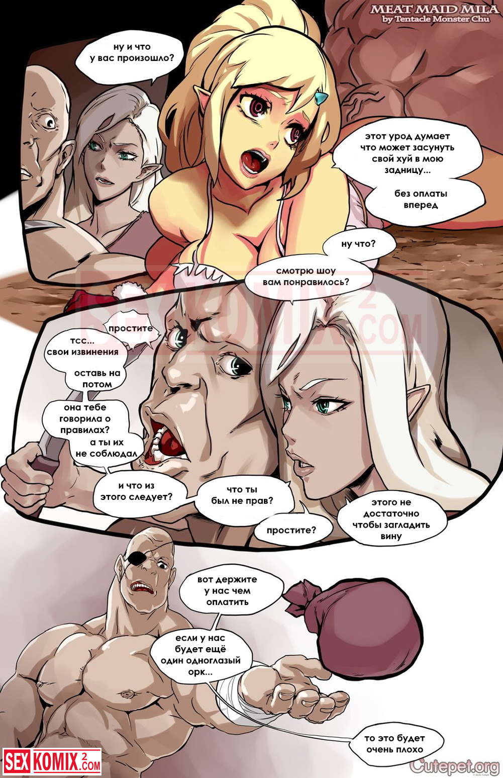Порно комикс Официантка Мия. Часть 1. Большие мужчины отдыхают в баре. Их обслуживает девушка эльф, которая любит трахаться за деньги. Один из них трахает её в задницу не заплатив. Но девушка добивается того, чтобы он отдал деньги.