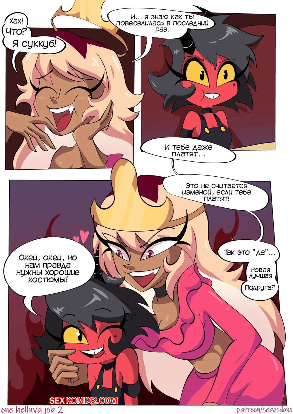 Порно комикс Helluva Boss. Одна адовая работенка. Часть 2. One Helluva Job. Sebasdono Горячая сисястая брюнетка встретилась с двумя парнями с большими хуями, чтобы хорошенько с ними повеселиться. Красотка отсосала большие хуи парней, после чего дала им себя выебать во все дырочки.