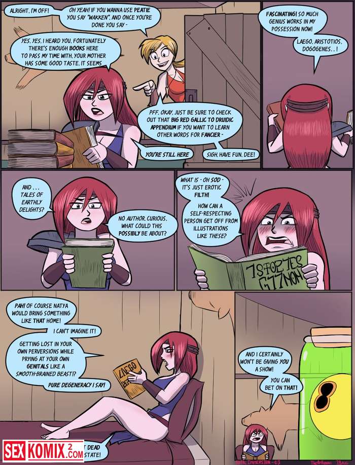 Порно комикс Полное погружение. The Arthman. Английский. Девушка воин нашла утешение в чтиве про секс, удовольствий добавил зеленый монстр из банки.