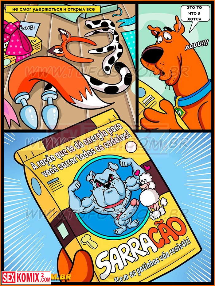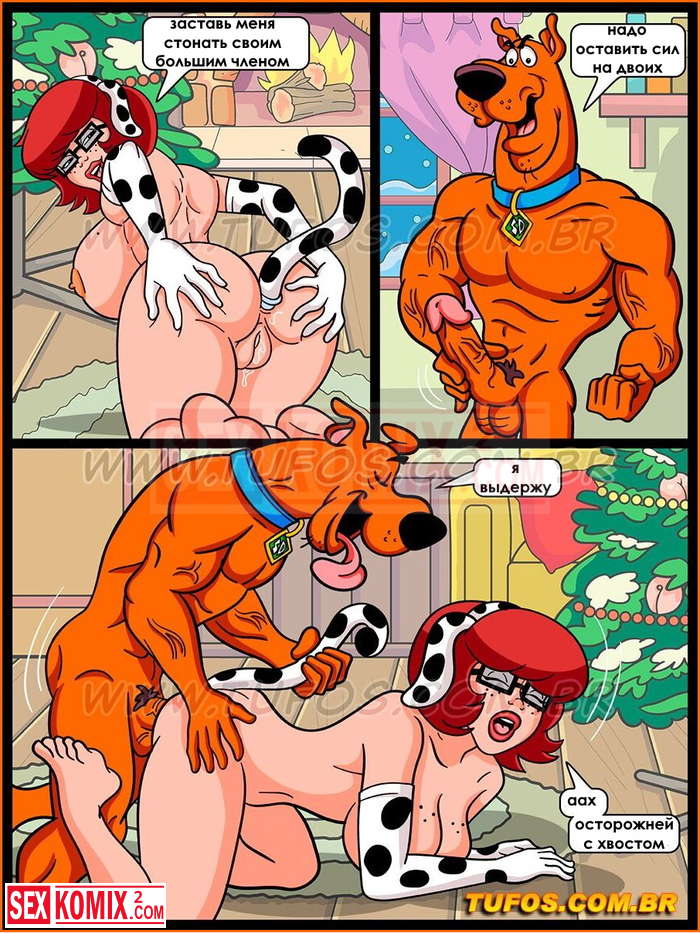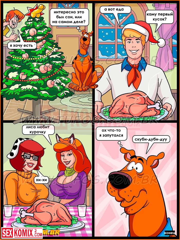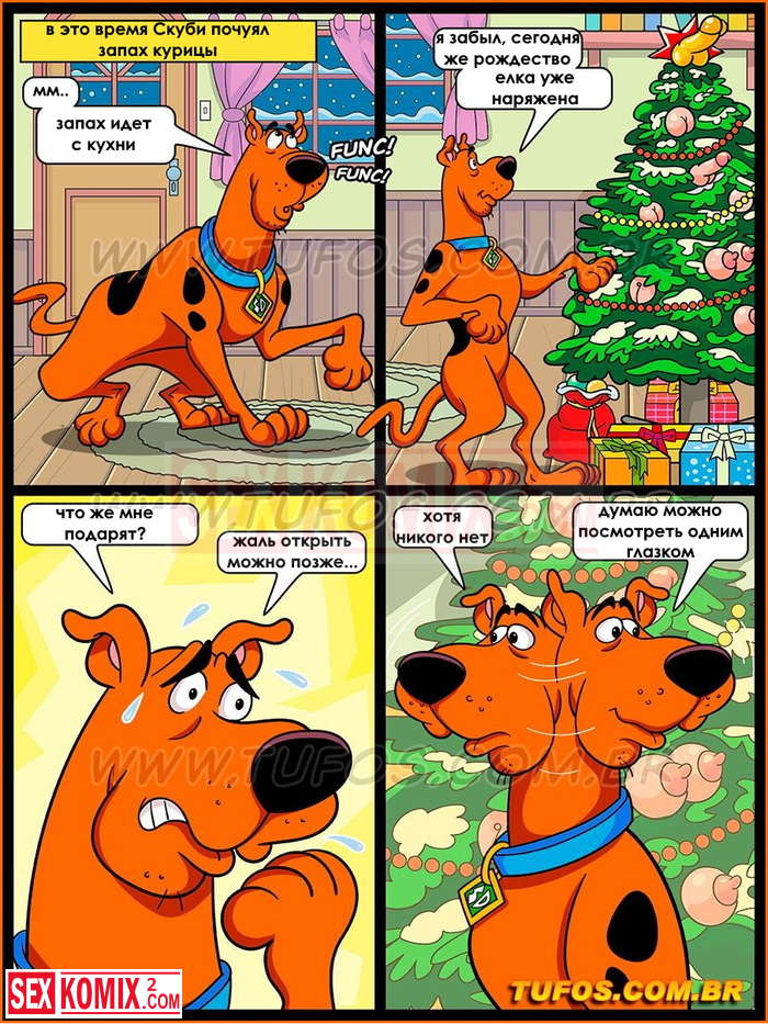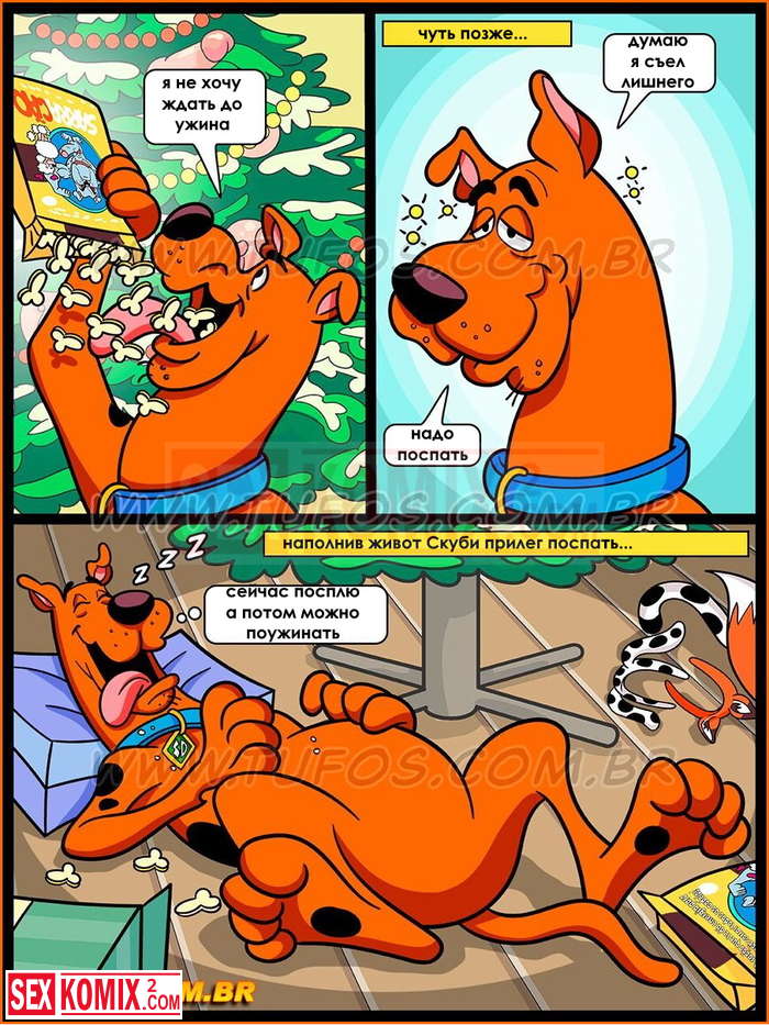 Порно комикс Скубиду. Часть 9. Рождественский подарок. Скуби нашел под елкой подарок, это была пачка корма. Он съел его за один раз и уснул, он увидел развратный сон.