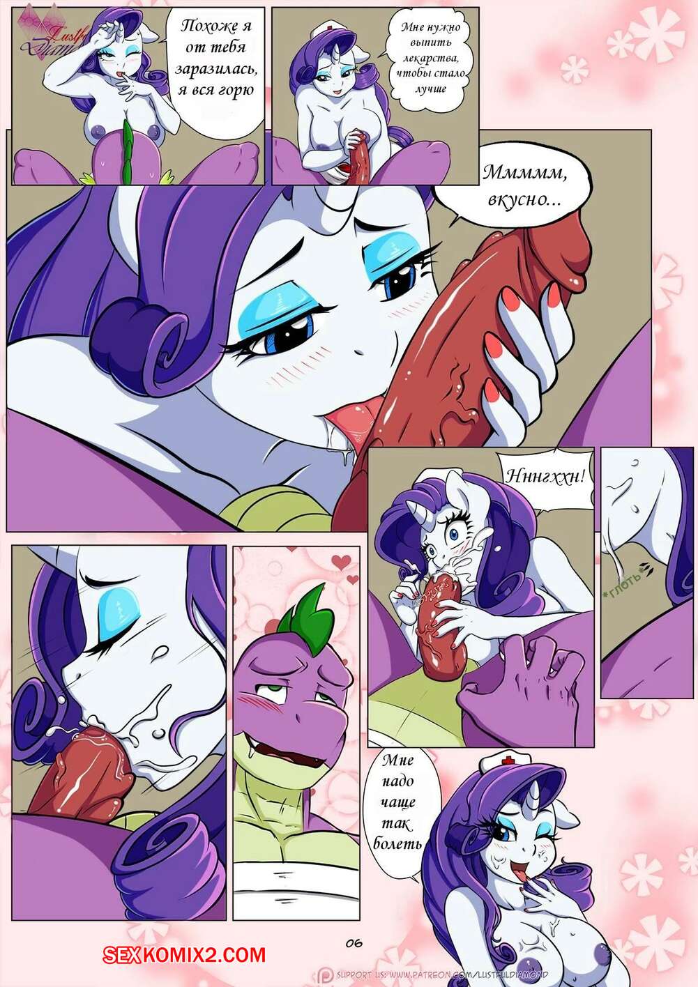 Порно комикс My Little Pony. Похотливый алмаз. Медсестра Рарити Горячая сексуальная медсестра была очень возбуждена и решила повеселиться со своим пациентом. Она разделась перед ним и отсосала большой хуй парня, после чего дала ему себя хорошенько выебать.