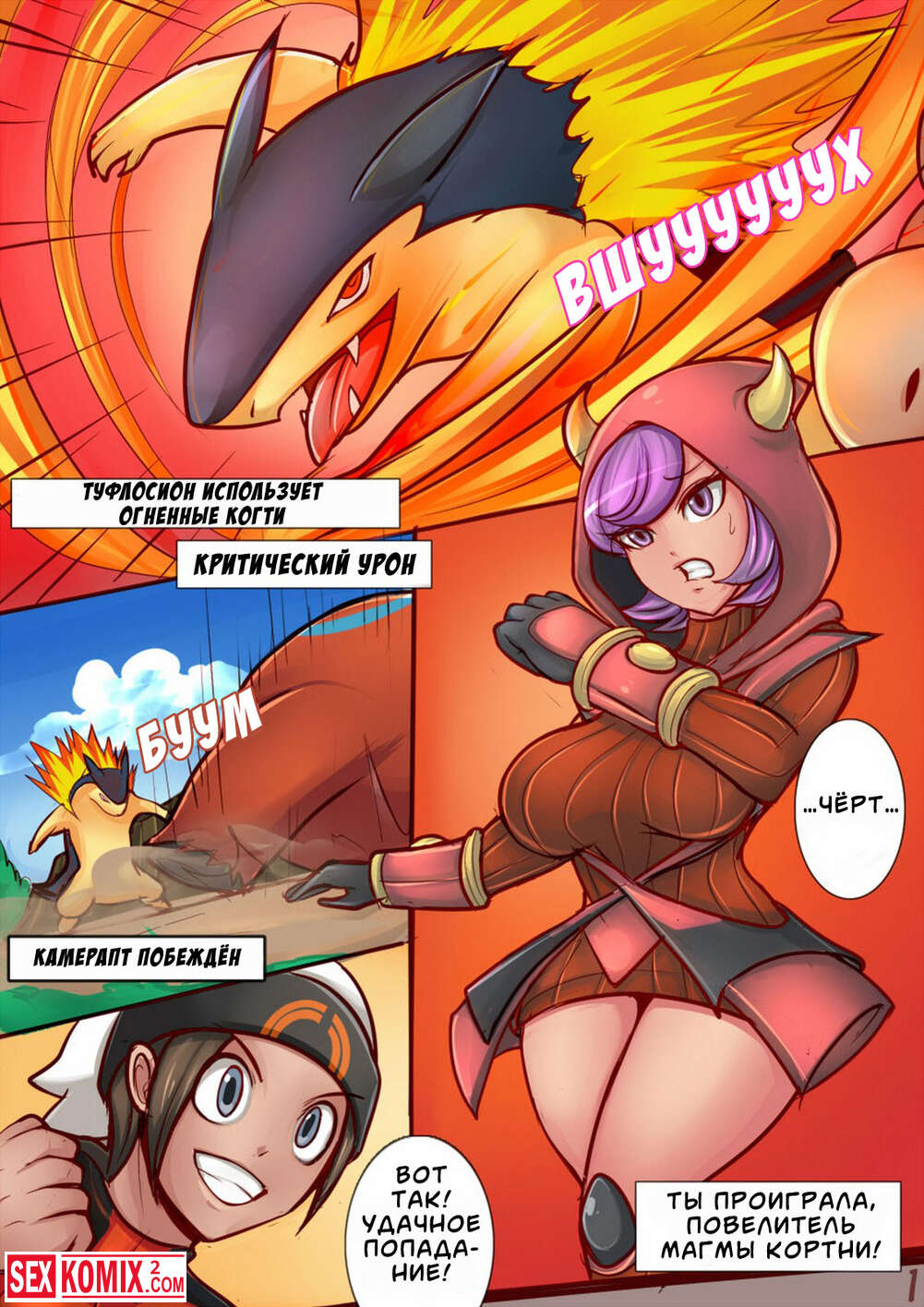 Порно комикс Чемпионская битва. Горячее Извержение. Пока двое покемонов сражались между собой, девушка тренер повалила на землю парня и прижала его своими большими сиськами.