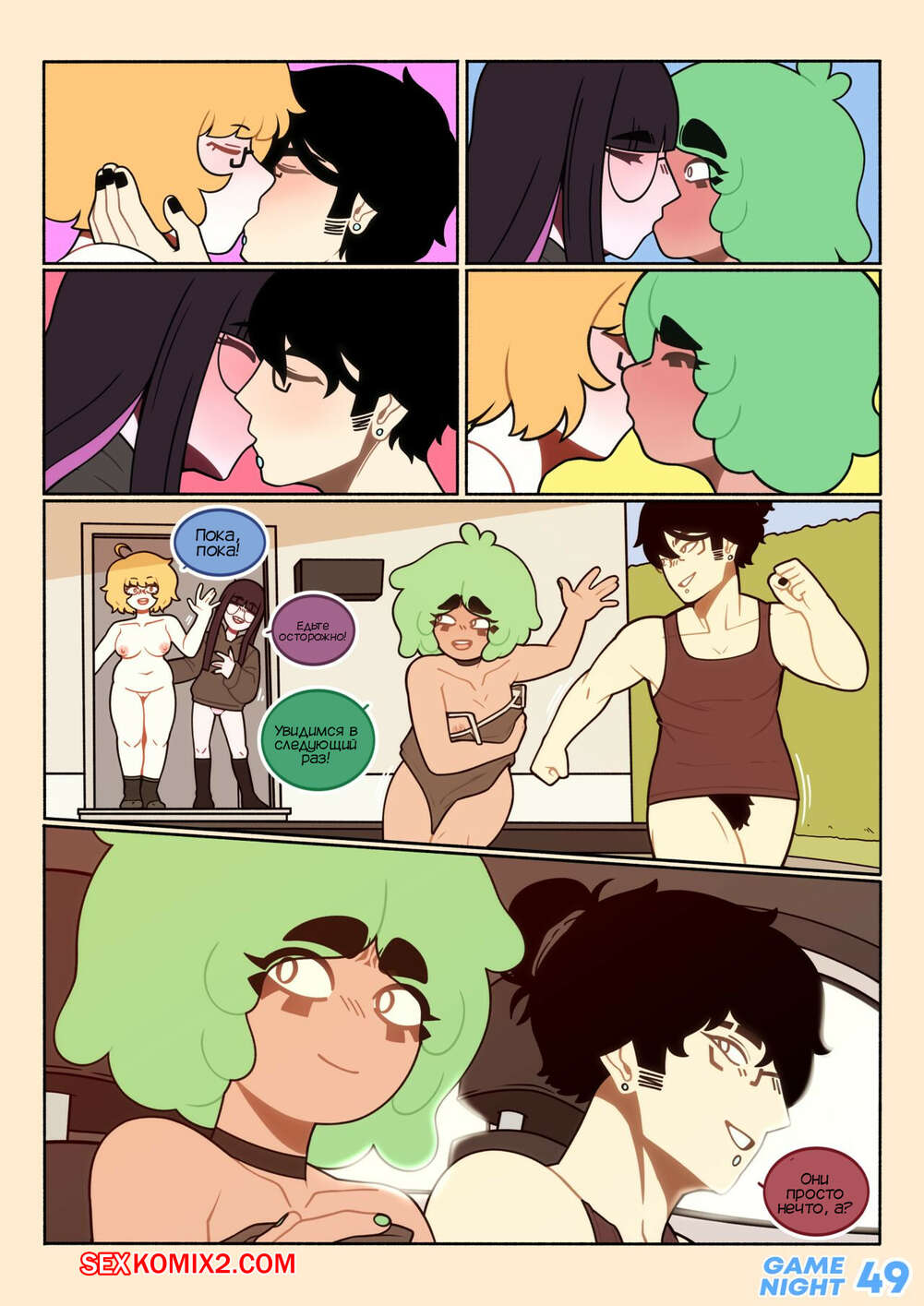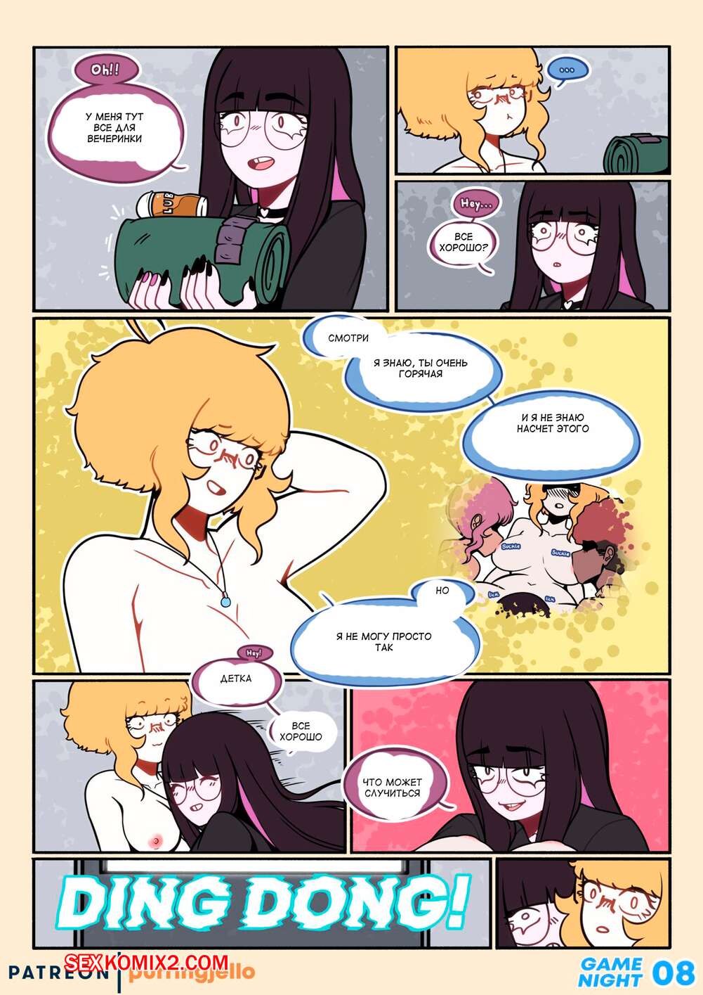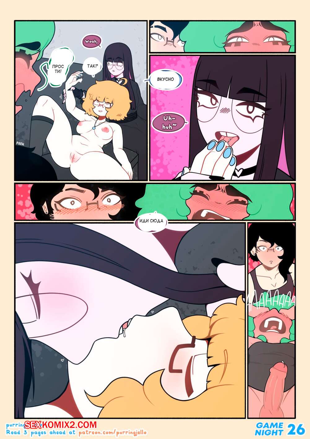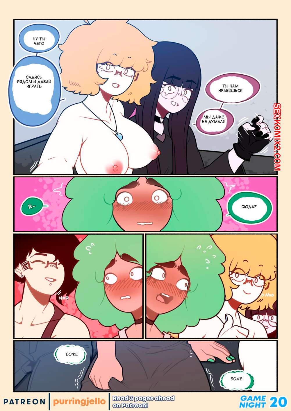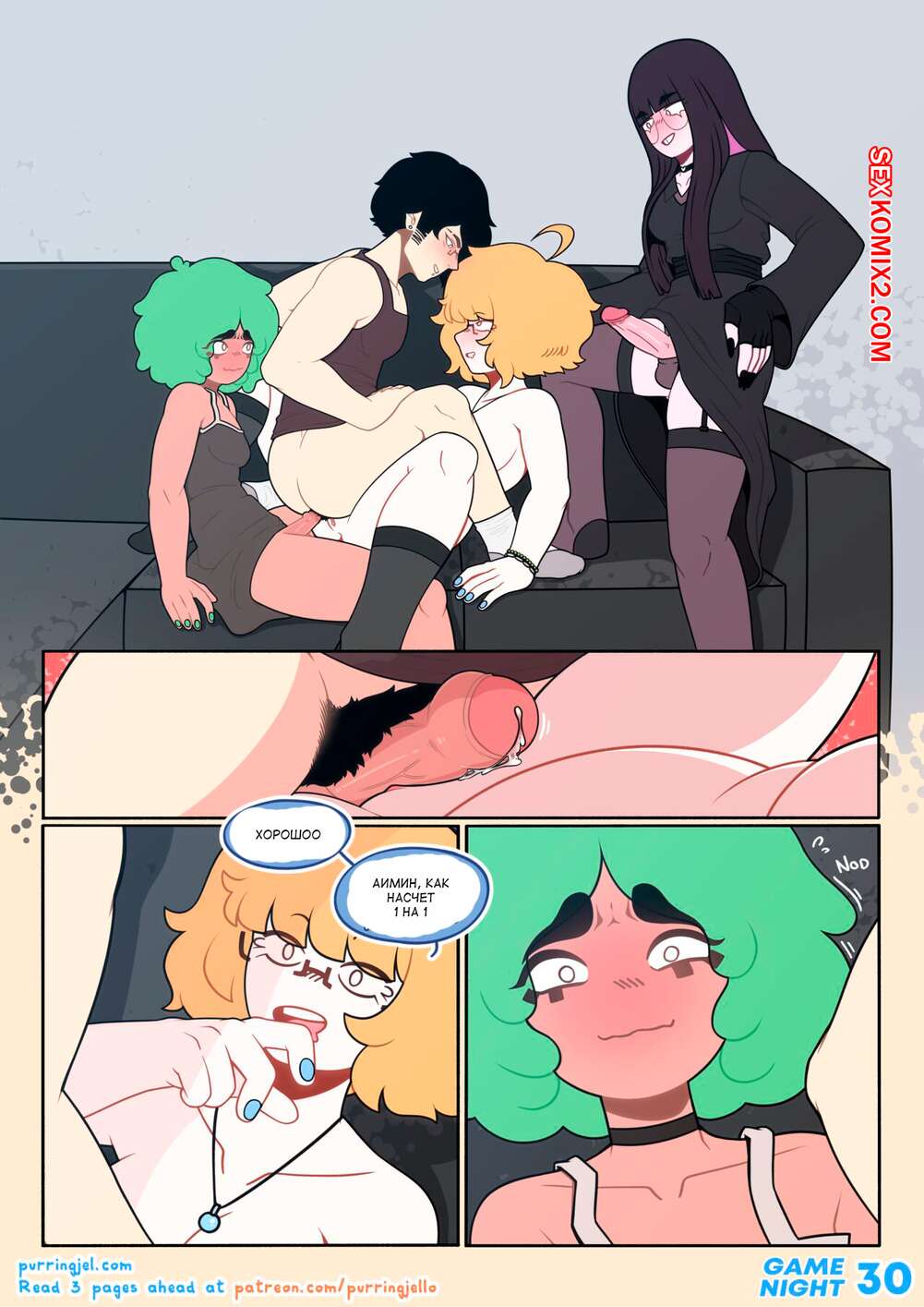 Порно комикс Ночная игра. Game Night.purringjello. Горячие подруги устроили ночь игр. Девушки были очень возбуждены и хотели трахаться, поэтому они разделись и стали ласкать друг дружку, после чего занялись групповой еблей.