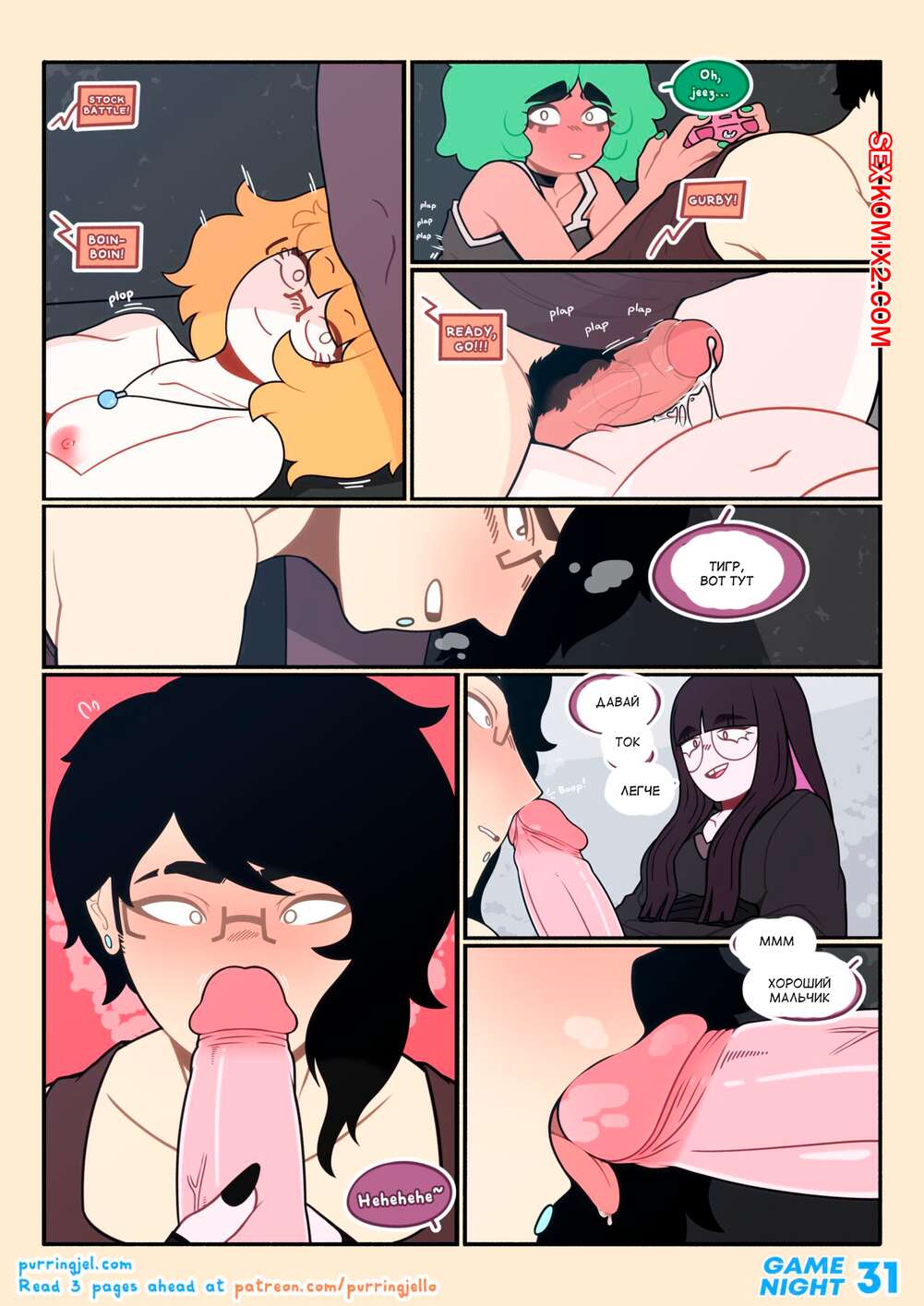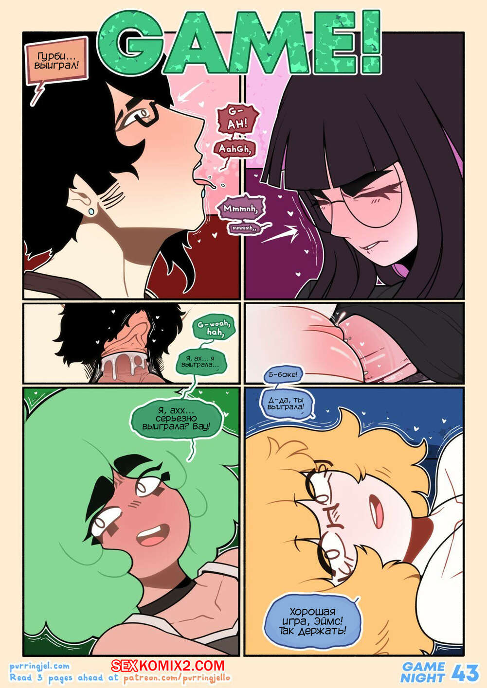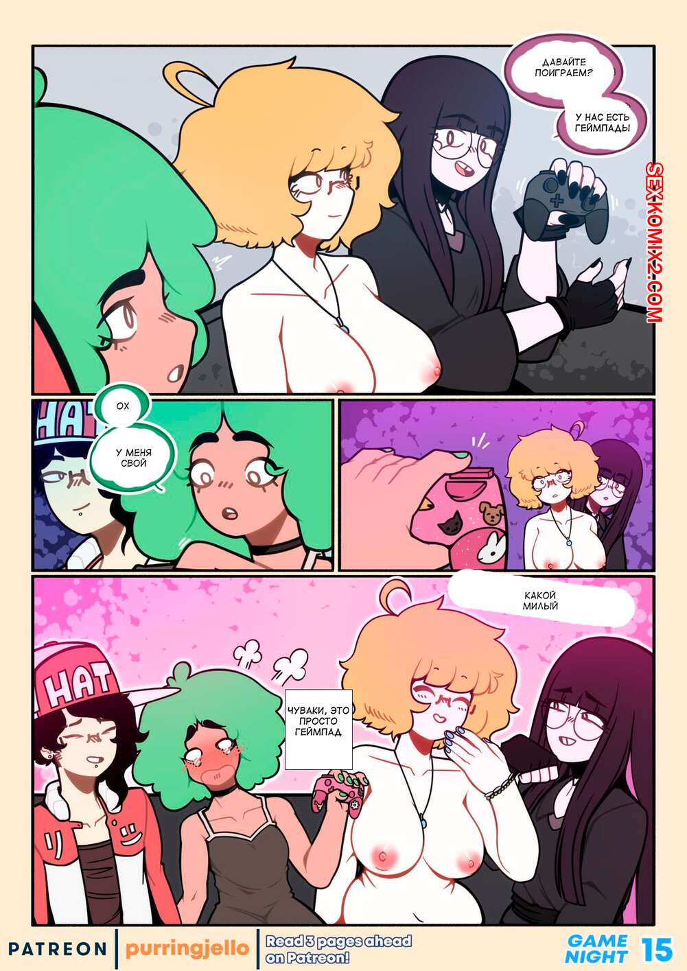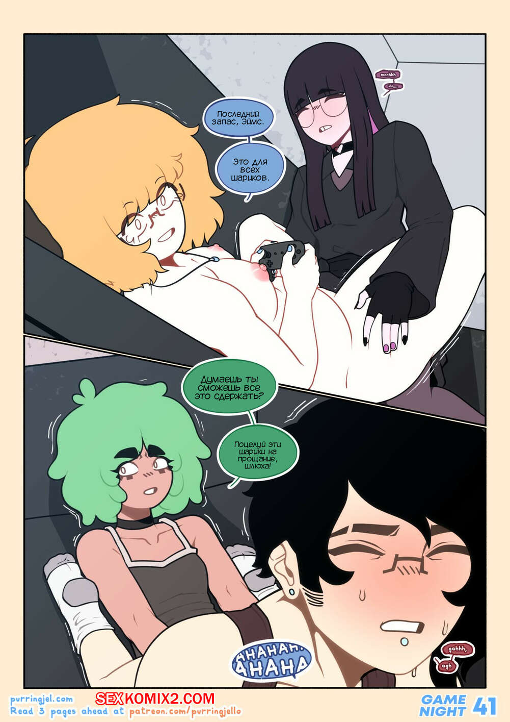 Порно комикс Ночная игра. Game Night.purringjello. Горячие подруги устроили ночь игр. Девушки были очень возбуждены и хотели трахаться, поэтому они разделись и стали ласкать друг дружку, после чего занялись групповой еблей.