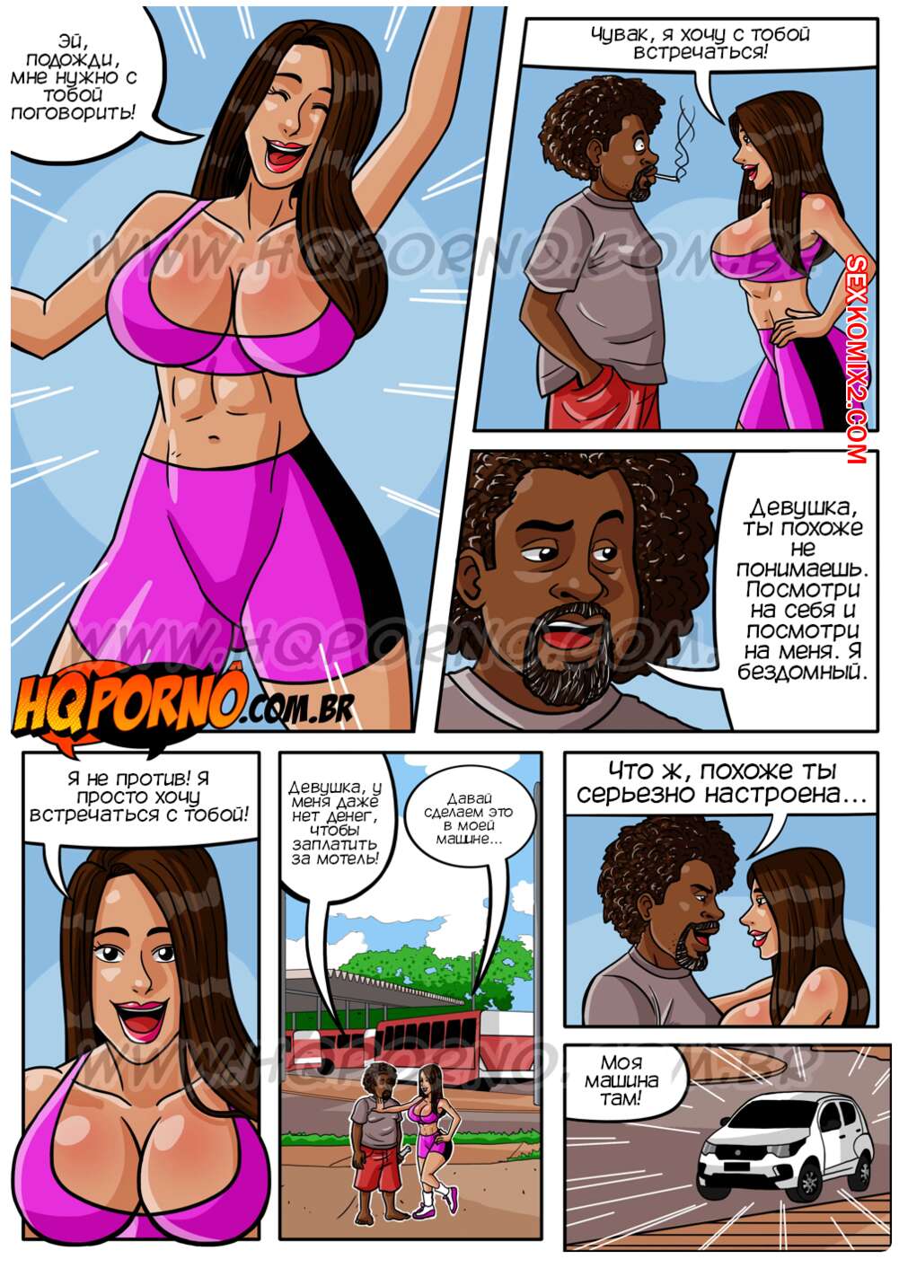 Порно комикс Парные фантазии. Часть 3. Fantasias de casal. HQPorno Сексуальная темнокожая милфа брюнетка пригласила бездомного парня к себе в машину, чтобы повеселиться с ним. Красотка разделась и отсосала хуй парня, после чего дала ему себя выебать во все дырочки.