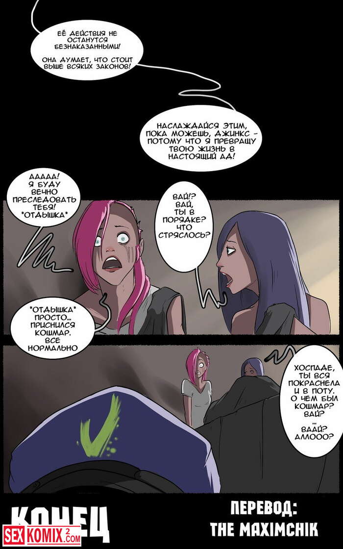 Порно комикс Ночь с Джинкс. Красотке снится очень яркий сон, она попала к развратной девушке полицейскому, но позже она достала свой член. Оказывается это был транс, как хорошо что все это сон.