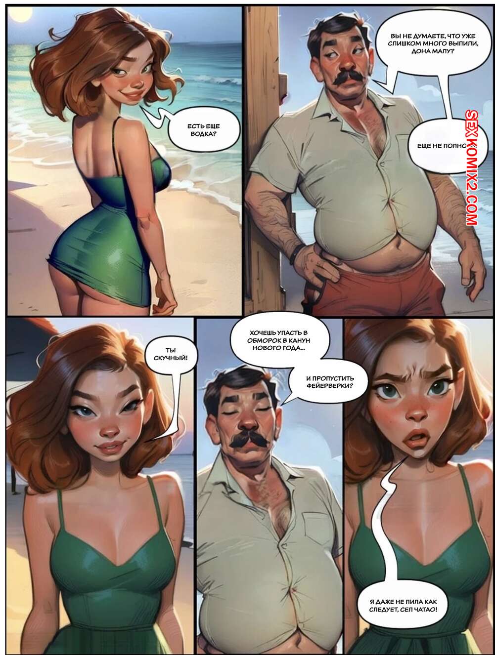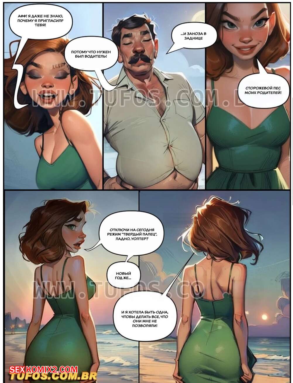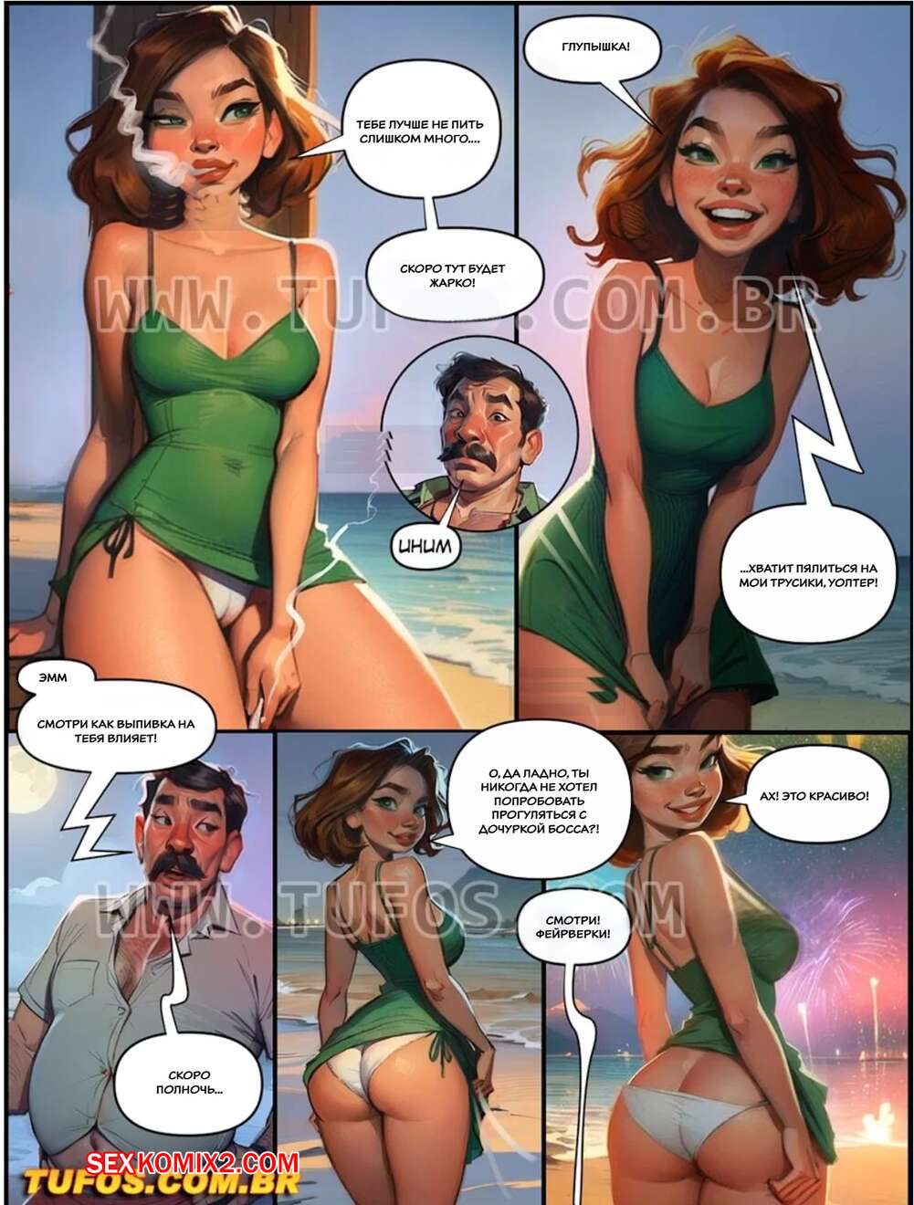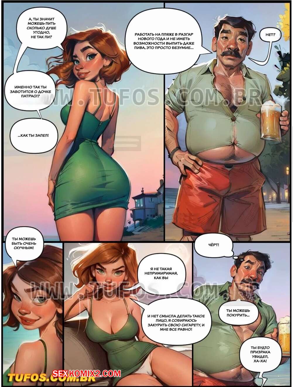 Порно комикс Наслаждение сумасшедшей жизнью. Часть 7. Tufos Сексуальная брюнетка сильно напилась и решила повеселиться с мужчиной на пляже. Она встала на колени и отсосала его большой хуй, после чего дала ему выебать себя во все дырочки.