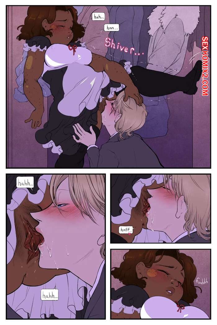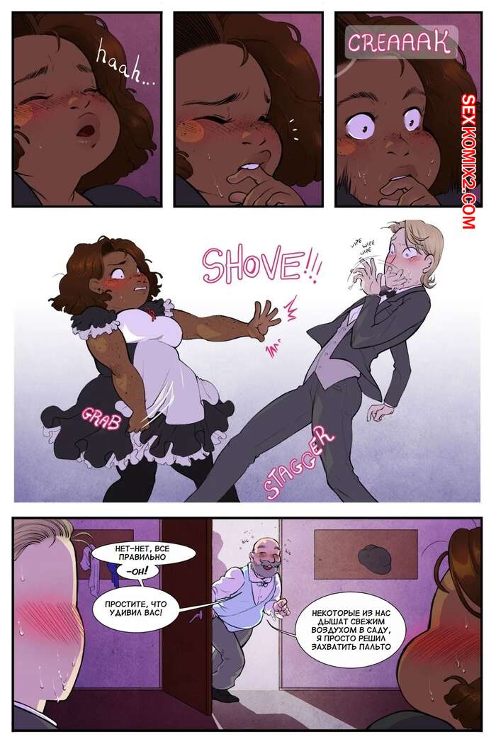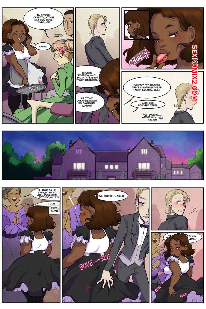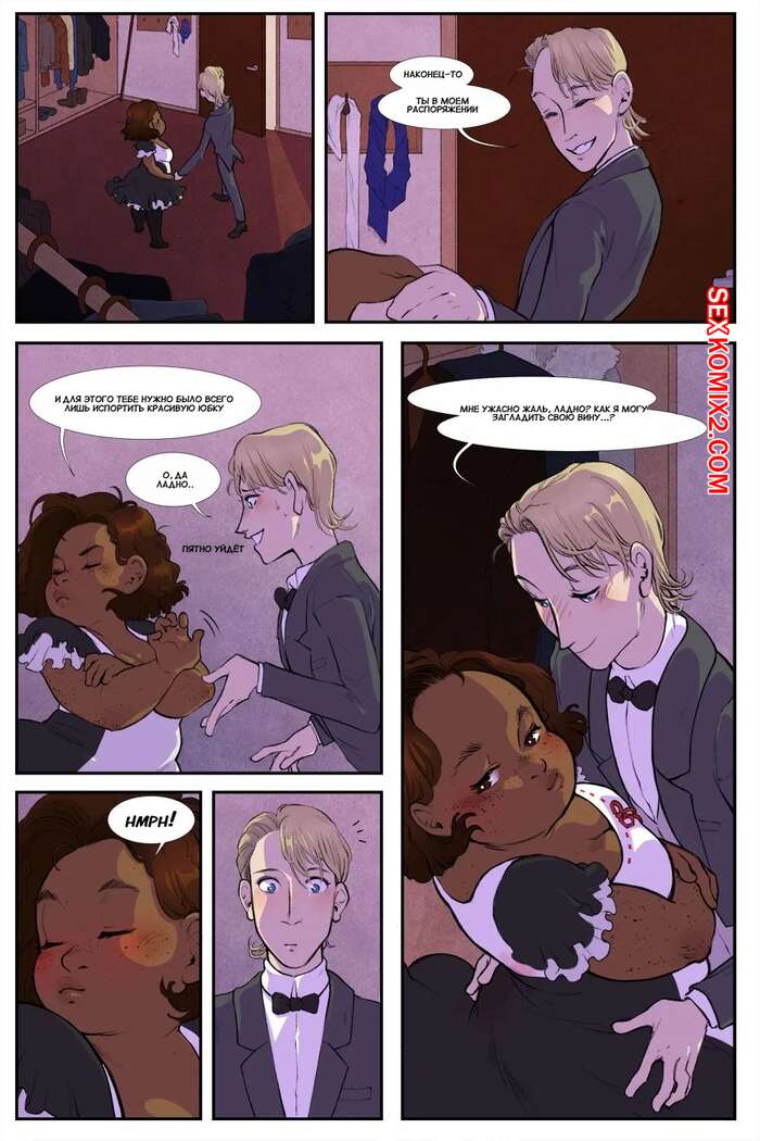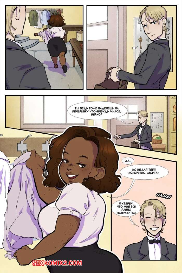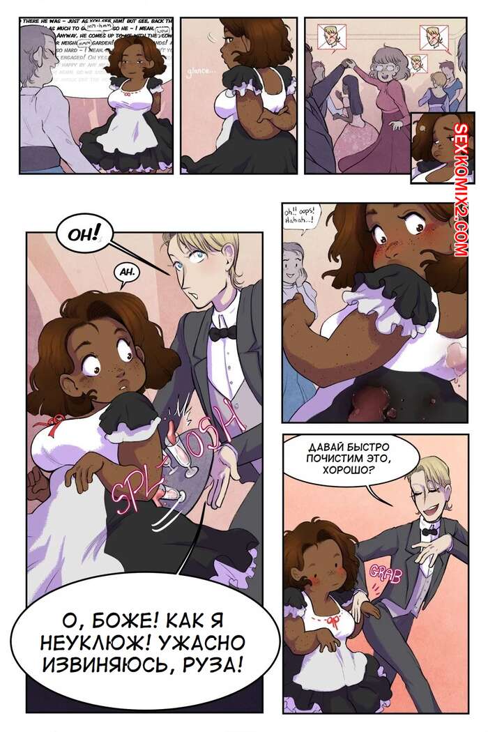 Порно комикс Нарушение этикета. Breaking Etiquette. Dsan Во время бала парень решил повеселиться с горячей темнокожей брюнеткой горничной. Он отвел ее в уединенное место, где снял с девушки трусики и отлизал ее пизденку.