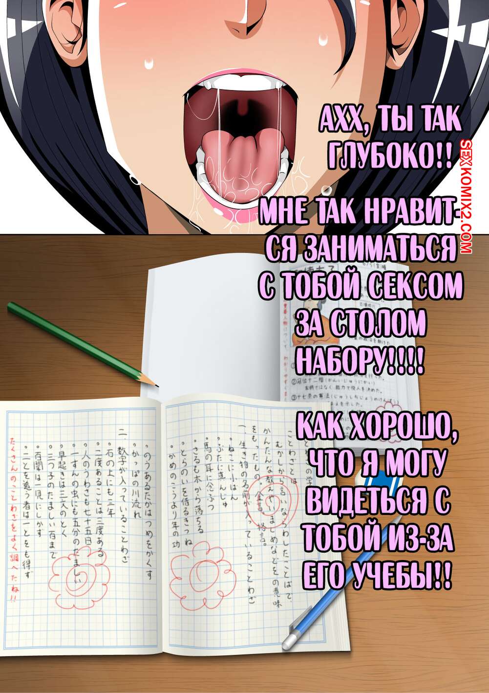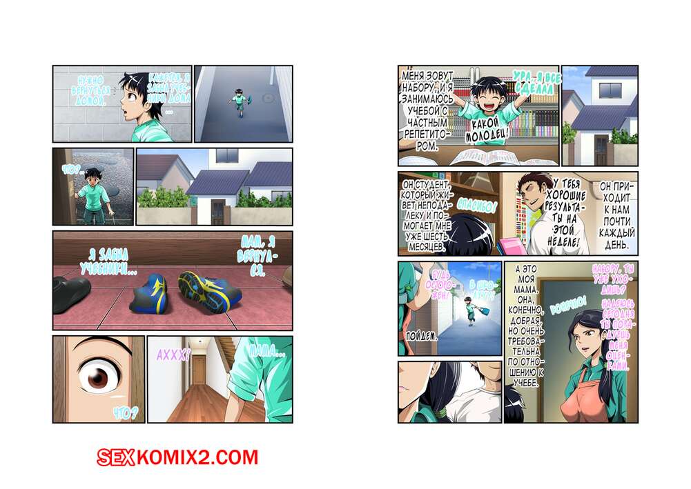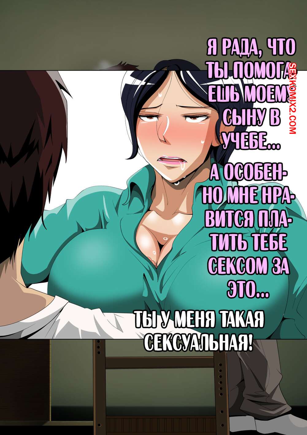 Порно комикс Что делает моя мама в комнате с репетитором. Niwatori Sennin Сисястая брюнетка милфа осталась наедине в комнате с репетитором своего сына. Красотка разделась и отсосала большой хуй парня, после чего дала ему выебать свою пизденку.