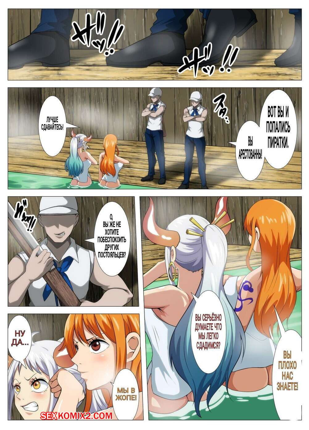 Порно комикс One Piece. Знойные Пиратки на Источниках. Q Doujin Горячие подруги отдыхали на горячих источниках, где привлекли внимание мужчин. Девушка встала на колени и отсосали большие хуи, после чего дали мужикам себя выебать.