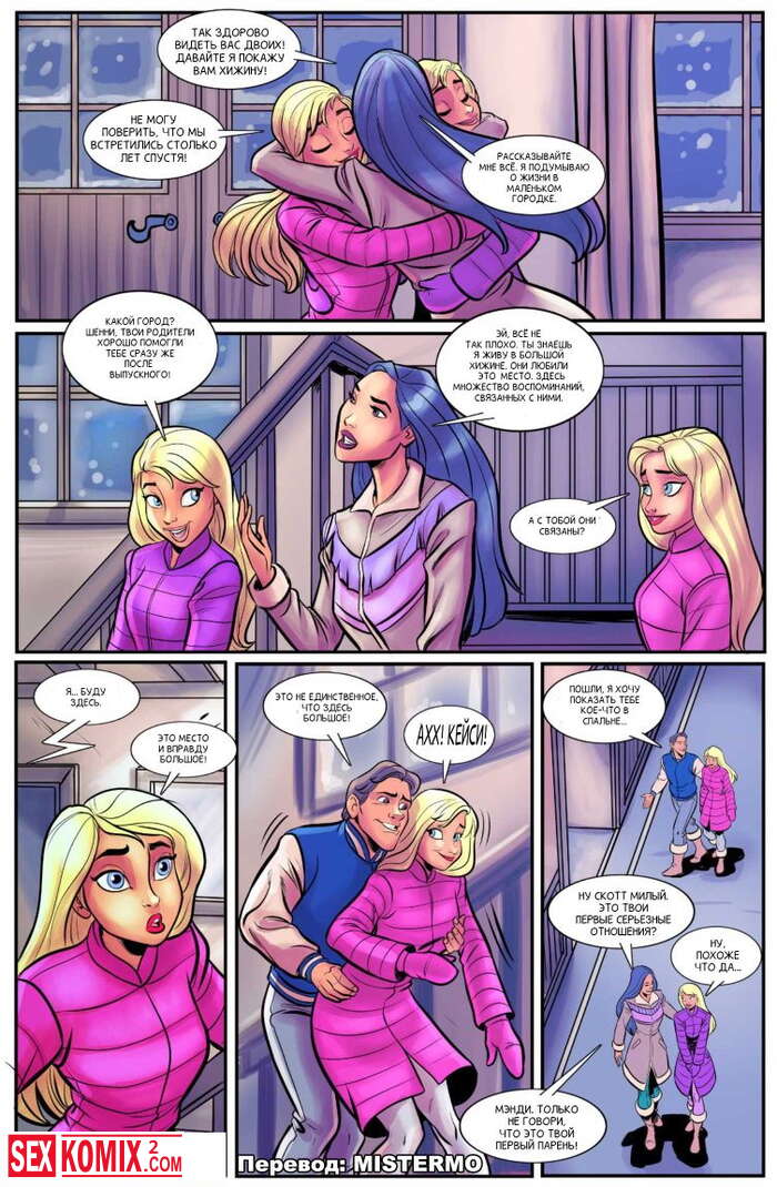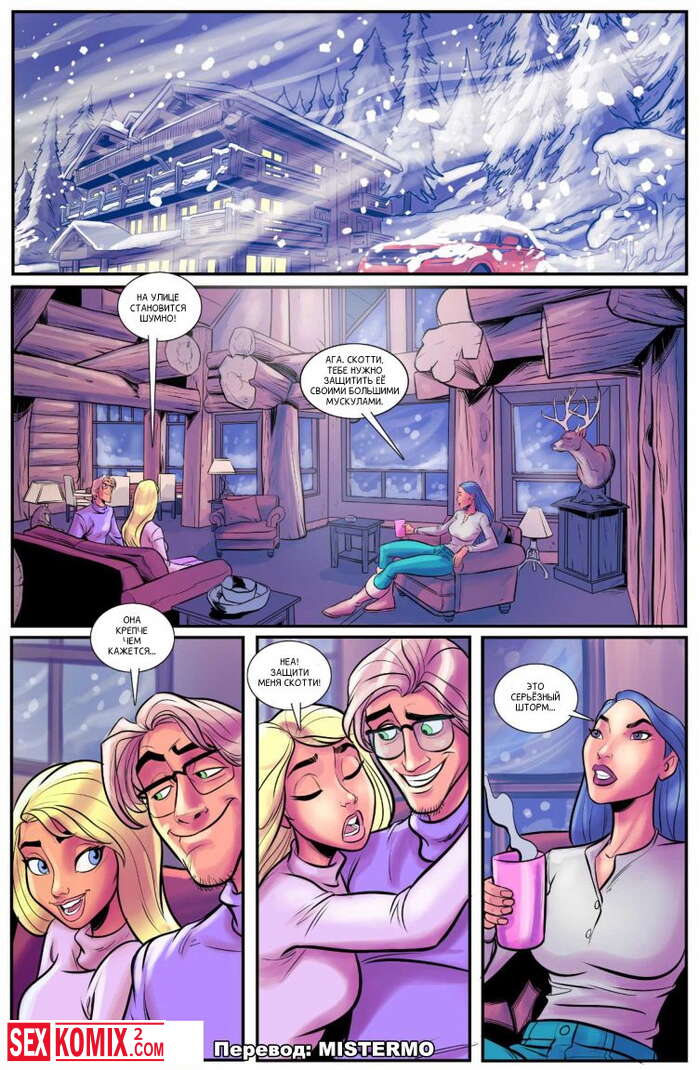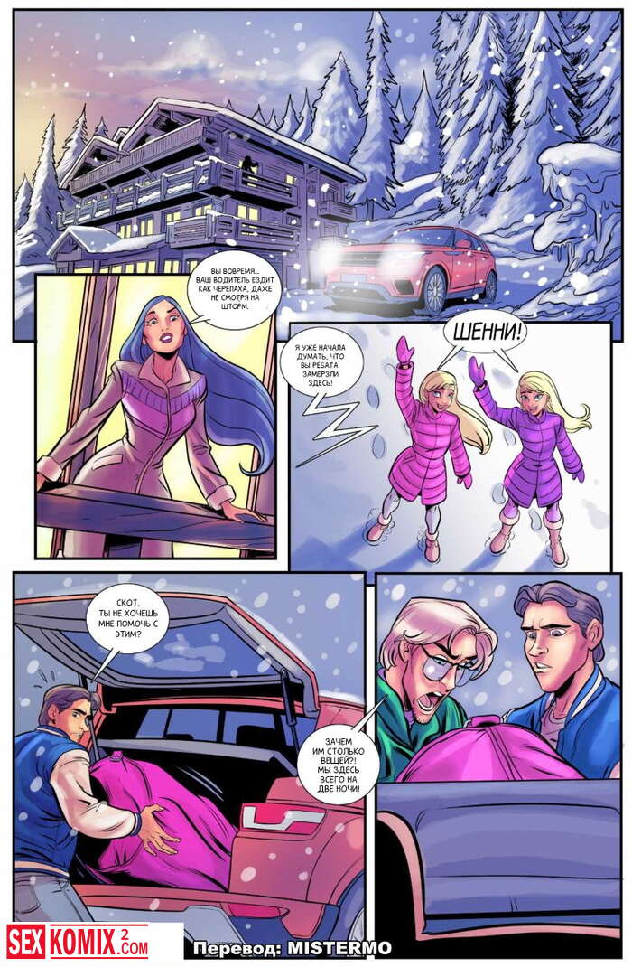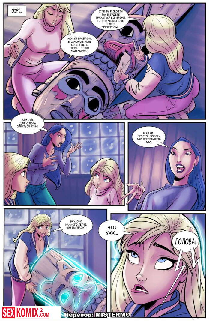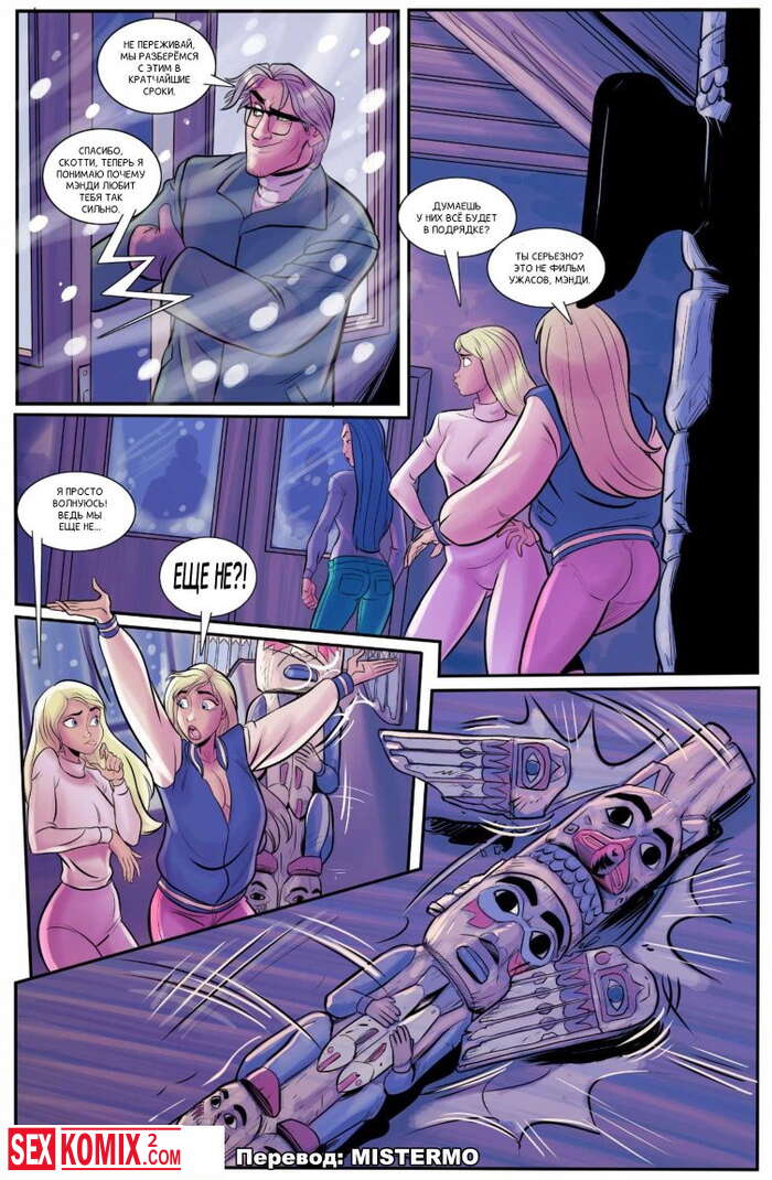 Порно комикс Cнега. Компания подростков отдыхали в загородном доме и случайно уронили древнюю статую. На блондинку подействовала магия и её грудь начала расти.