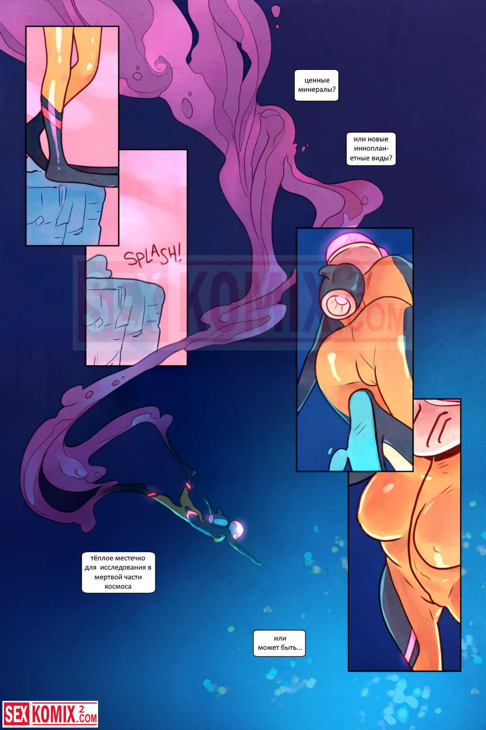 Порно комикс Нарисованный океан. Часть 1. Slipshine. Девушка исследователь прибыла на неизведанный планетоид и погрузилась в океан. Она встретила под водой разумную форму жизни и сама стала целью исследования.