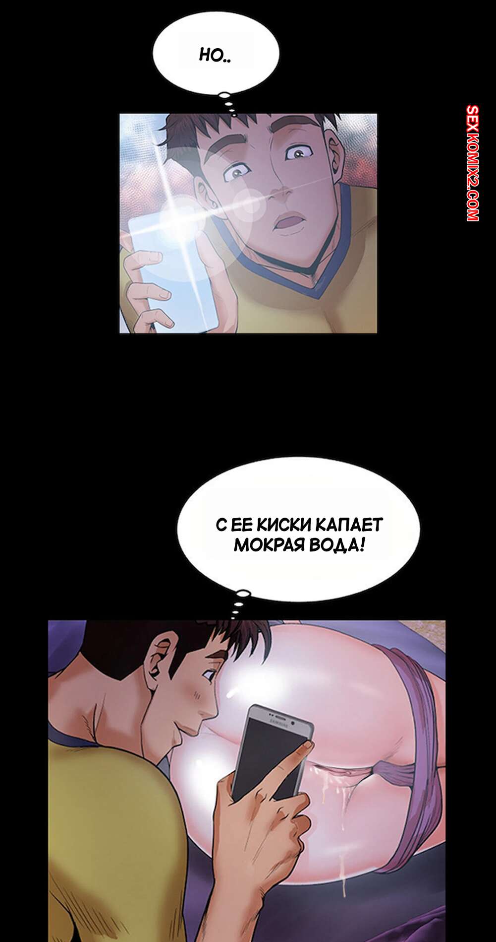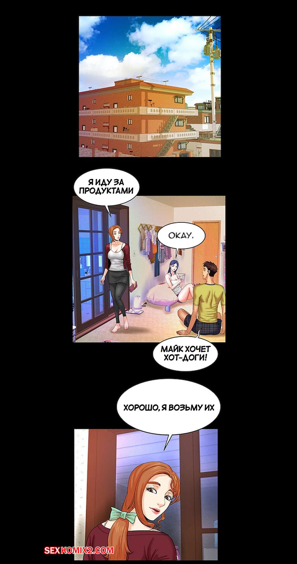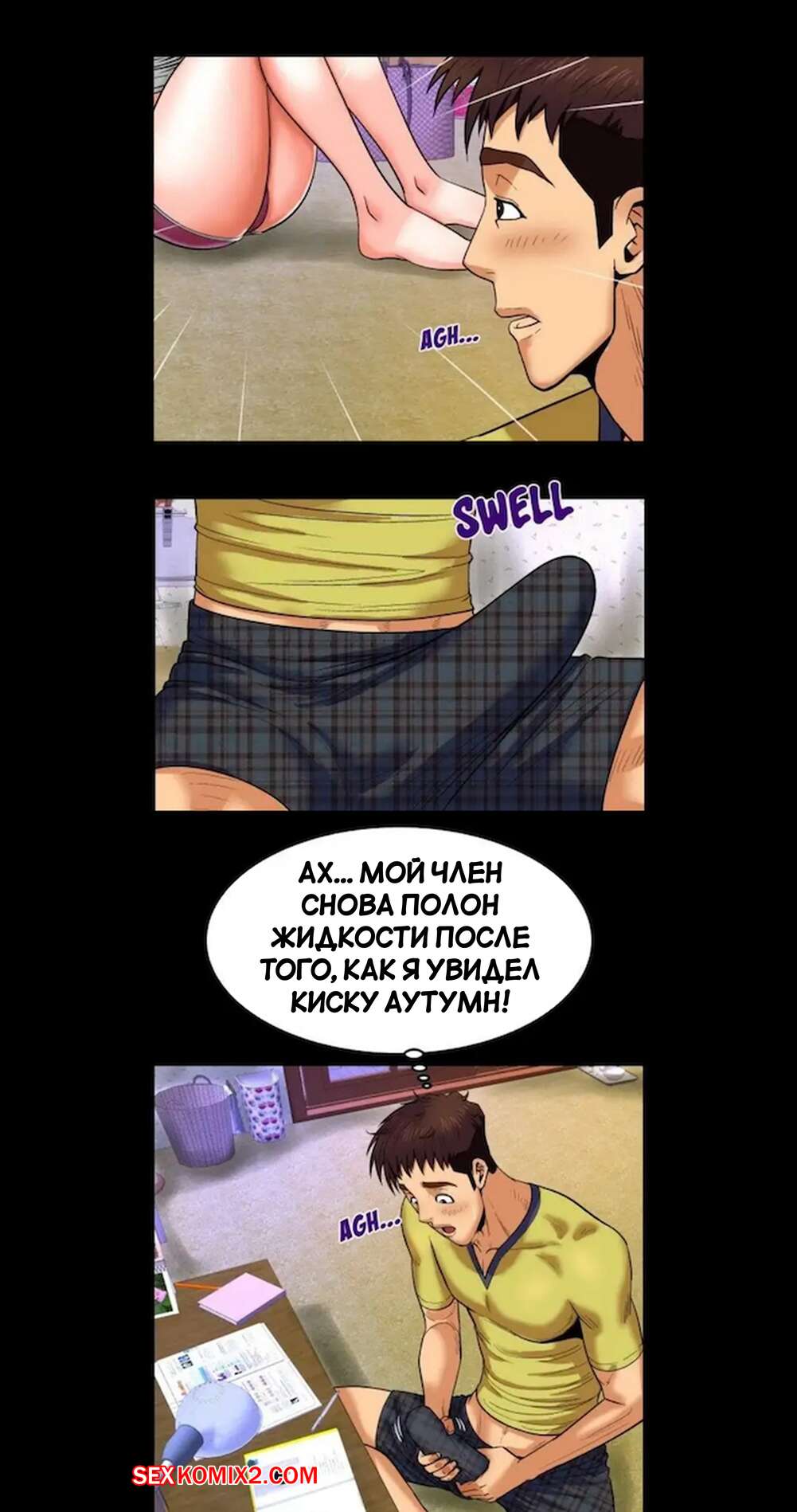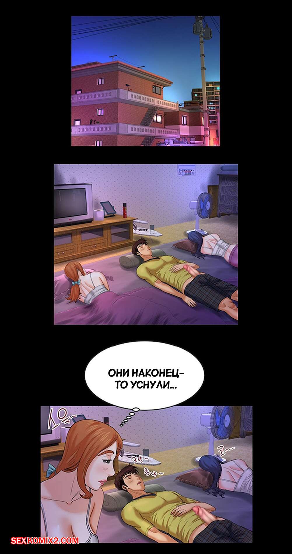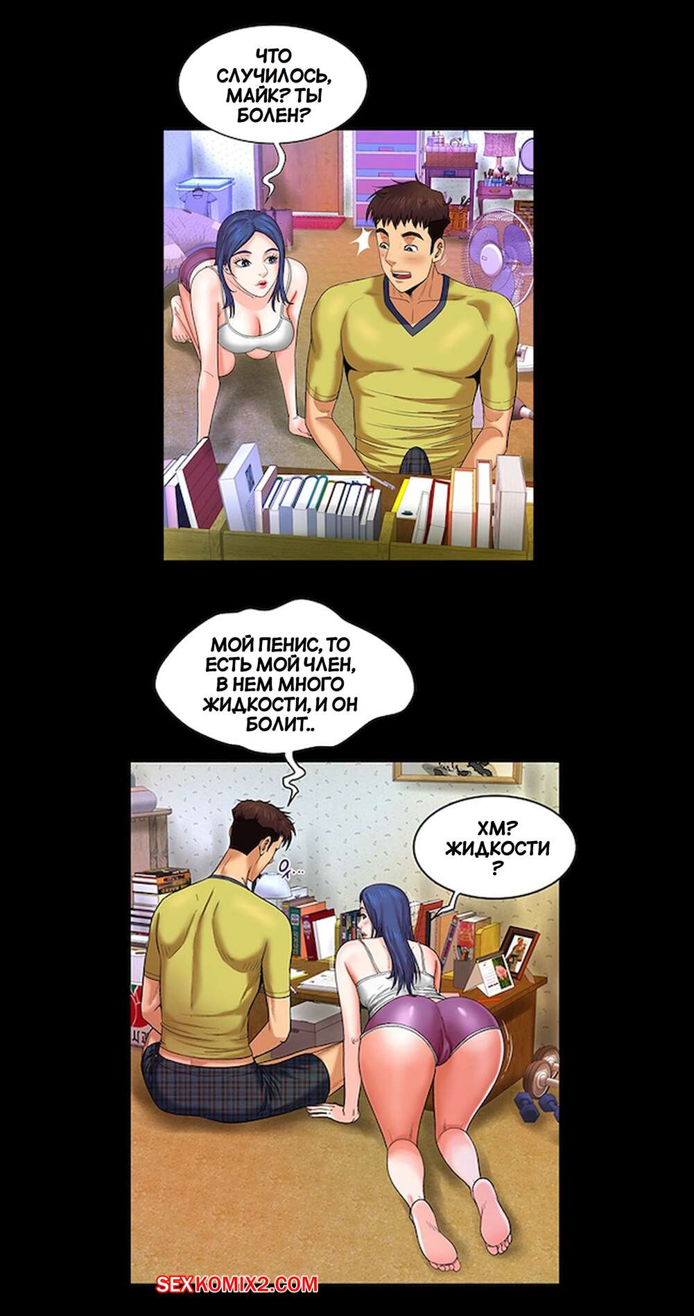 Порно комикс Моя тетя. Без цензуры. Часть 6. My Aunt. Toomics Майк лег спать вместе со своей тетей и двоюродной сестрой. Он так возбудился, глядя на попку кузины, что решил снять с нее шортики и начал любоваться пизденкой девушки.