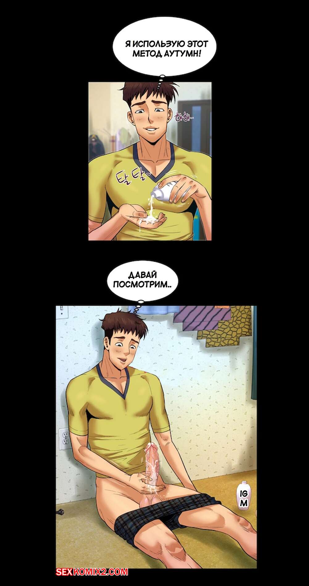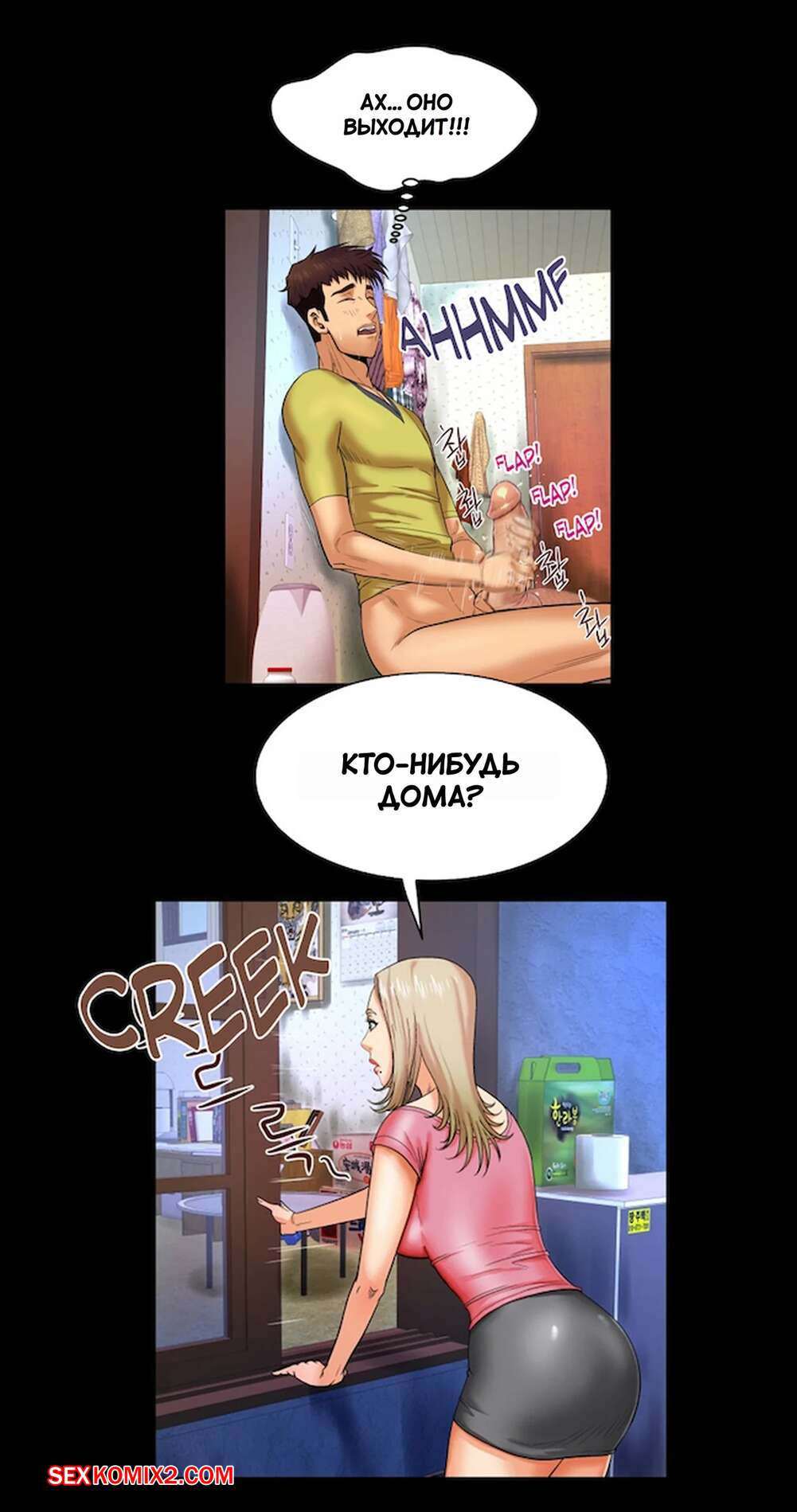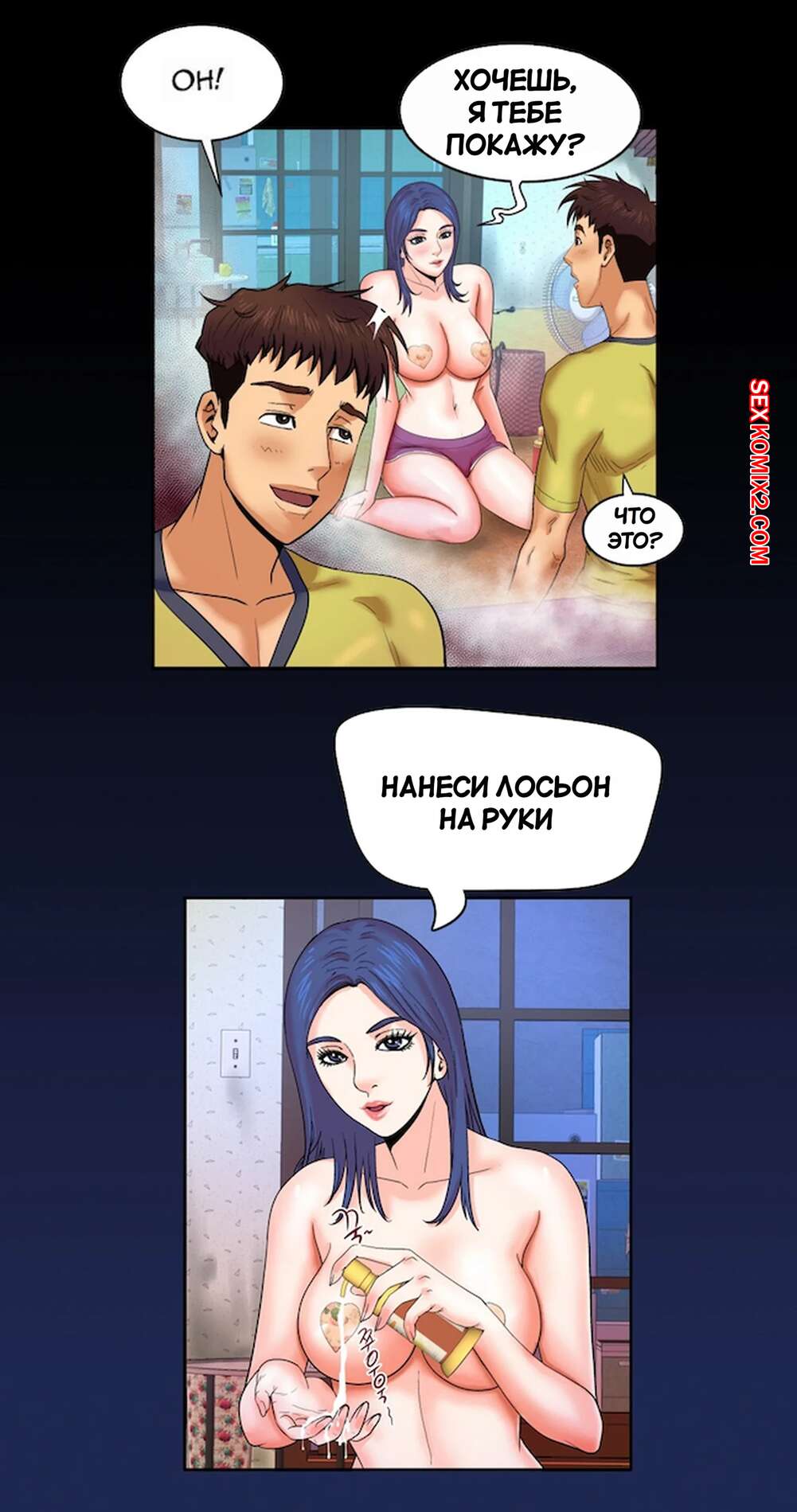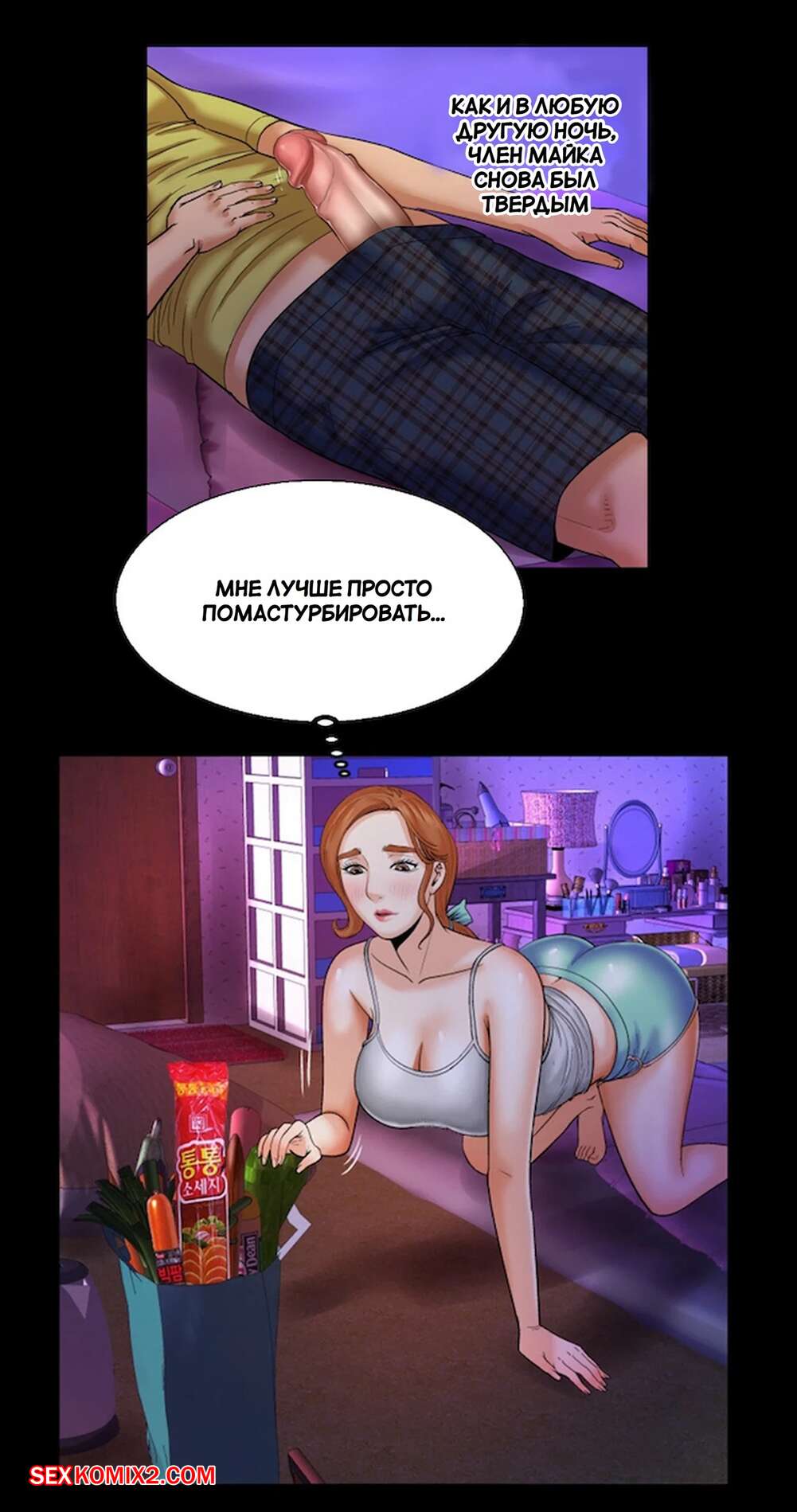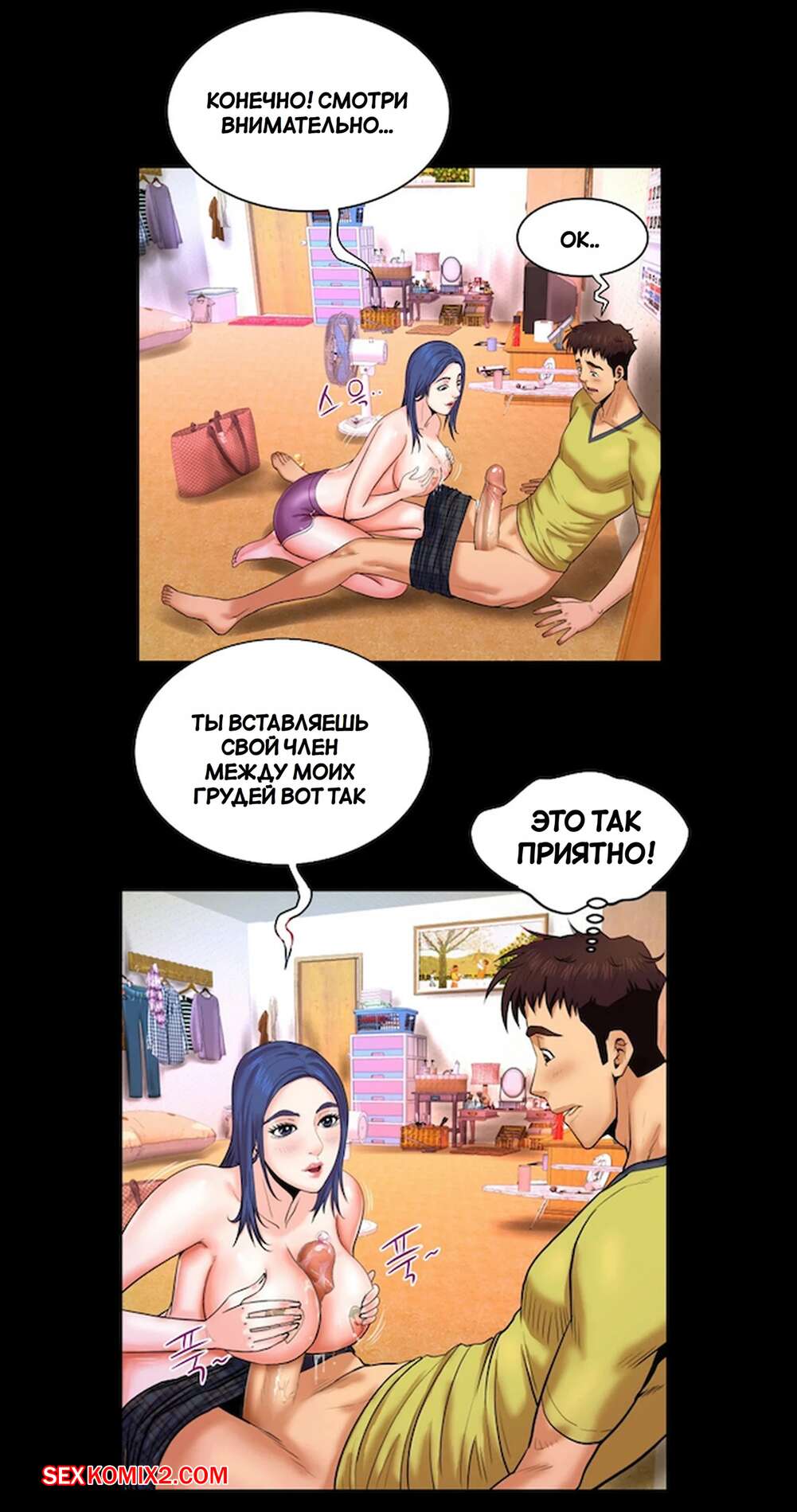 Порно комикс Моя тетя. Без цензуры. Часть 7. My Aunt. Toomics Молодая горячая брюнетка возбудилась, увидев большой член своего кузена. Девушка встала на колени и стала дрочить большой хуй парня, желая ощутить его в себе.
