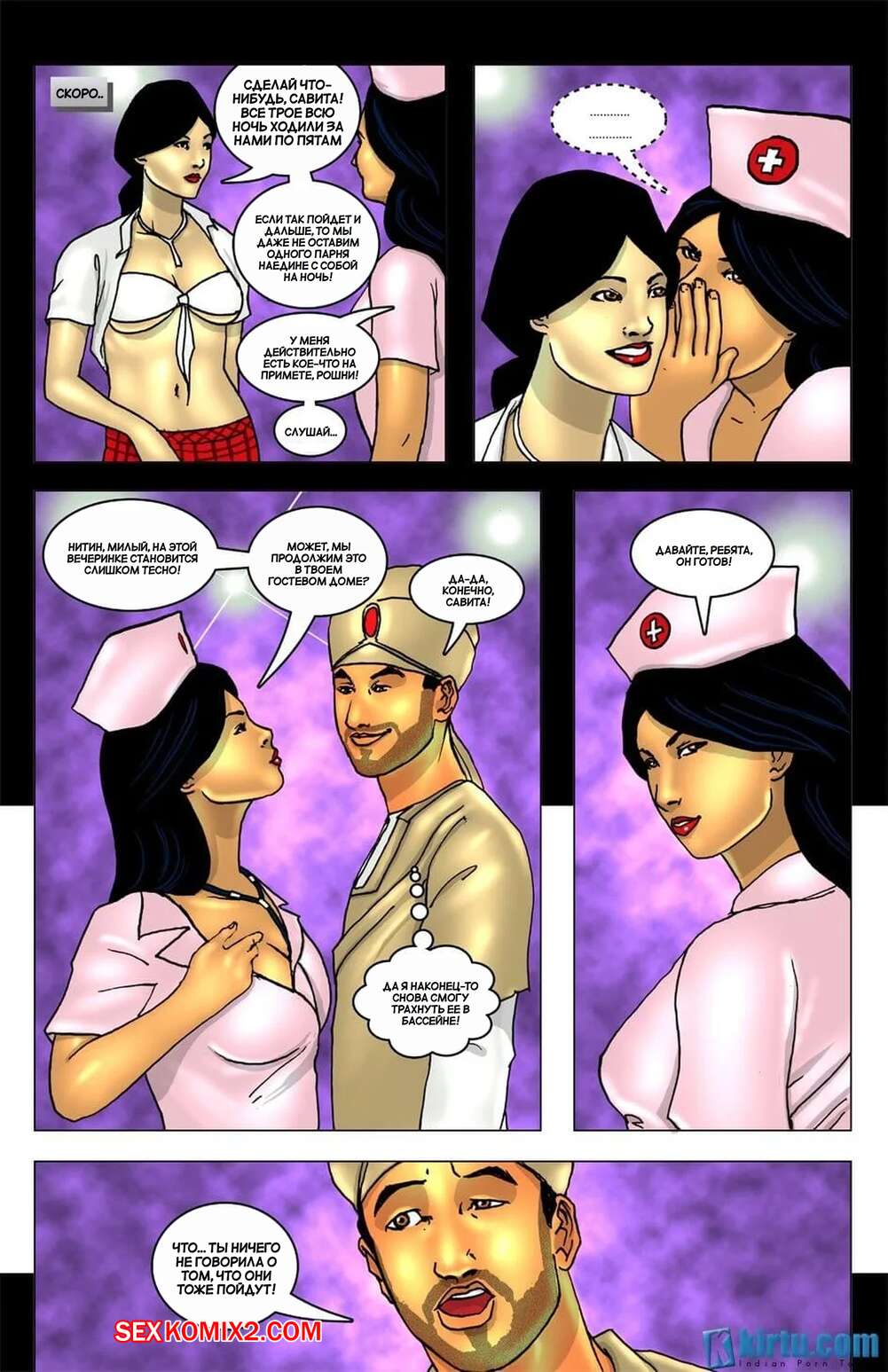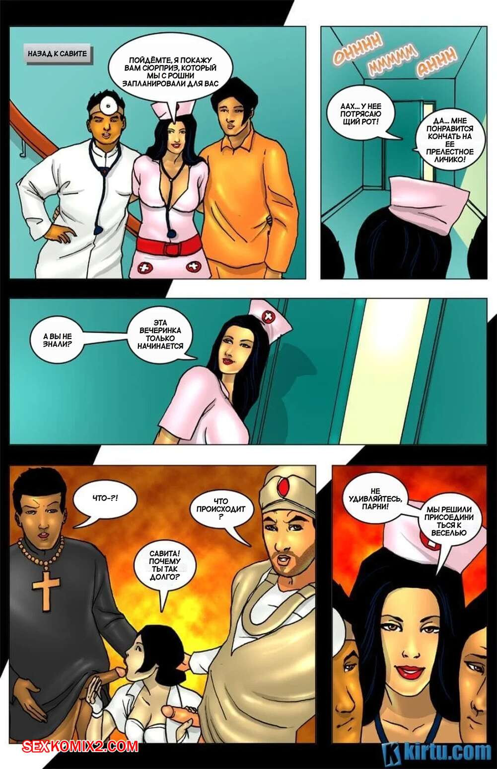 Порно комикс Савита Бхабхи в Гоа. Часть 4. Savita Bhabhi In Goa. Kirtu Горячая брюнетка милфа была очень возбуждена и решила повеселиться с двумя парнями. Девушка разделась и отсосала большие хуи парней, после чего дала им себя выебать во все дырочки.