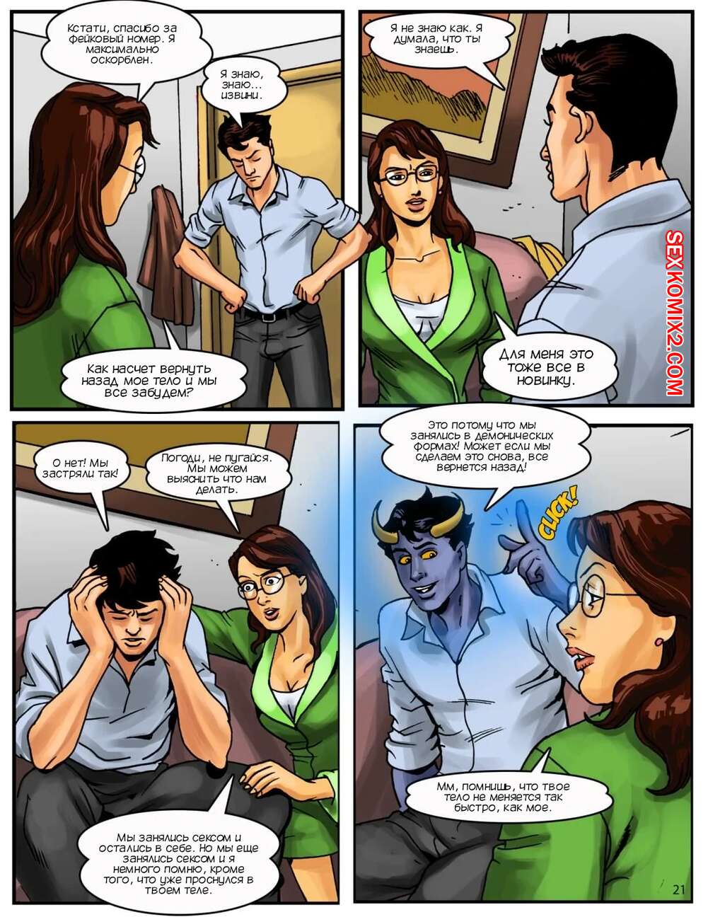 Порно комикс Вельзебаб. Часть 6. Beelzebabe. Kirtu Горячая красотка застряла в теле парня и ищет способ вернуть все на место. Ее подруга предложила ей потрахаться и стала сосать демонический член подруги, после чего дала ей себя выебать.