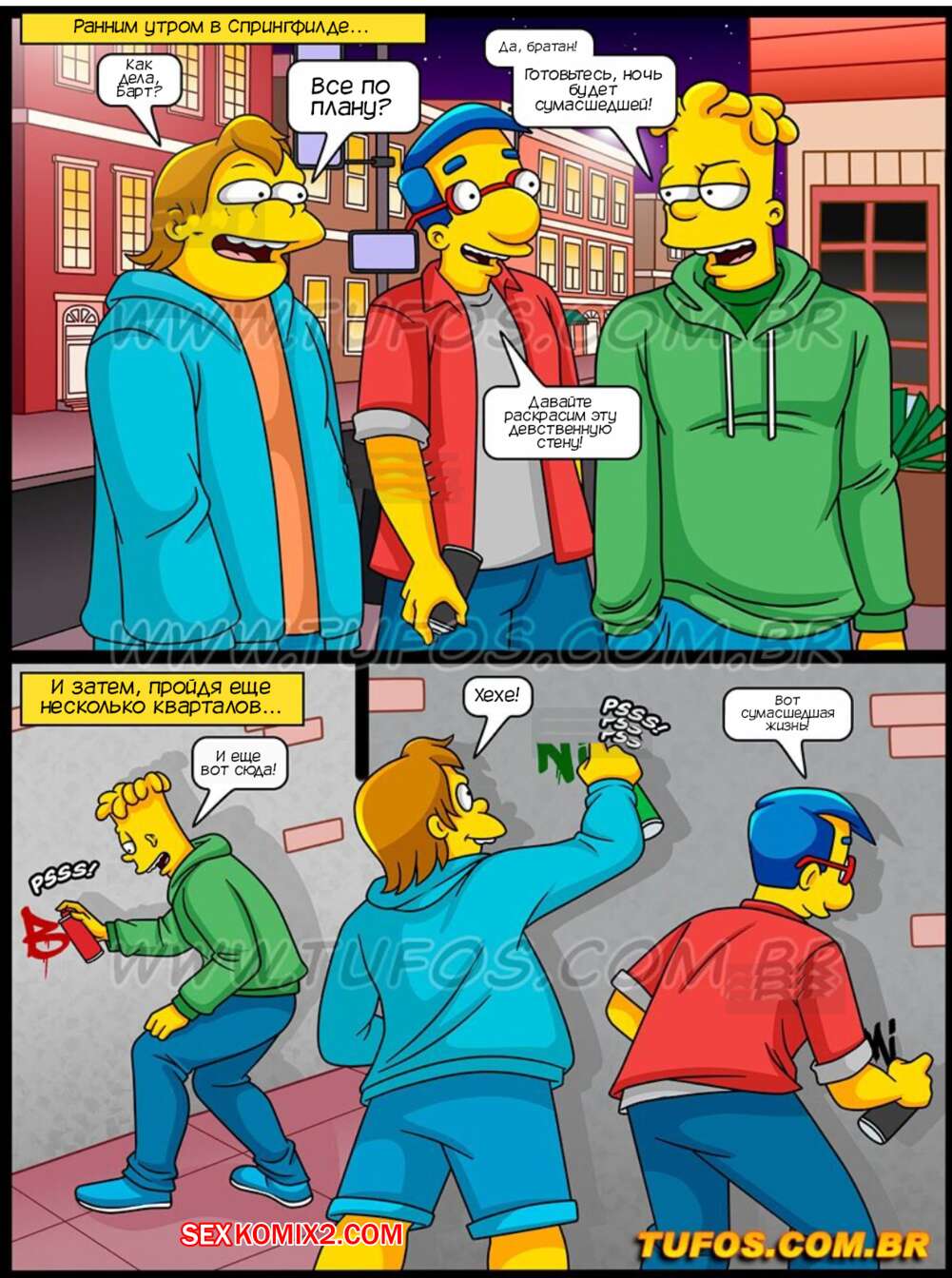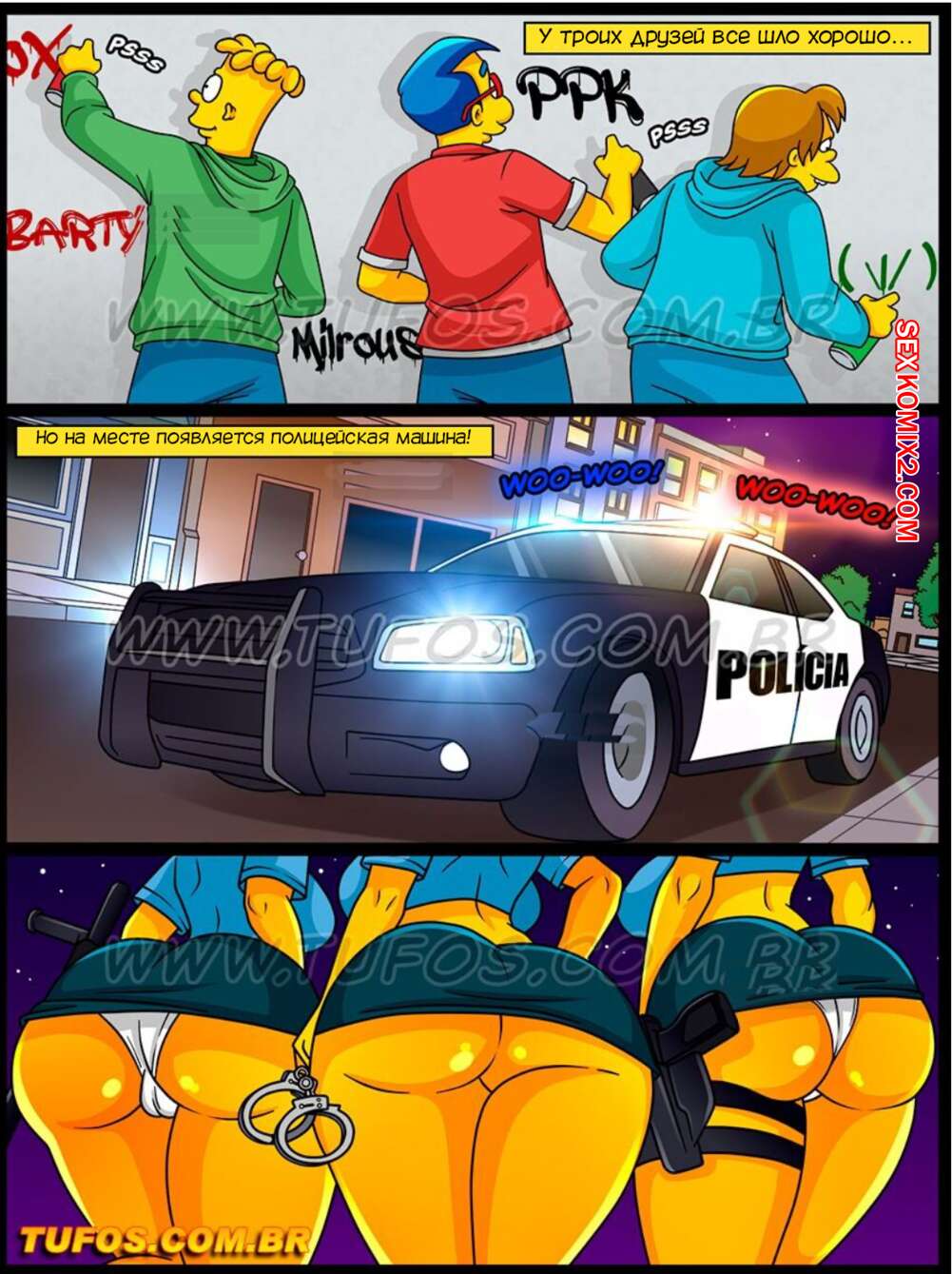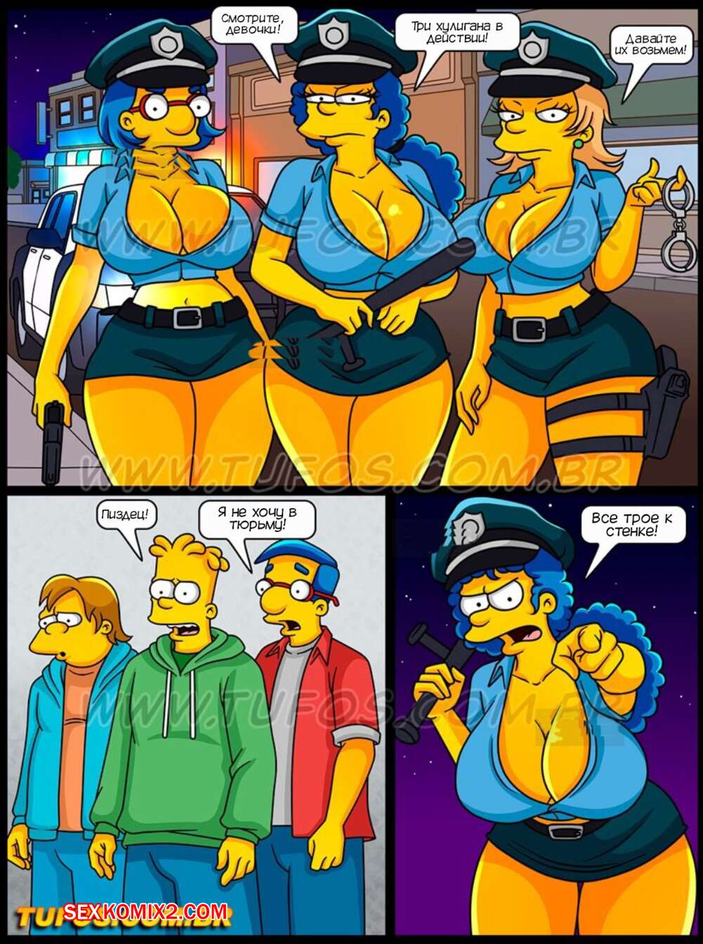 Порно комикс Симпсоны. Часть 61. Os Simptoons. Tufos Барт с друзьями разрисовывали стены на улице и их за этим делом поймали горячие милфы полицейские. Они устроили досмотр парней, после чего дали им себя выебать во все дырочки.