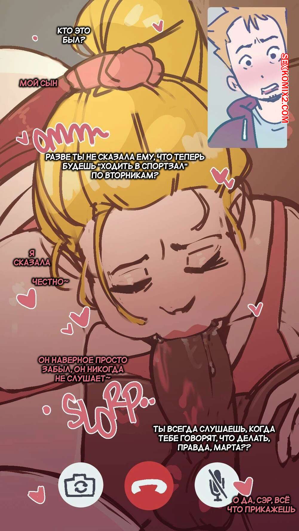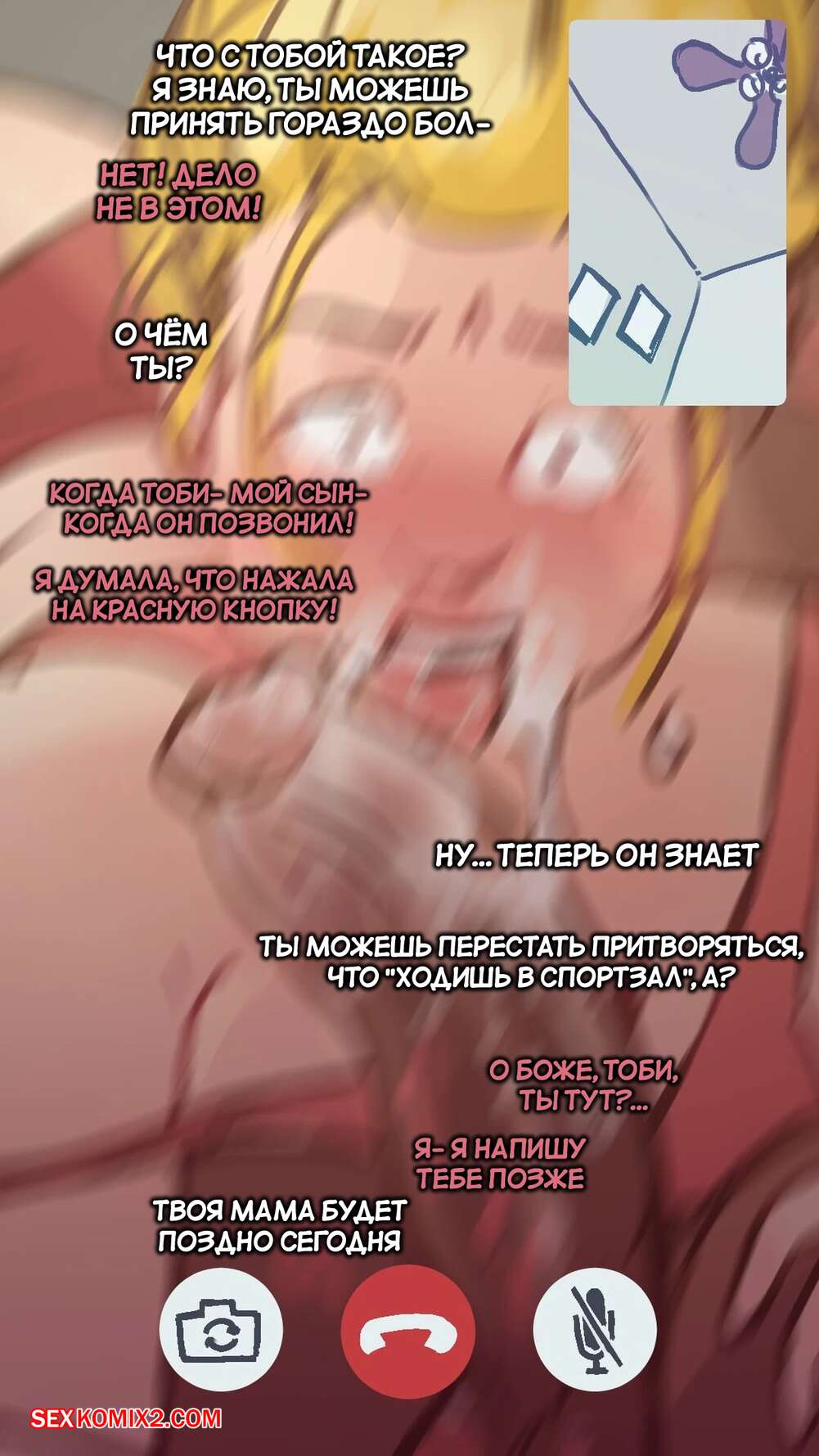 Порно комикс Мама из спортзала. The Gym Mom. NotEnoughMilk Сисястая блондинка милфа милфа отправилась в спортзал, где на нее положил глаз молодой парень. Он поставил красотку на колени и хорошенько трахнул ее ротик, позвонив в этот момент сыну девушки.