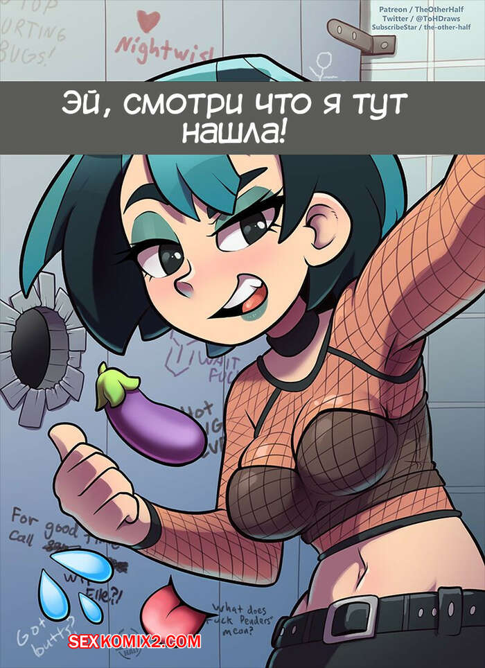 Порно комикс Total Drama Island. Гвен. Gwen. TheOtherHalf Горячая красотка Гвен нашла в туалете дыру и решила воспользоваться этим моментом. Девушка отсосала хуй парня через дырку, после чего дала ему себя хорошенько выебать.