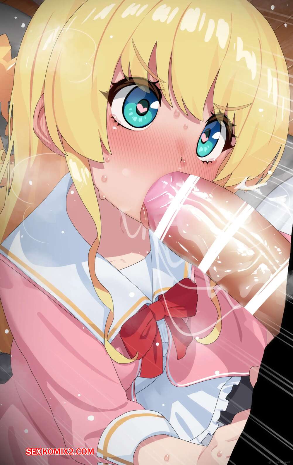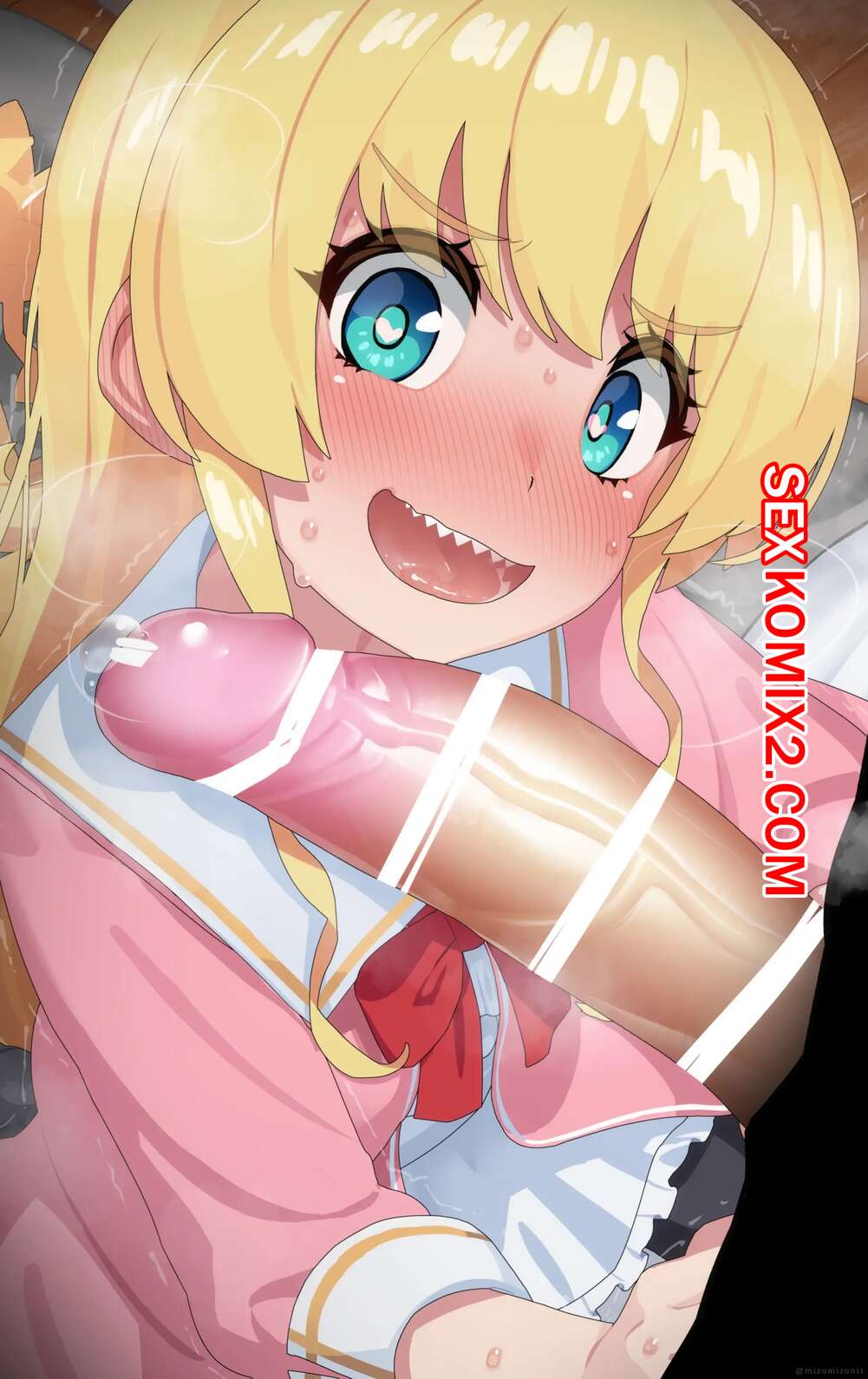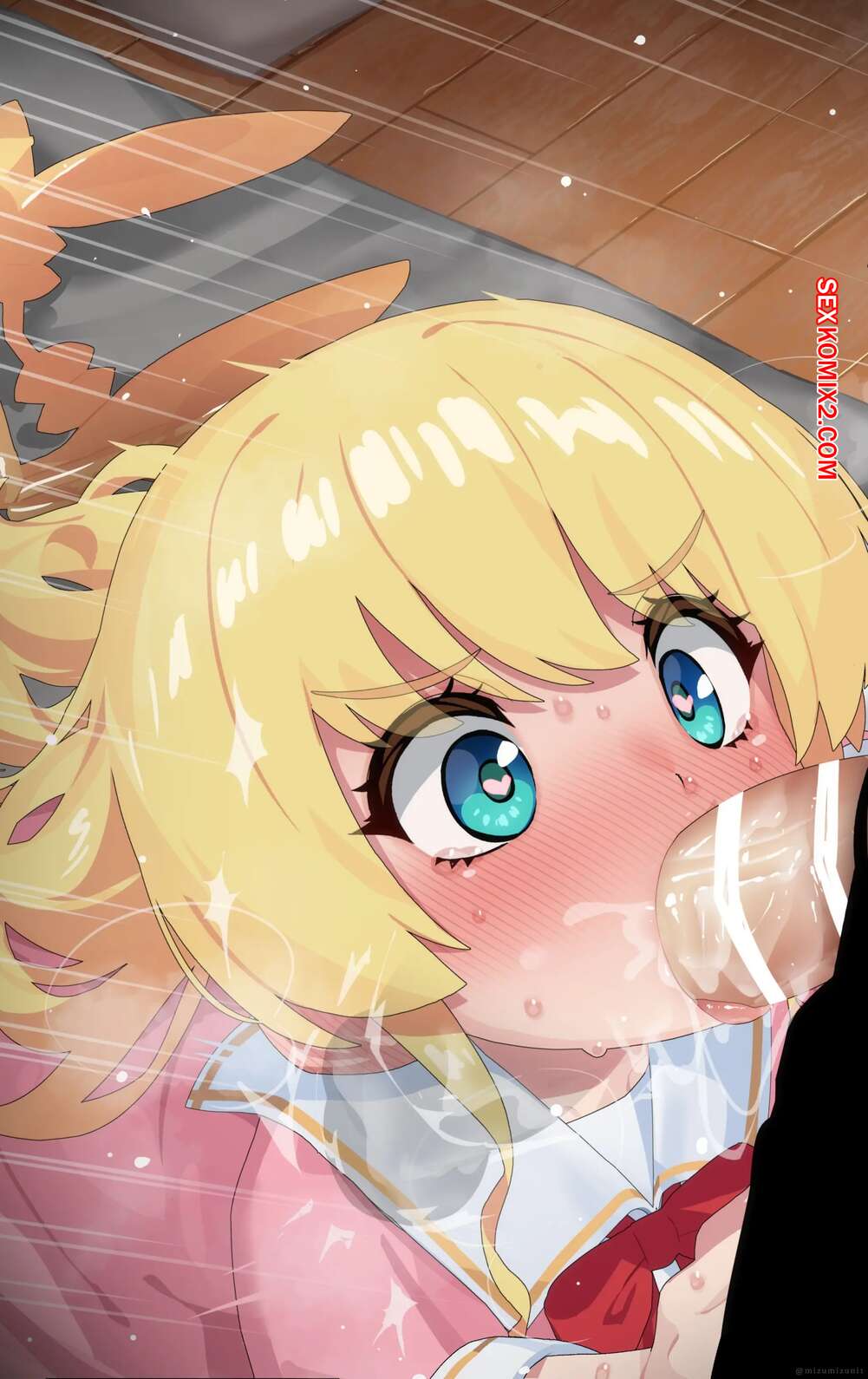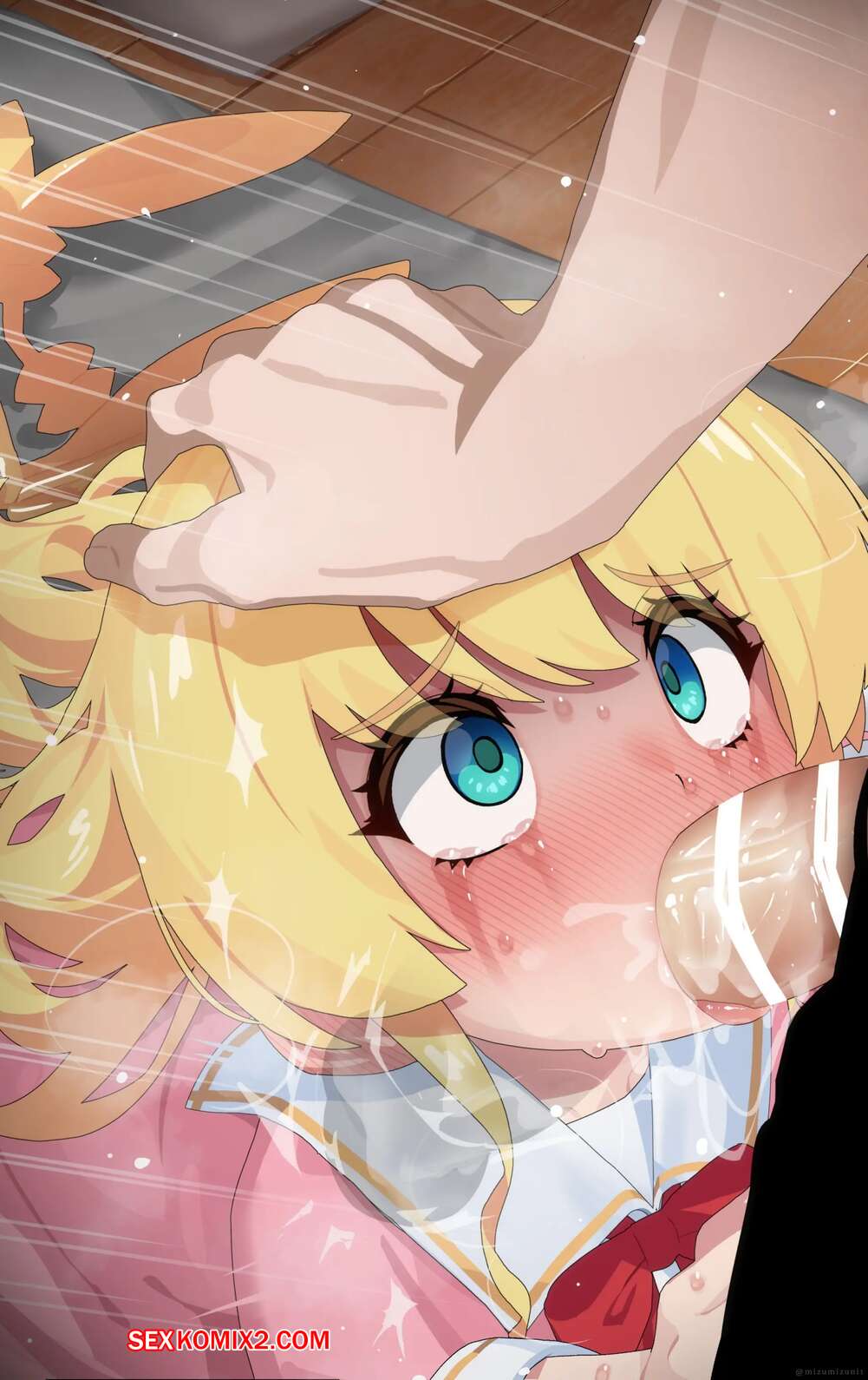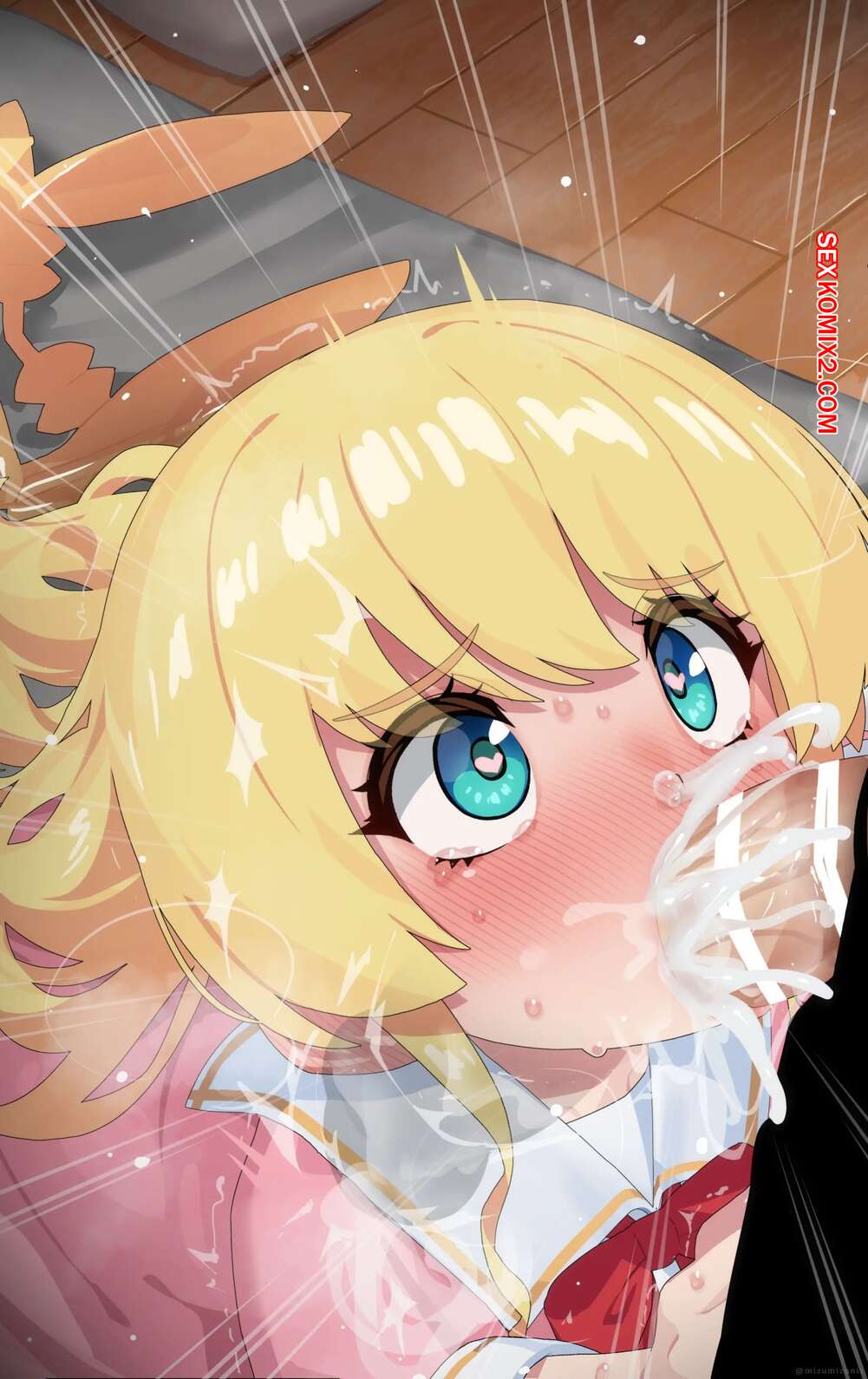 Порно комикс Тачибана Хината. Mizumizuni Горячая блондинка была очень возбуждена и решила повеселиться со своим дружком. Она встала на колени и стала сосать большой хуй парня, после чего дала ему кончить себе в ротик.