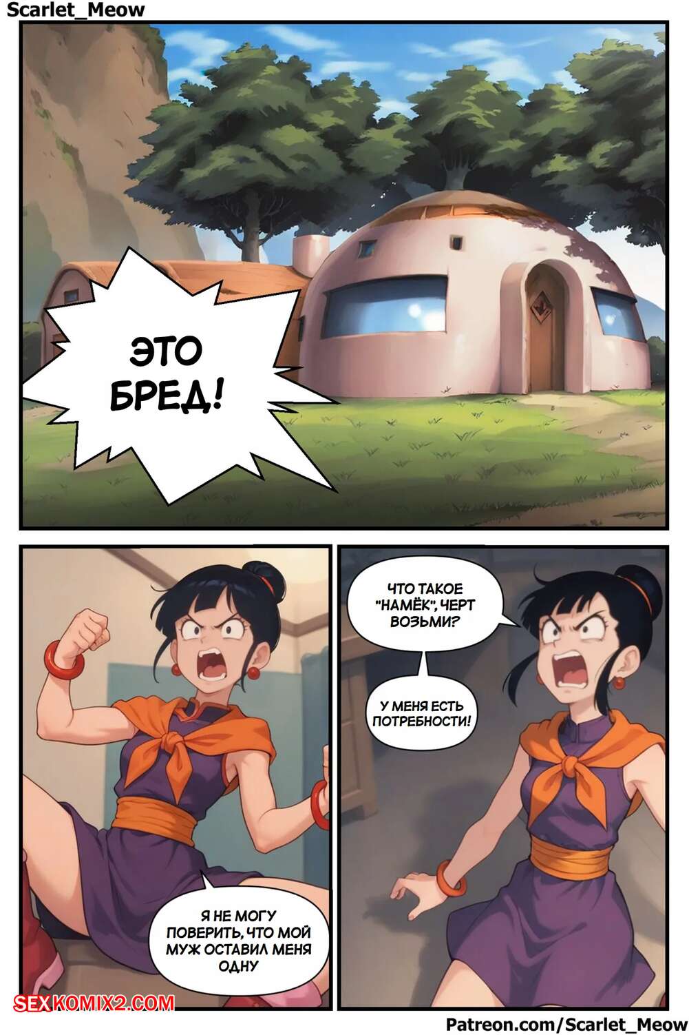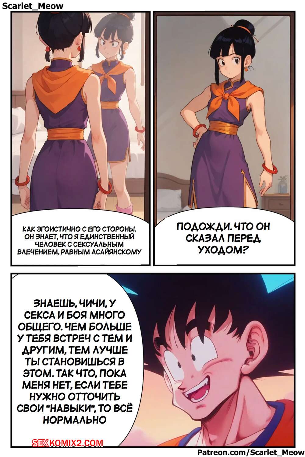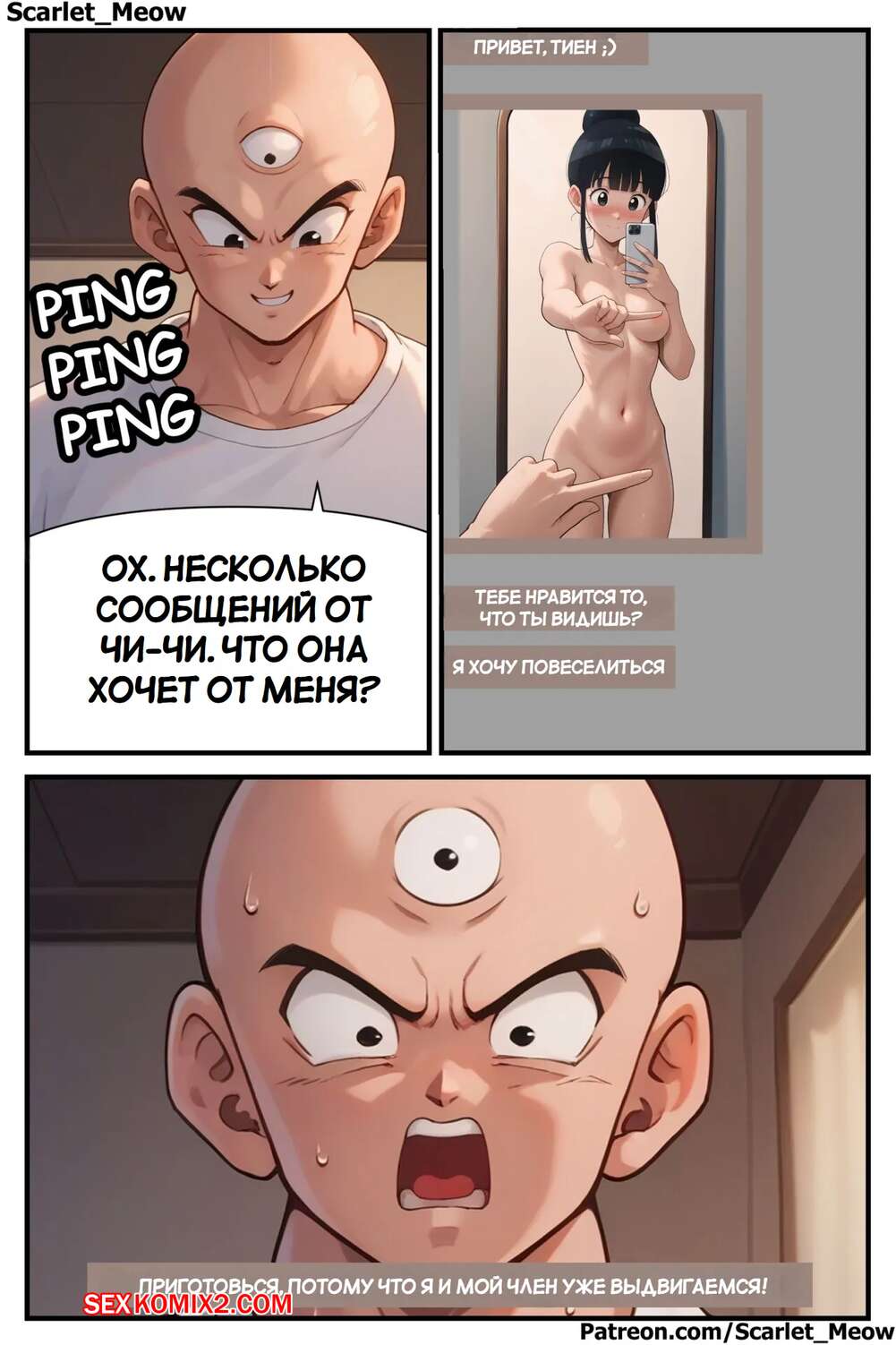 Порно комикс Dragon Ball. Соблазнение Тиен. Tempting Tien. Scarlet Meow. Муж Чичи оставил девушку одну дома с огромной жаждой секса. Красотка решила проучить своего мужа и стала отправляться сексуальные снимки своему дружку, соблазняя его на еблю.