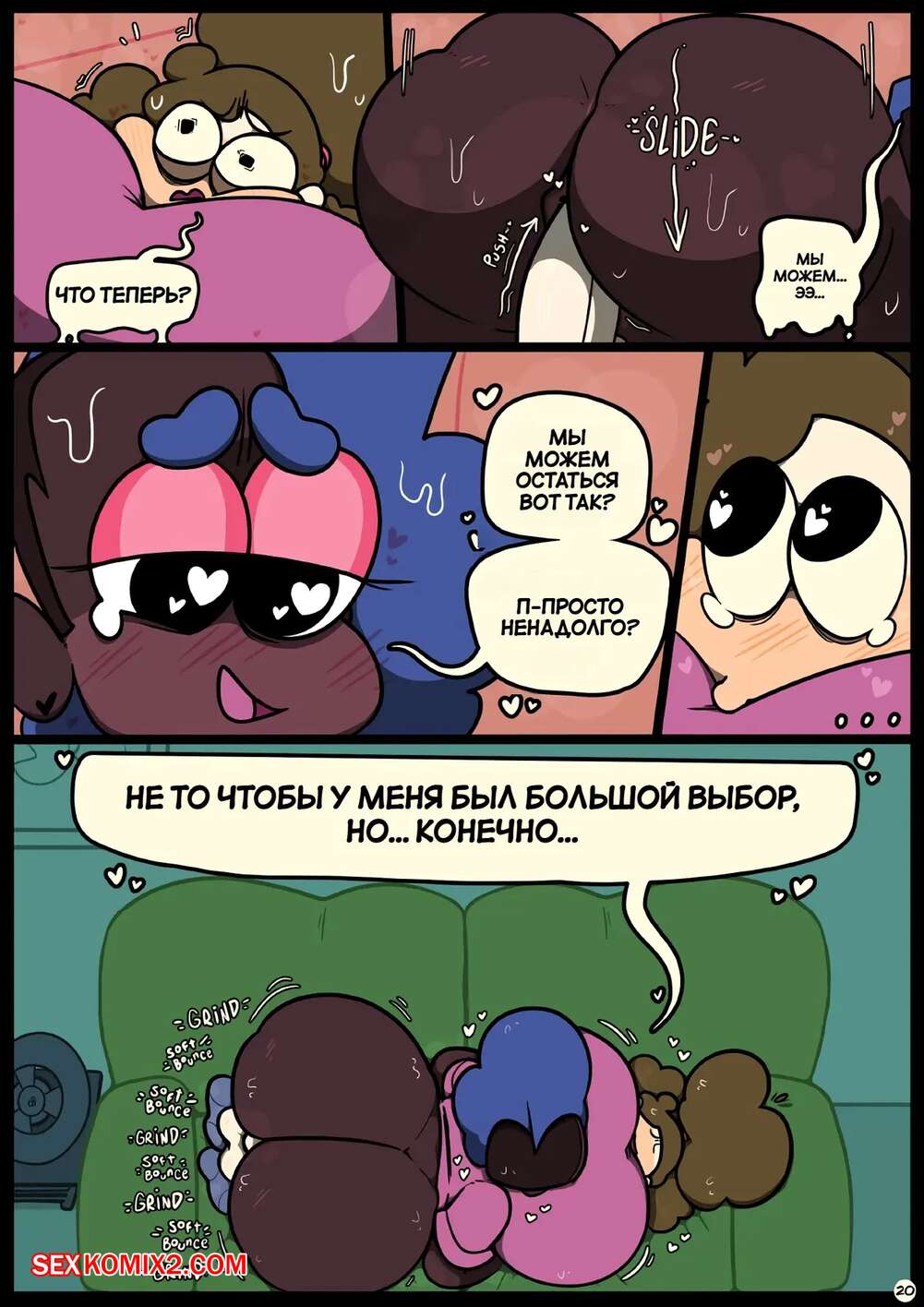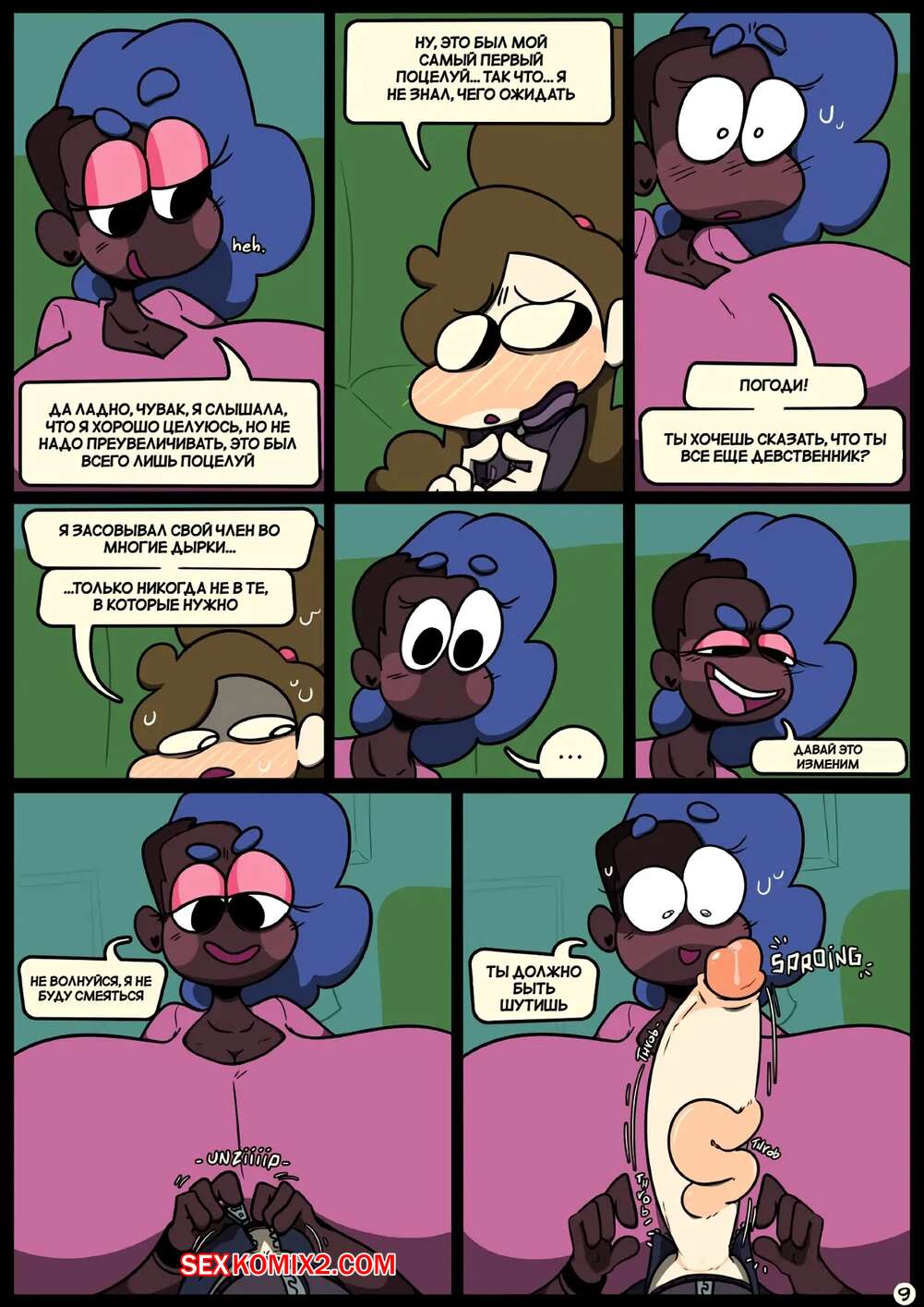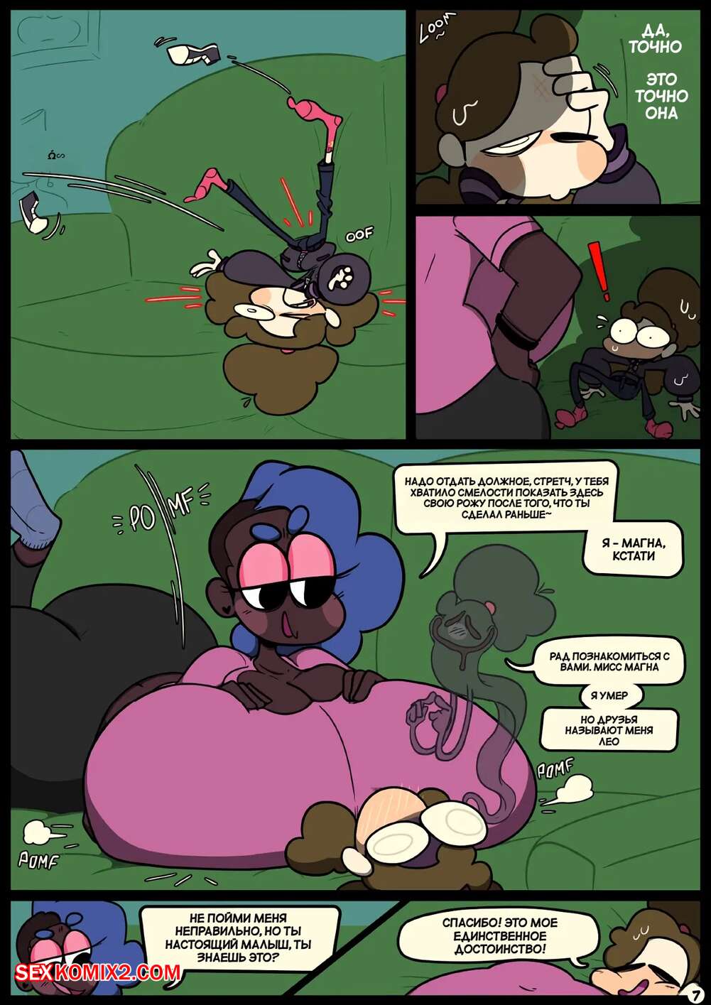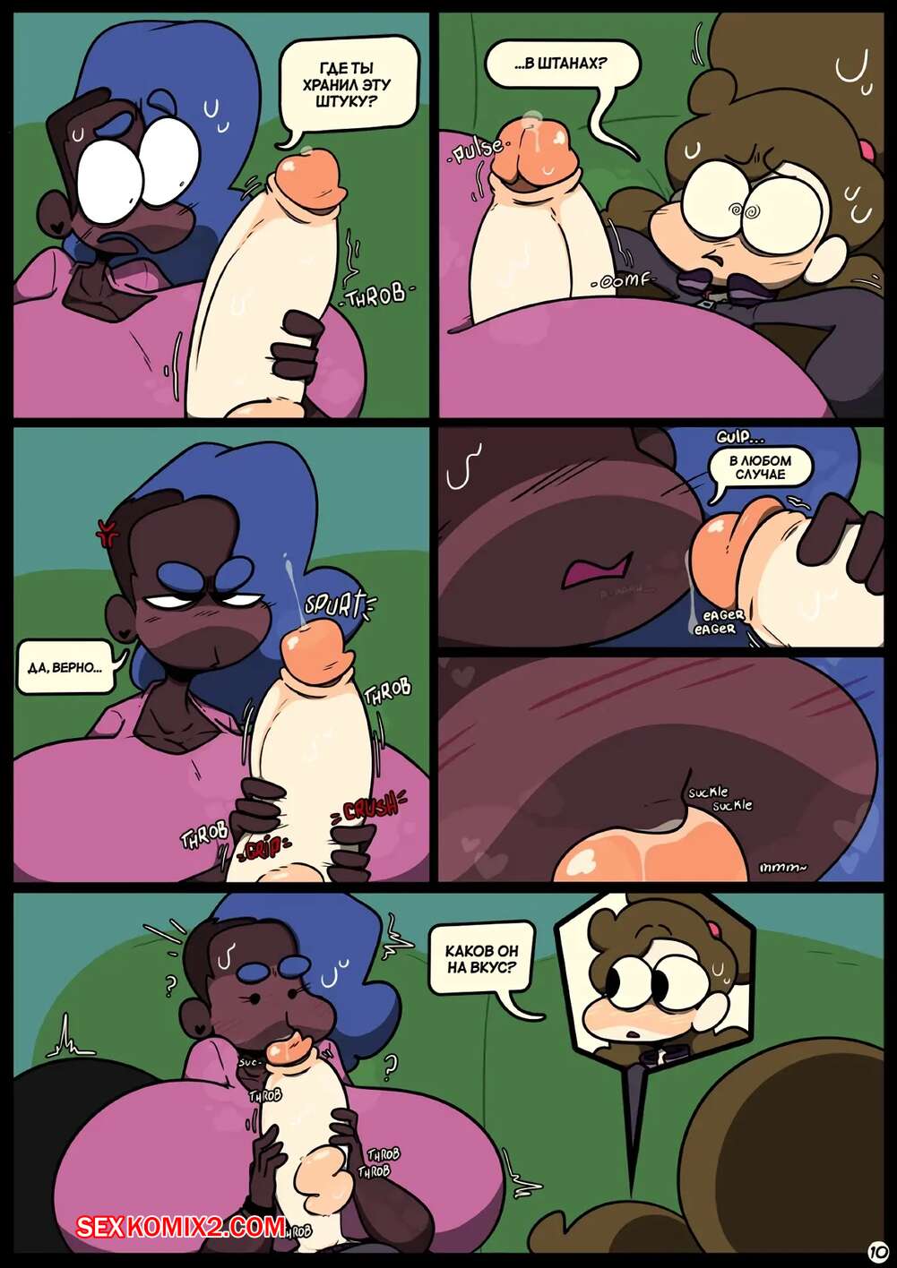 Порно комикс Фарс вместе с незнакомцами в ночи. Slapstick together strangers in the night Темнокожая брюнетка с огромными формами была очень возбуждена и хотела трахаться. Она уложила девушку с большим хуем на диван и стала скакать на ее хуй, получая огромное удовольствие.