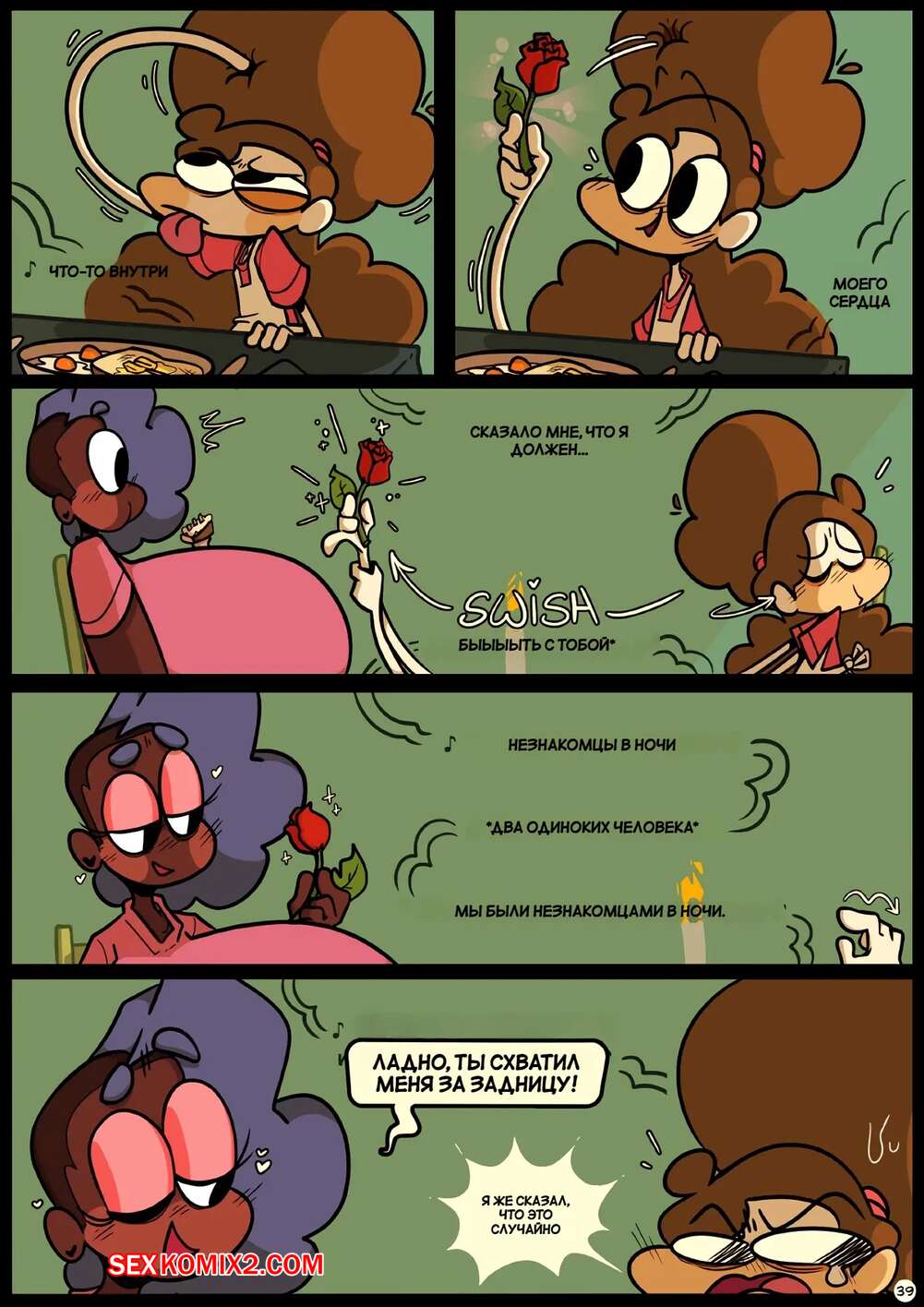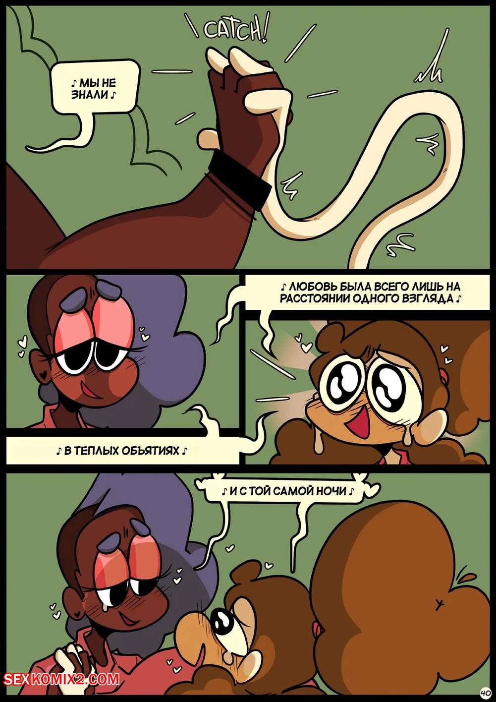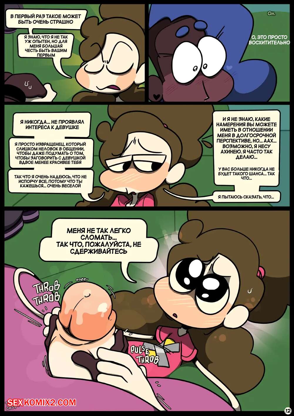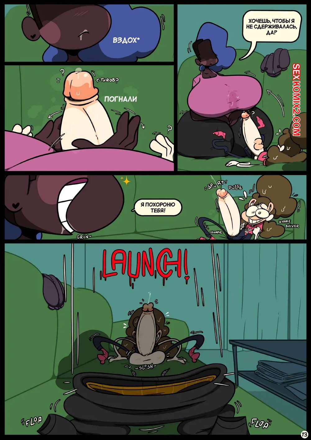 Порно комикс Фарс вместе с незнакомцами в ночи. Slapstick together strangers in the night Темнокожая брюнетка с огромными формами была очень возбуждена и хотела трахаться. Она уложила девушку с большим хуем на диван и стала скакать на ее хуй, получая огромное удовольствие.