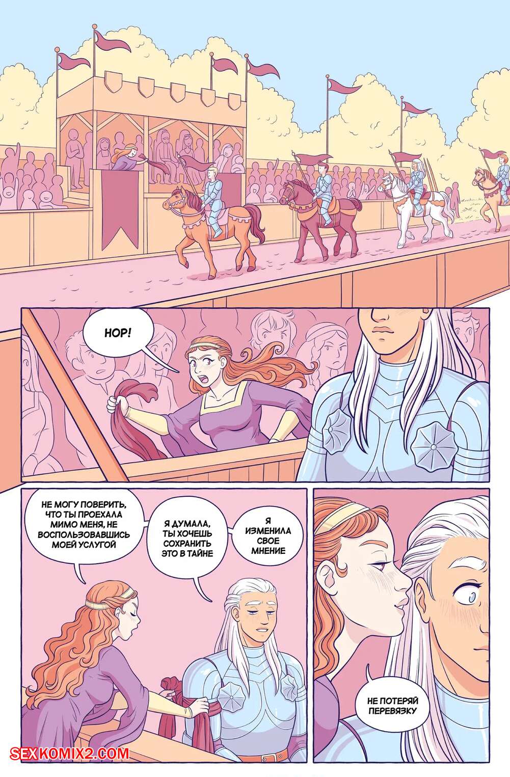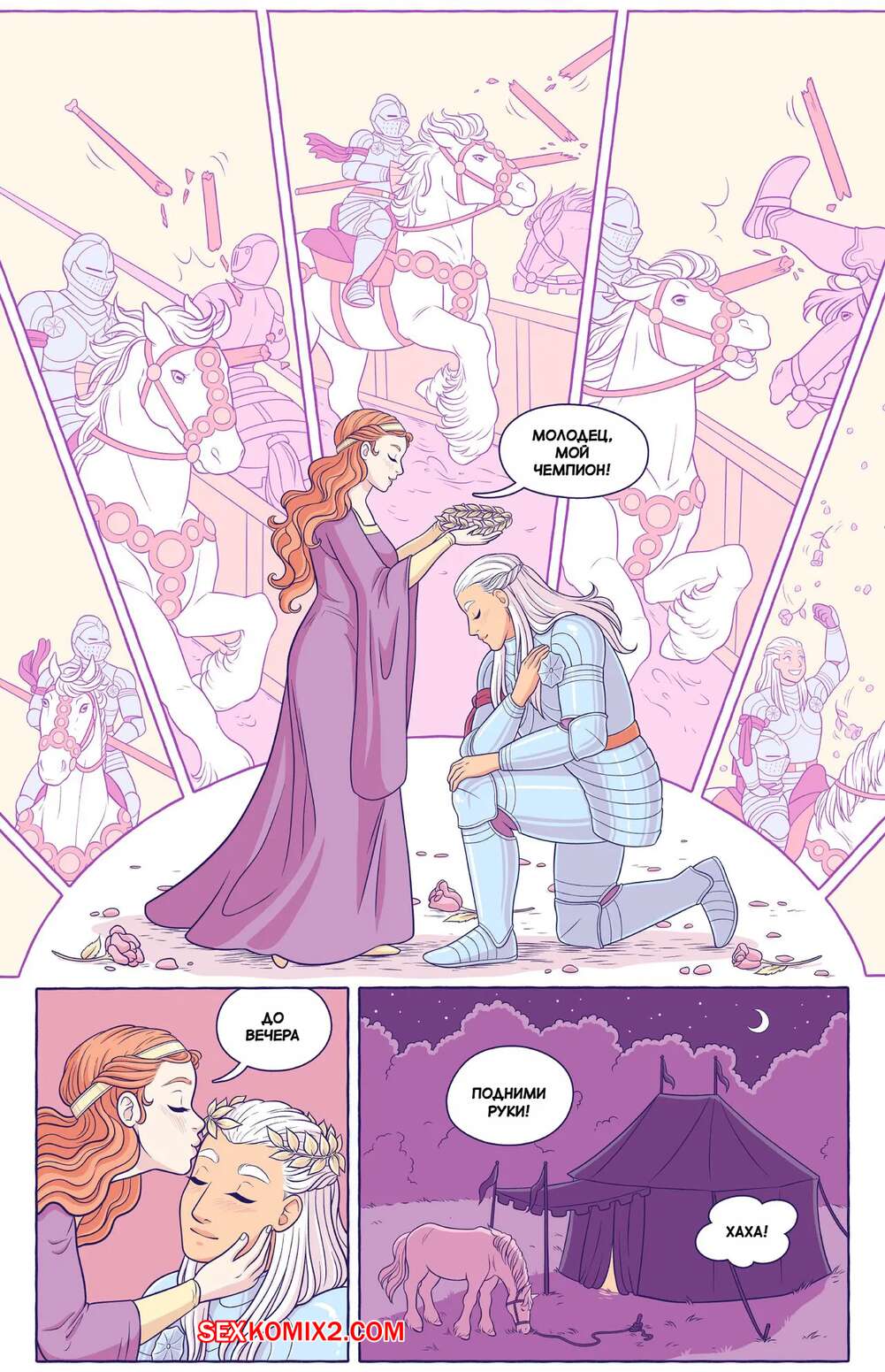 Порно комикс Турнир. The Joust. Oh Joy Sex Toy. Ray Starshine. Две девушки решили отпраздновать победу в турнире блондиночки рыцаря. Ночью девушки уединились в палатке и стали ласкать друг дружку, после чего занялись лесбийской еблей с использованием страпона.